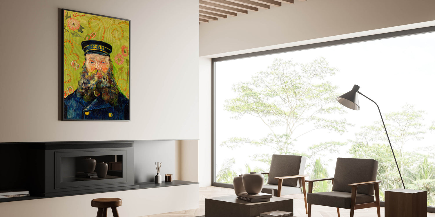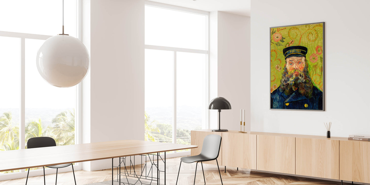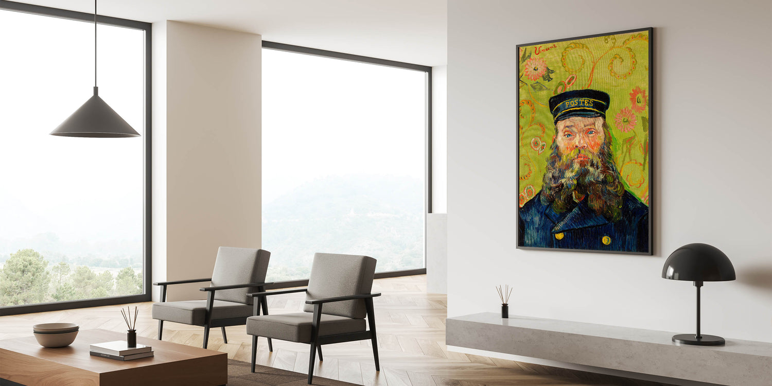 Celebrate the brilliance of Impressionist portraiture with Vincent van Gogh's "The Postman (Joseph Roulin)" (1888). This iconic artwork features Joseph Roulin, a close friend of Van Gogh, depicted with vibrant brushstrokes, a striking green floral background, and vivid, expressive details. The bold use of color and texture creates a captivating composition that is both personal and timeless, making it an ideal addition to your art collection.