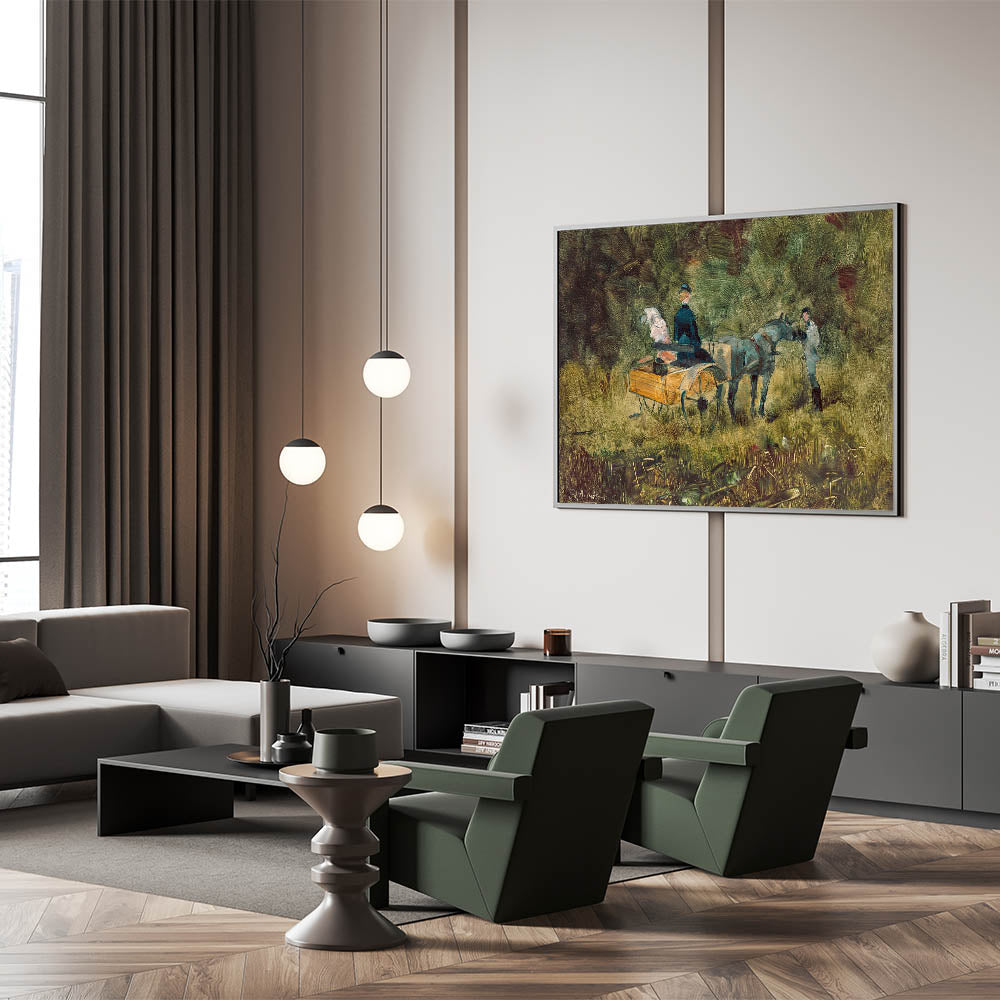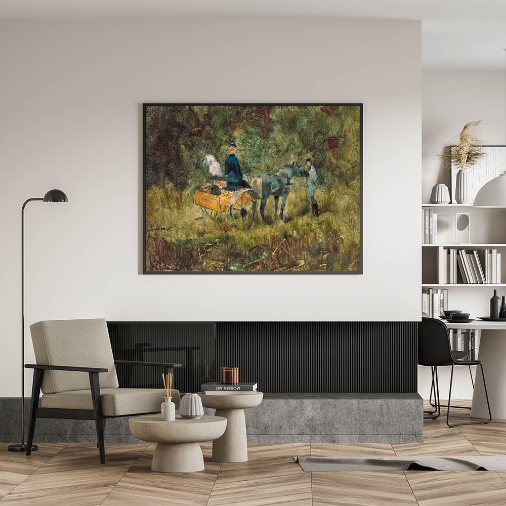 Experience the rustic charm of Henri de Toulouse-Lautrec’s "The Trap," a captivating artwork created in 1880. This unique painting depicts a countryside scene featuring a horse-drawn cart and its riders amidst a richly textured landscape. Lautrec’s masterful use of earthy tones and expressive brushstrokes creates an immersive composition that invites the viewer to explore the tranquil beauty of rural life.