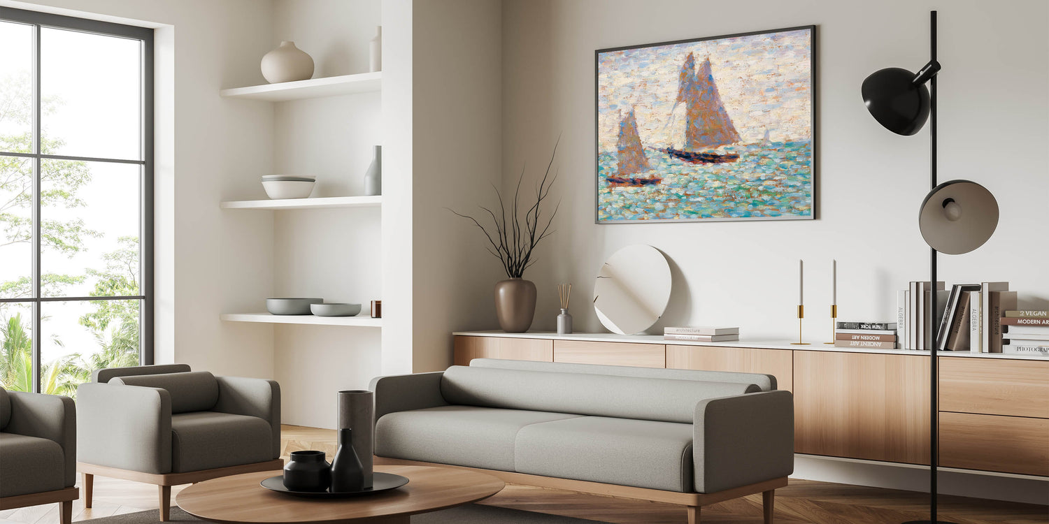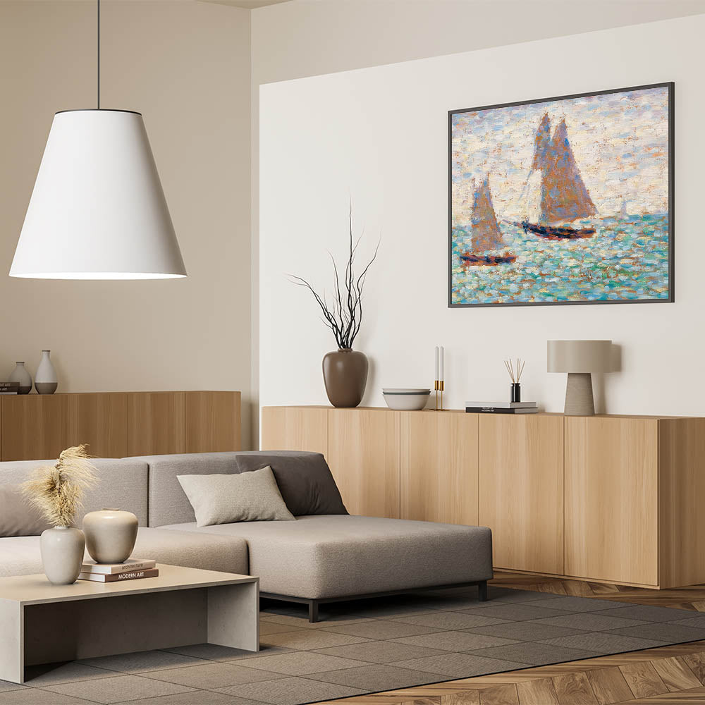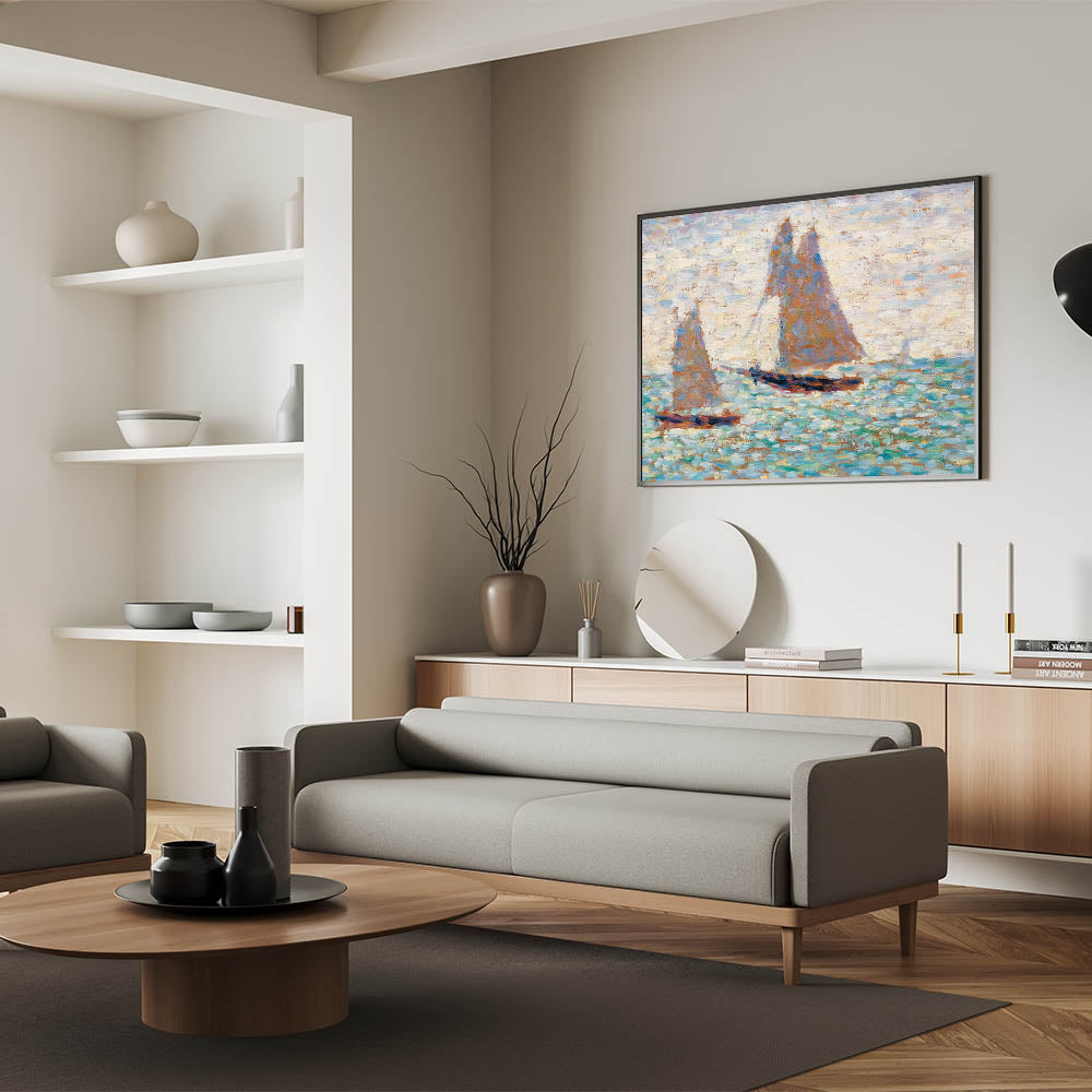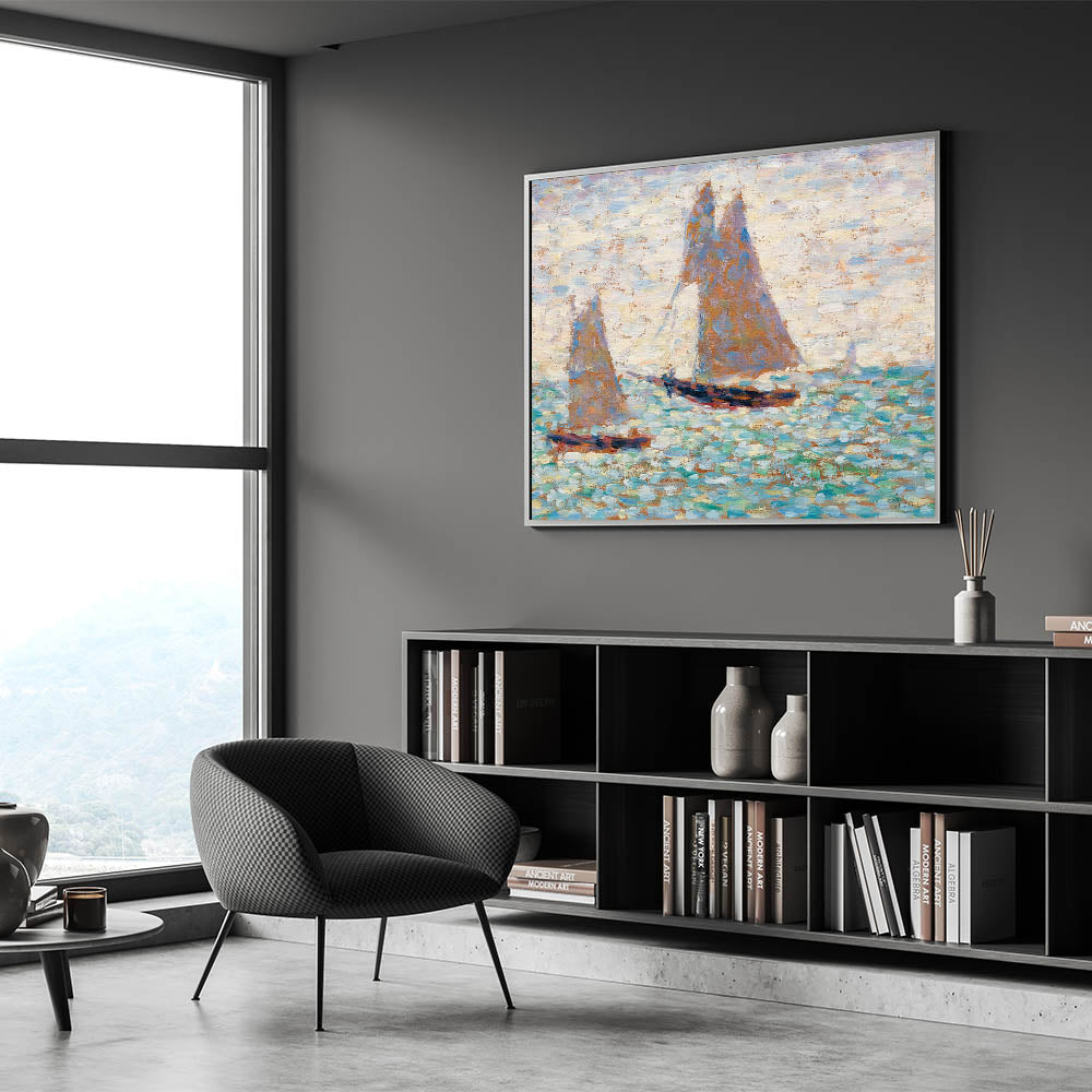 Capture the serene beauty of the sea with Georges Seurat's masterpiece, "Two Sailboats at Grandcamp." This artwork, crafted in the iconic Impressionist style, depicts a tranquil ocean scene with sailboats gracefully gliding across the water. Seurat's meticulous use of color and texture creates a captivating play of light, evoking the calm and timeless allure of coastal life.