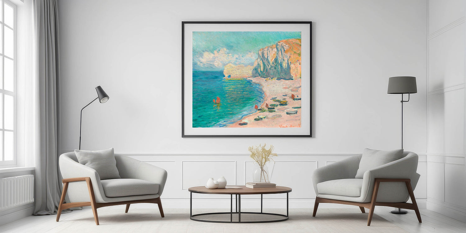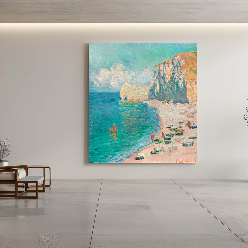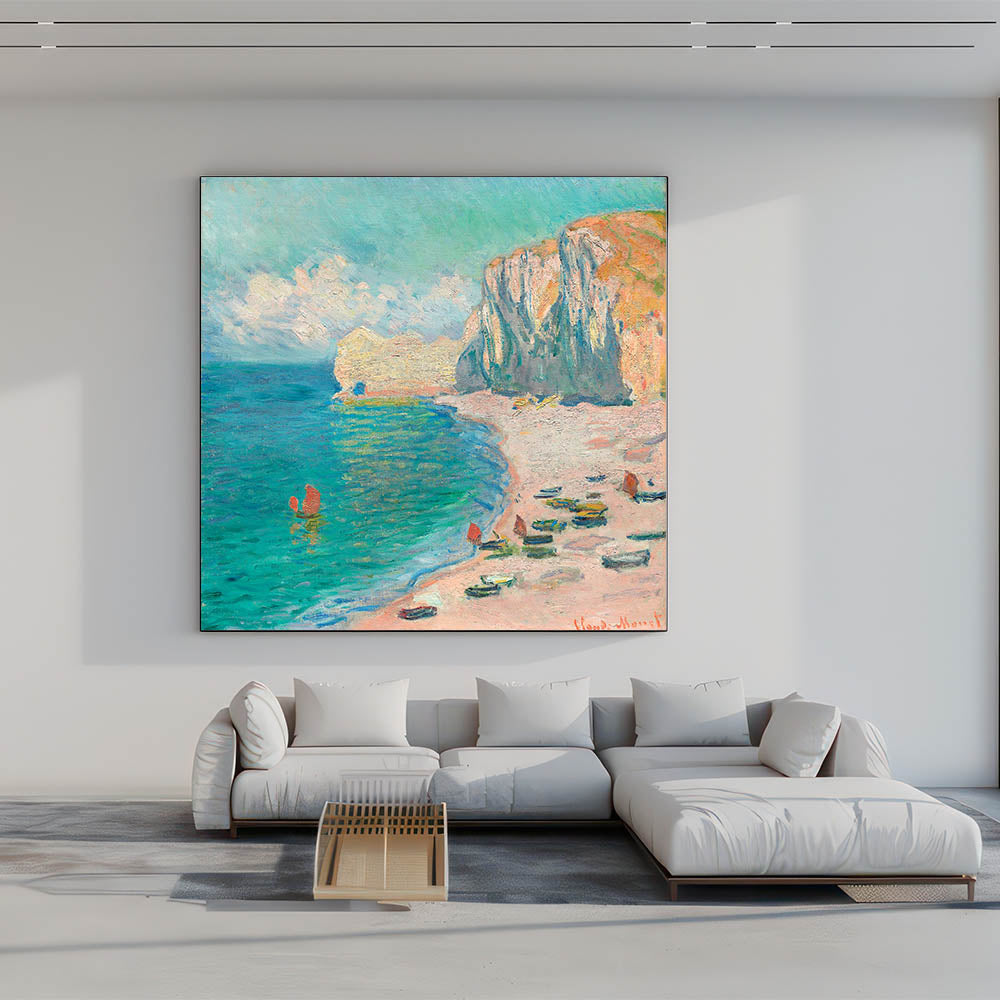 Experience the serene beauty of the French coastline with this exquisite Impressionist wall art by Claude Monet. Depicting a tranquil beach scene with vibrant turquoise waters and dramatic cliffs, this painting showcases Monet's mastery of light and color. Perfect for coastal-inspired interiors or art collections, this timeless piece will add sophistication and calm to any space.