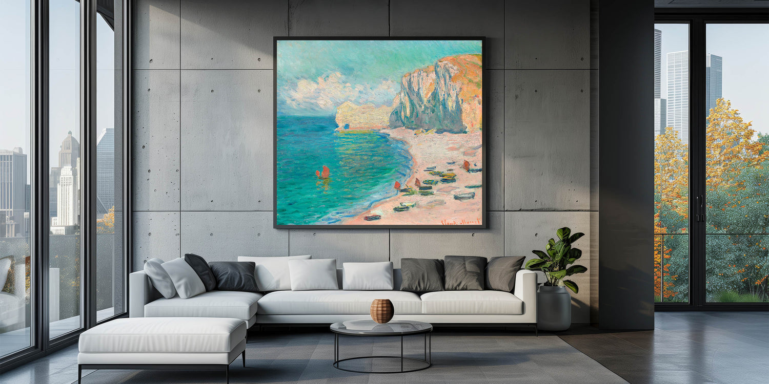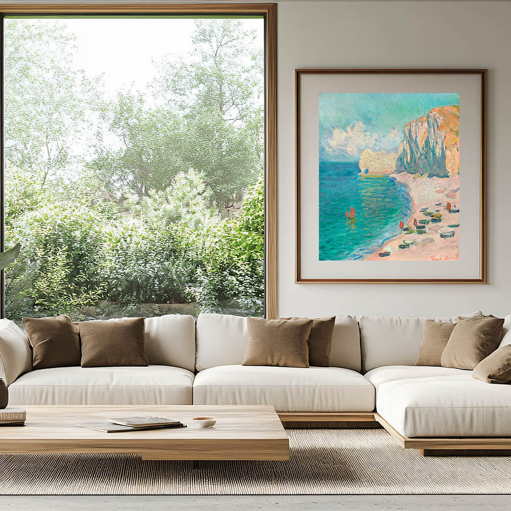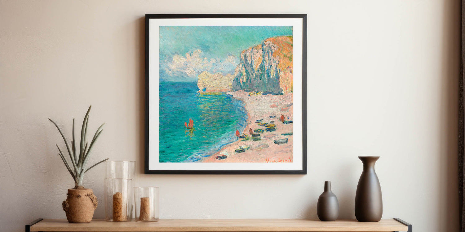 Experience the serene beauty of the French coastline with this exquisite Impressionist wall art by Claude Monet. Depicting a tranquil beach scene with vibrant turquoise waters and dramatic cliffs, this painting showcases Monet's mastery of light and color. Perfect for coastal-inspired interiors or art collections, this timeless piece will add sophistication and calm to any space.