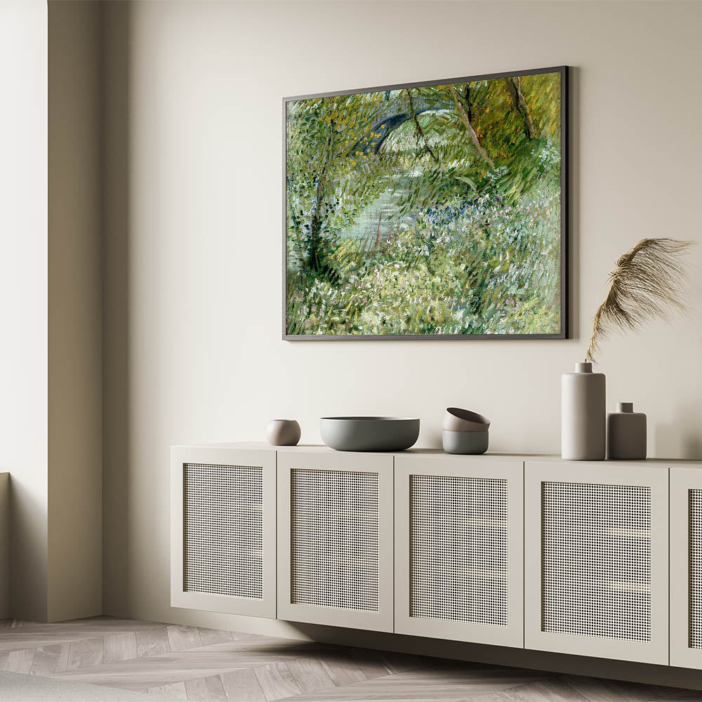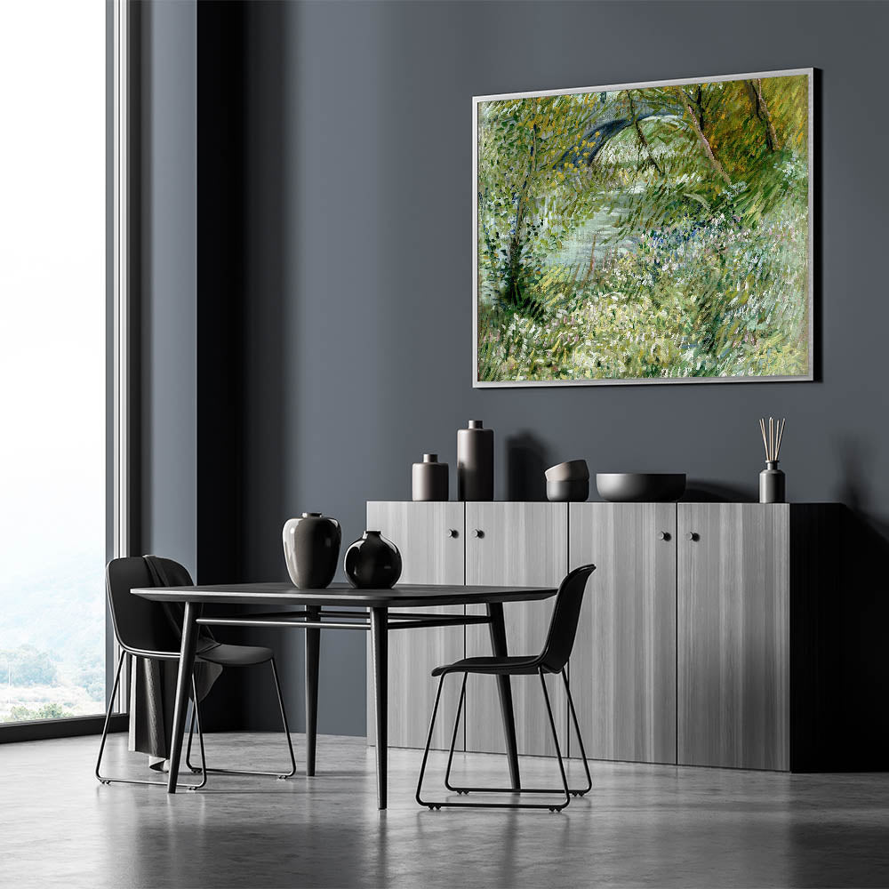 Celebrate the beauty of spring with this enchanting Impressionist wall art inspired by Vincent van Gogh's "River Bank in Springtime" (1887). This serene masterpiece captures the lush greenery and blooming wildflowers of a tranquil riverside scene, showcasing Van Gogh's signature brushstrokes and vibrant Impressionist style.
