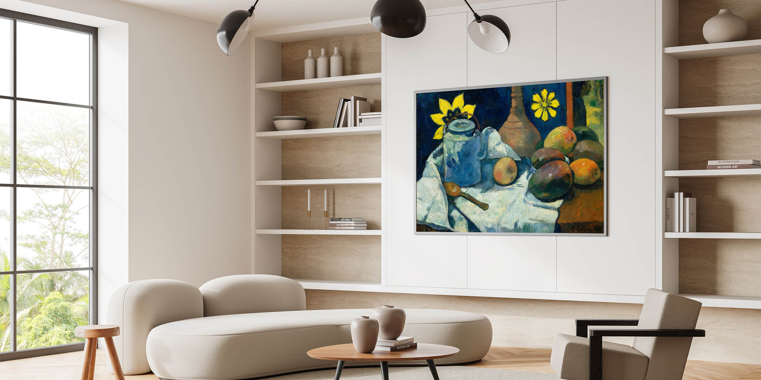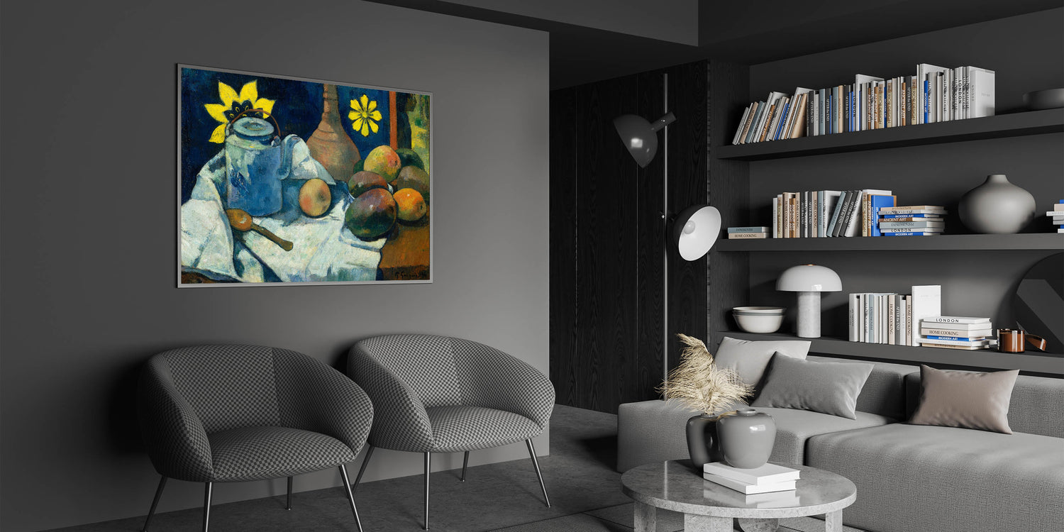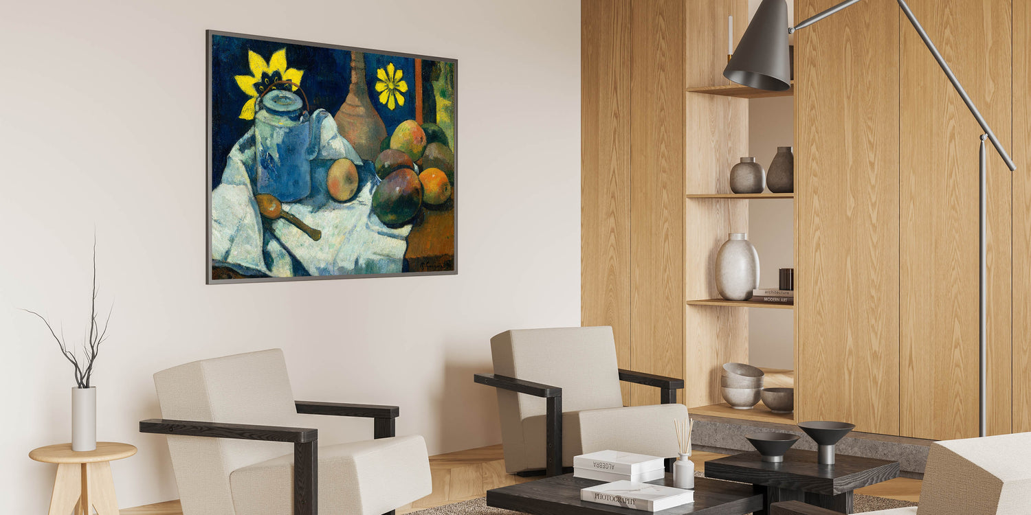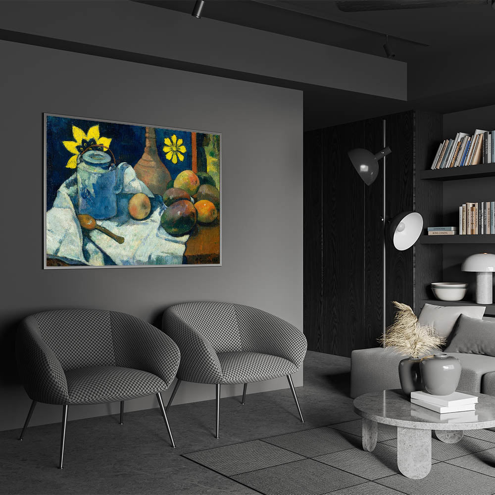 - Design: A vibrant still life with a teapot, fruit, and flowers, showcasing Gauguin’s expressive Impressionist style.