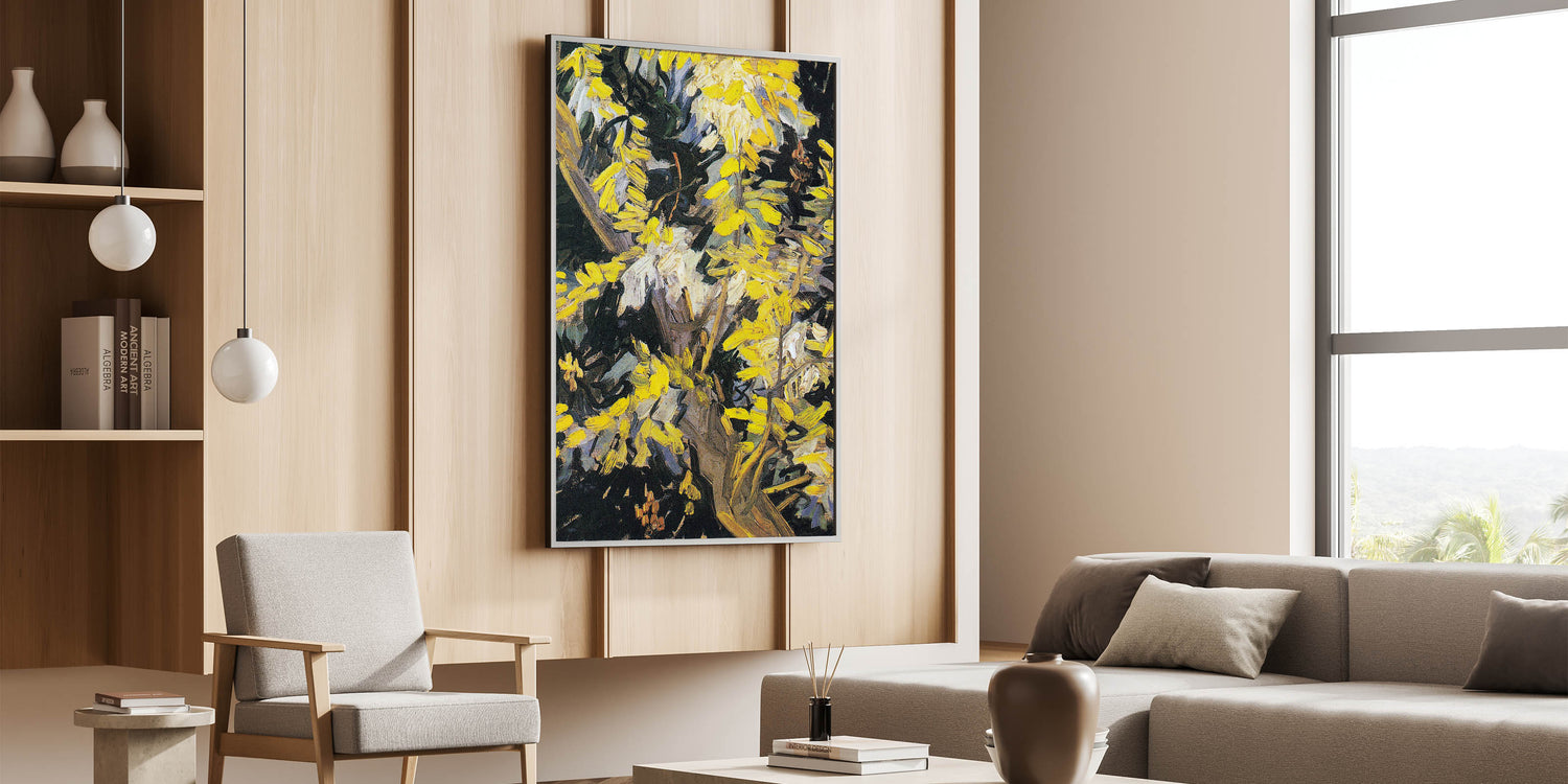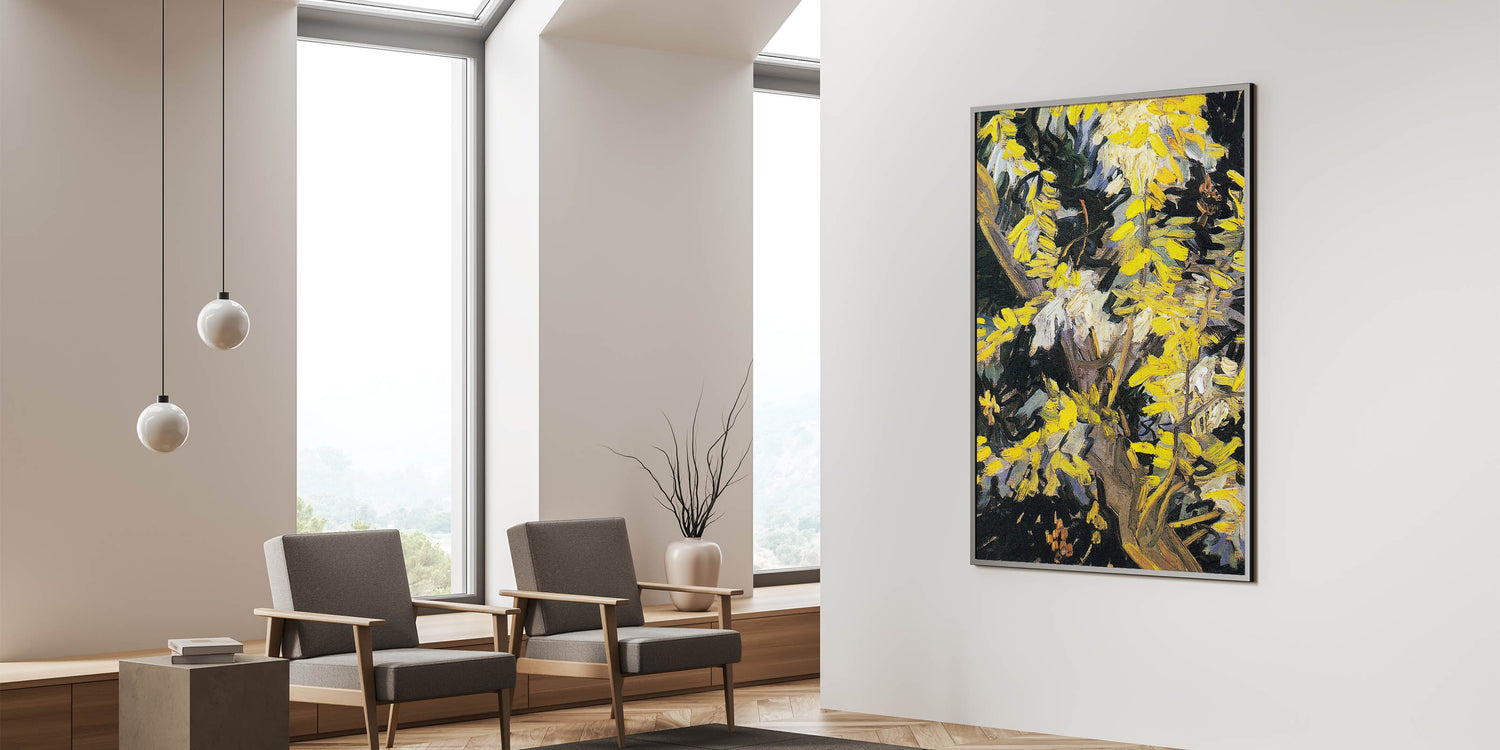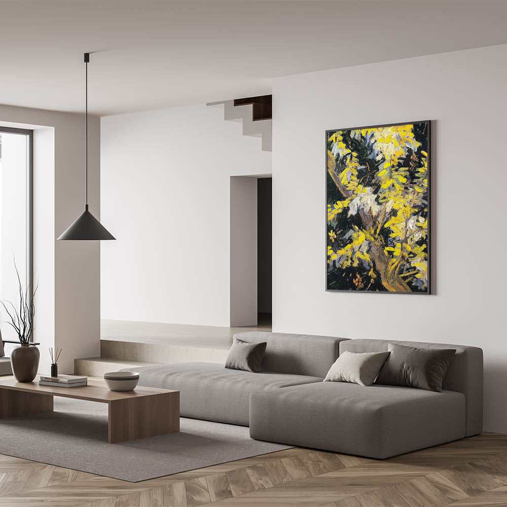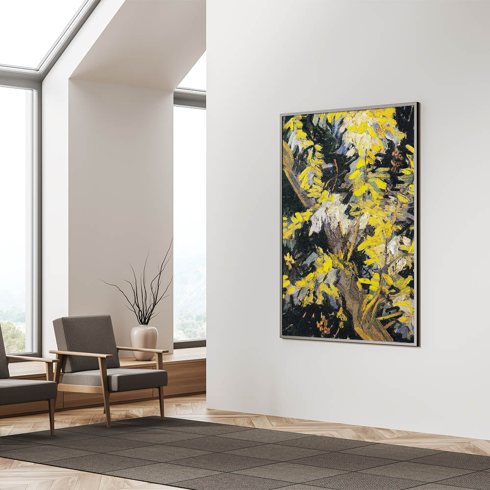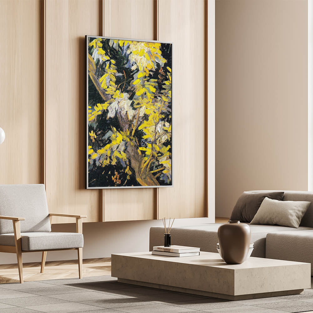 Celebrate the beauty of nature with "Blossoming Acacia Branches" (1890) by Vincent van Gogh. This intricate piece showcases Van Gogh’s skillful brushstrokes and a vivid palette of yellows, whites, and dark greens. The dynamic composition captures the delicate movement of acacia branches in bloom, evoking a sense of life and renewal. Perfect for adding warmth and sophistication to any living room, dining space, or bedroom.