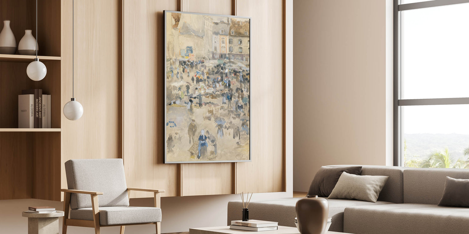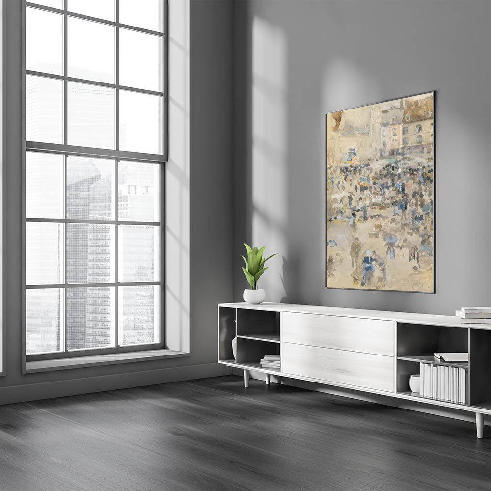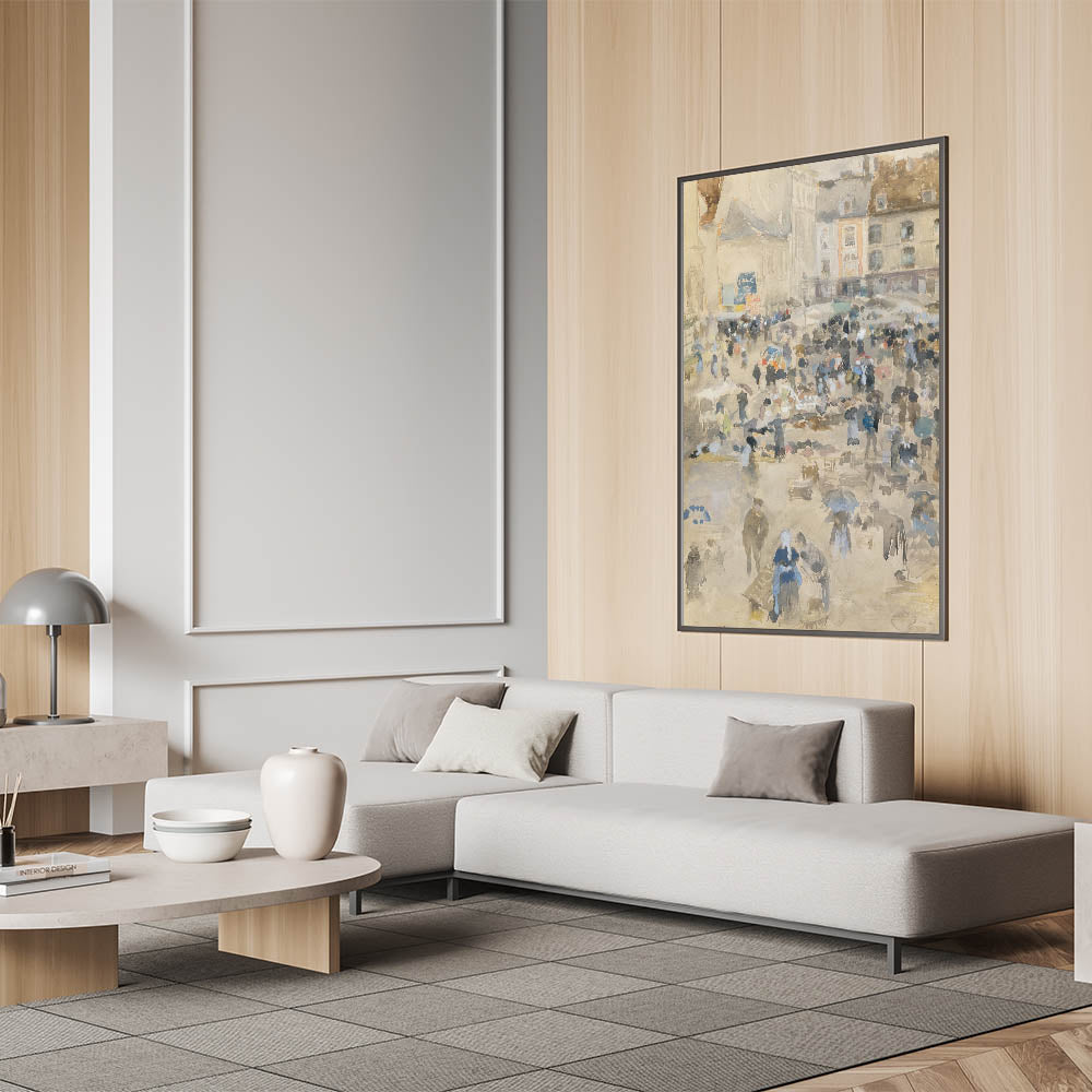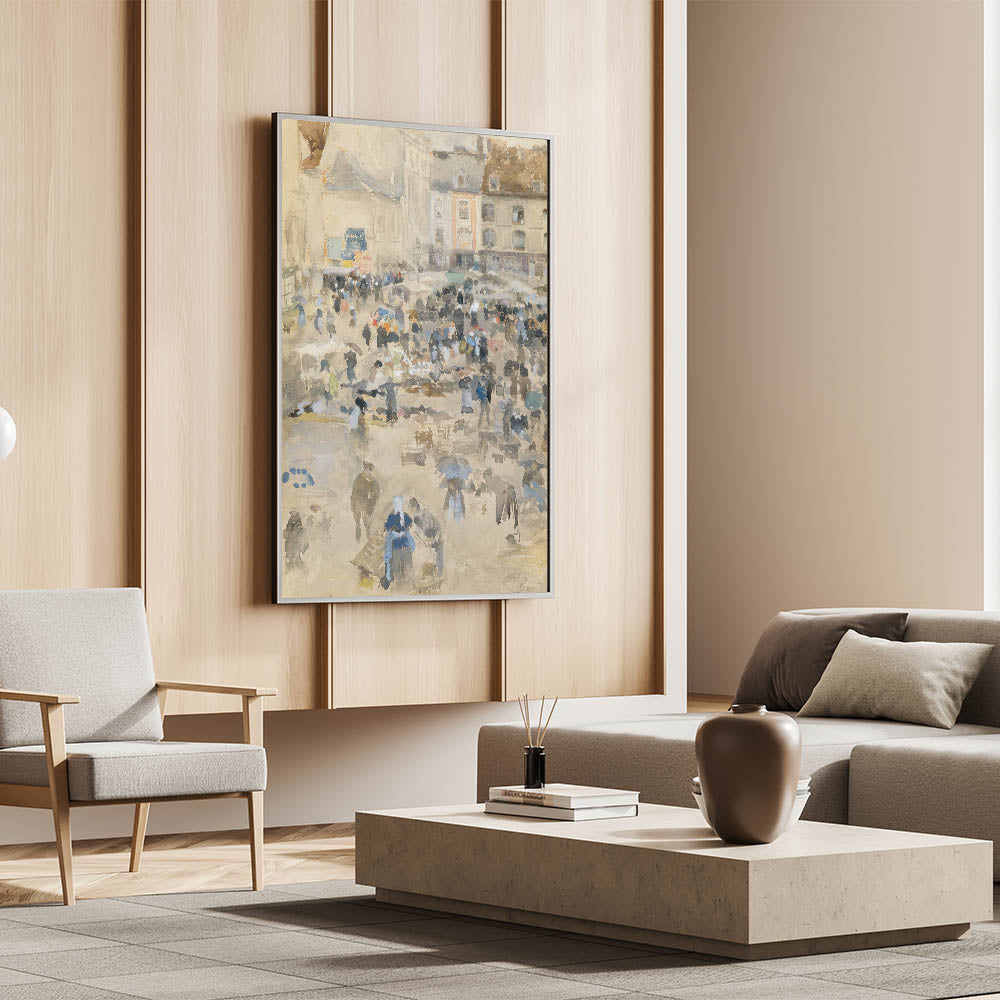 Experience the tranquil beauty of Impressionism with "Market Place, Dieppe" by James McNeill Whistler. This exquisite painting captures a bustling market in soft tones of violet and gray, reflecting Whistler’s mastery of light and atmosphere. Perfect for creating a serene yet dynamic focal point in your living room, office, or bedroom.