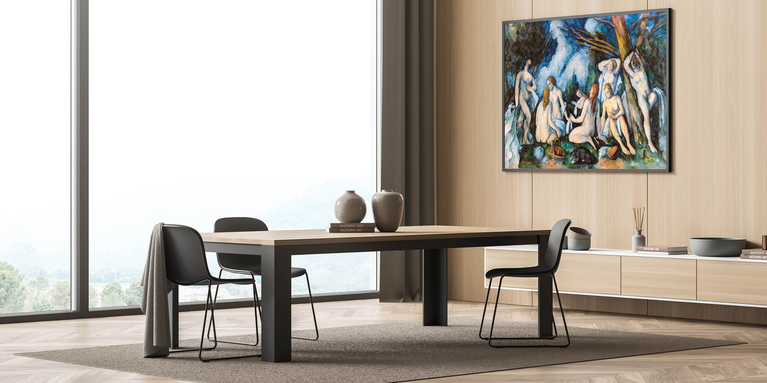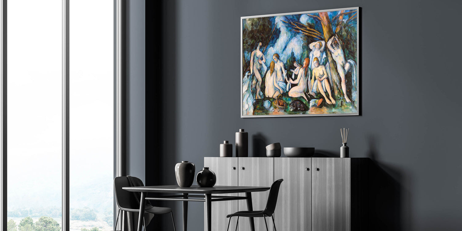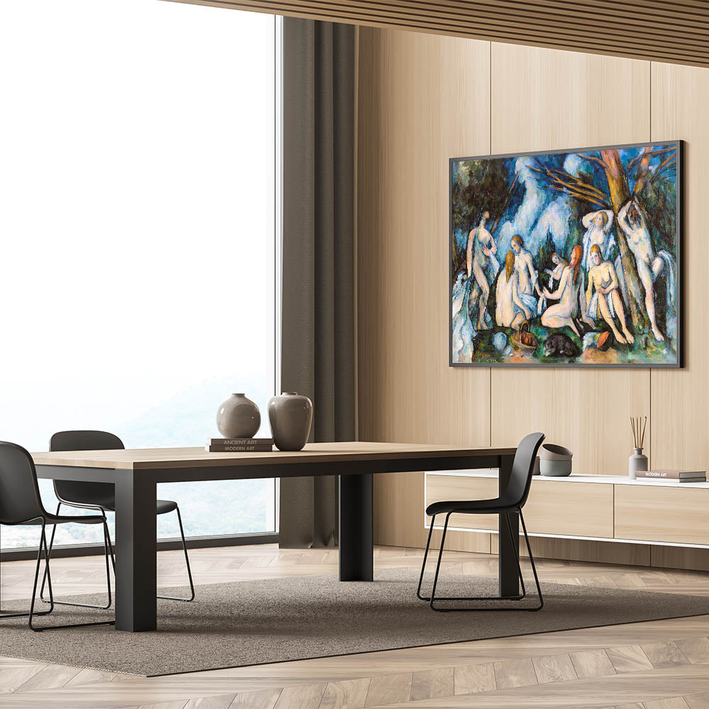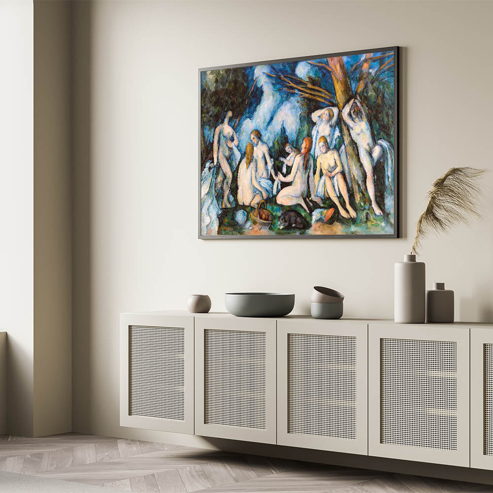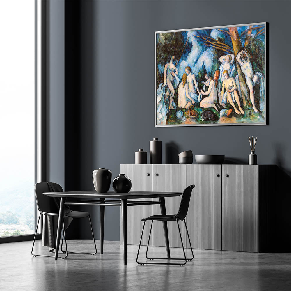 Experience the timeless elegance of Paul Cézanne's The Large Bathers (ca. 1895–1906), a masterpiece of Impressionist art. This captivating painting portrays a group of bathers immersed in a serene natural setting, showcasing Cézanne’s masterful use of color and composition. With bold brushstrokes and an interplay of light and shadow, the artwork captures both harmony and vitality. A perfect addition to any art lover’s collection, this piece enriches interiors with its profound artistic and historical significance.