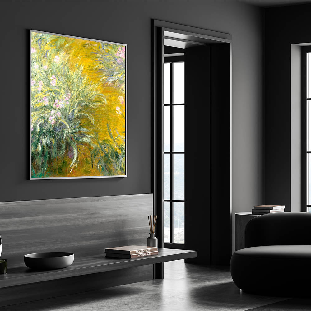 Immerse yourself in the lush beauty of nature with this vibrant Impressionist wall art, "The Path through the Irises" (1914–1917) by Claude Monet. This stunning painting captures a flourishing garden scene, with soft pink irises and verdant greenery bathed in golden sunlight. Monet's masterful use of light and color creates a dreamlike quality that transforms any room into a serene retreat.
