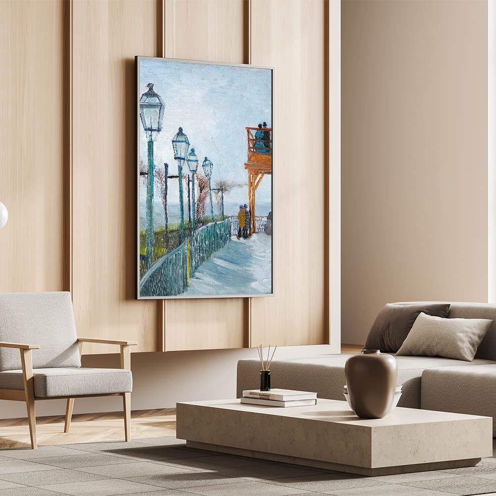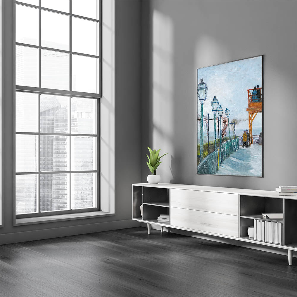 Transform your space with the elegance of Vincent van Gogh's "Terrace and Observation Deck at the Moulin de Blute-Fin, Montmartre." This breathtaking artwork captures a tranquil Parisian scene with a series of lamp posts leading toward a scenic observation deck. Van Gogh's signature brushstrokes and vivid color palette bring life to this serene moment, blending Impressionist and Post-Impressionist influences. Perfect for art enthusiasts, this piece embodies the beauty of historical Impressionism.