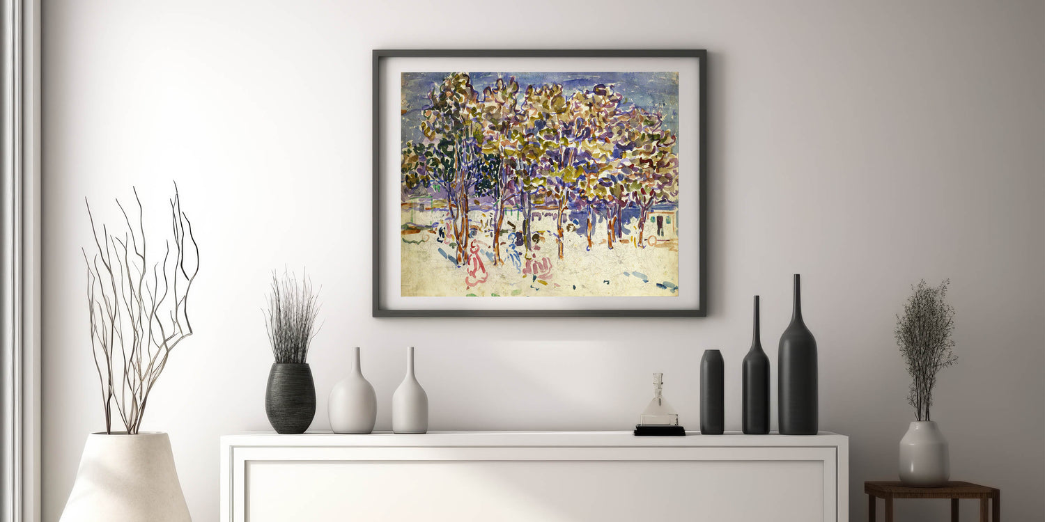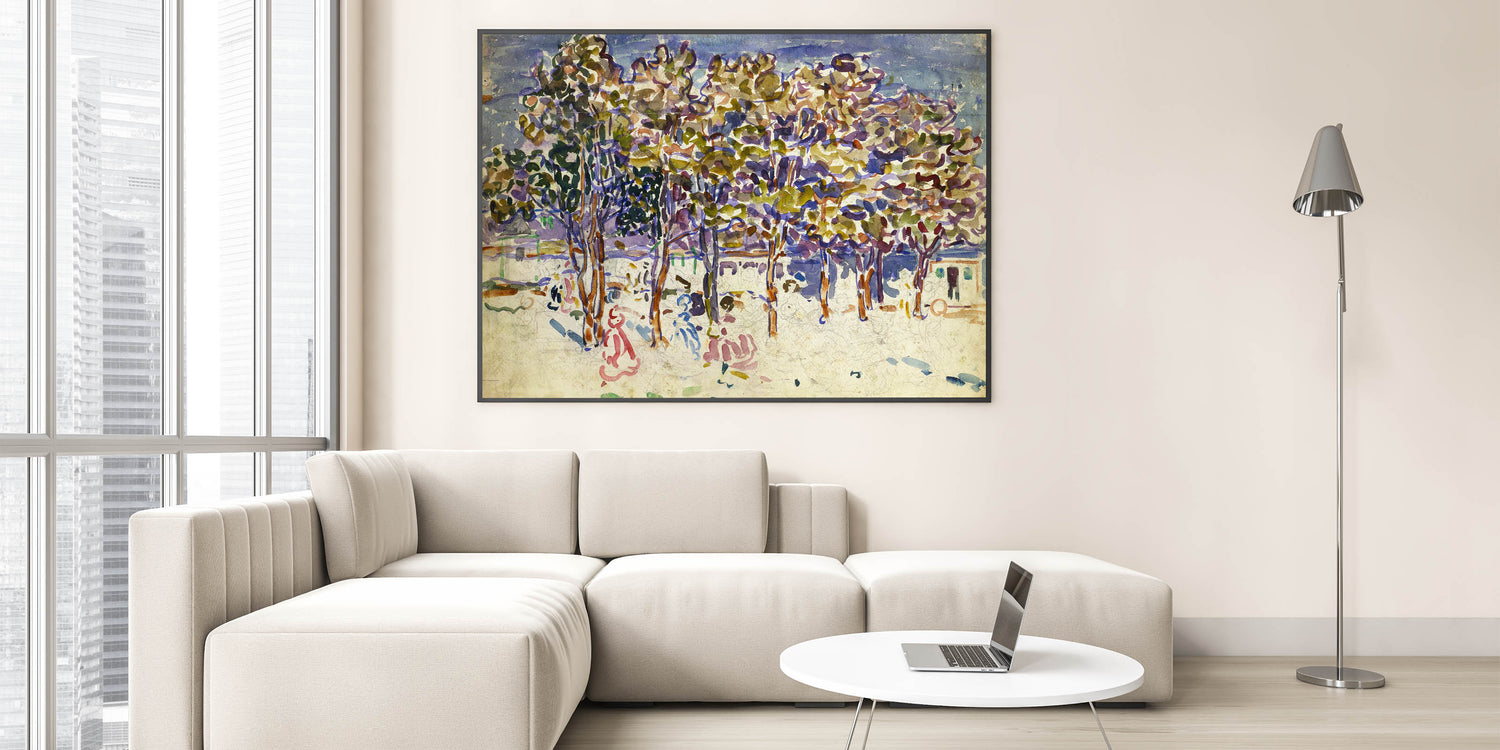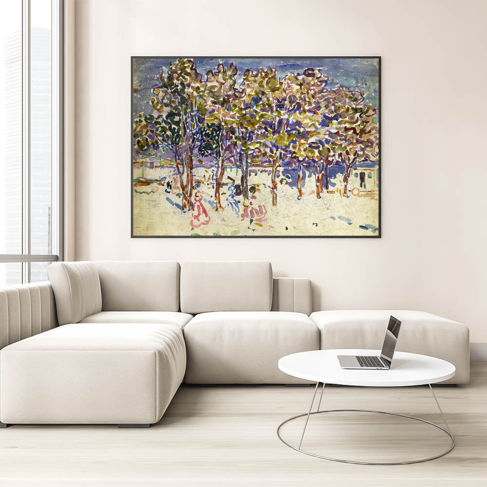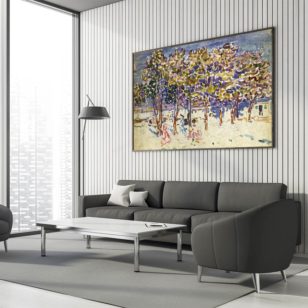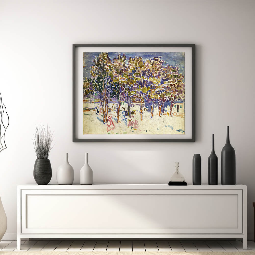 Elevate your space with the lively energy of Maurice Prendergast's "Trees." This Impressionist-inspired artwork bursts with vibrant colors, playful brushstrokes, and dynamic composition. Capturing a serene park scene under a canopy of trees, the painting reflects the spontaneity and charm of nature through the lens of Impressionism.