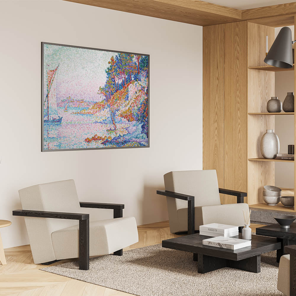 Discover the serene beauty of La Calanque by Paul Signac, a masterpiece of Pointillism that captures the dazzling interplay of light and color along the Mediterranean coast. This exquisite painting combines meticulous dot work and vibrant hues to depict a tranquil bay surrounded by lush trees and shimmering waters. Signac’s unique technique and attention to detail bring this scene to life, making it an ideal addition to any art lover's collection.