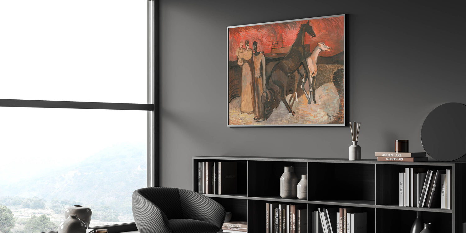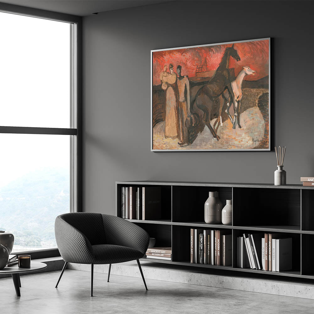 This painting’s evocative color palette of rich reds, warm browns, and soft beige tones adds depth and drama to your decor. Perfect for art lovers seeking to add a narrative-driven piece to their living room, study, or gallery wall. Experience the profound storytelling that only modern expressionist art can offer.