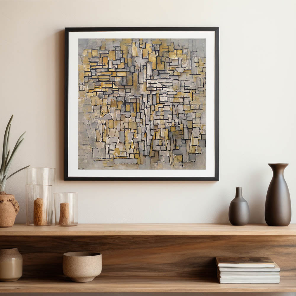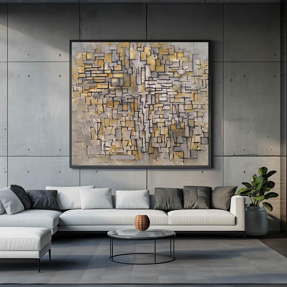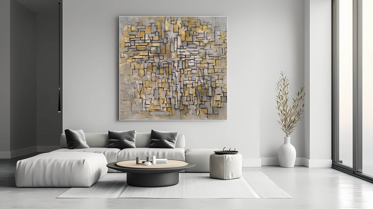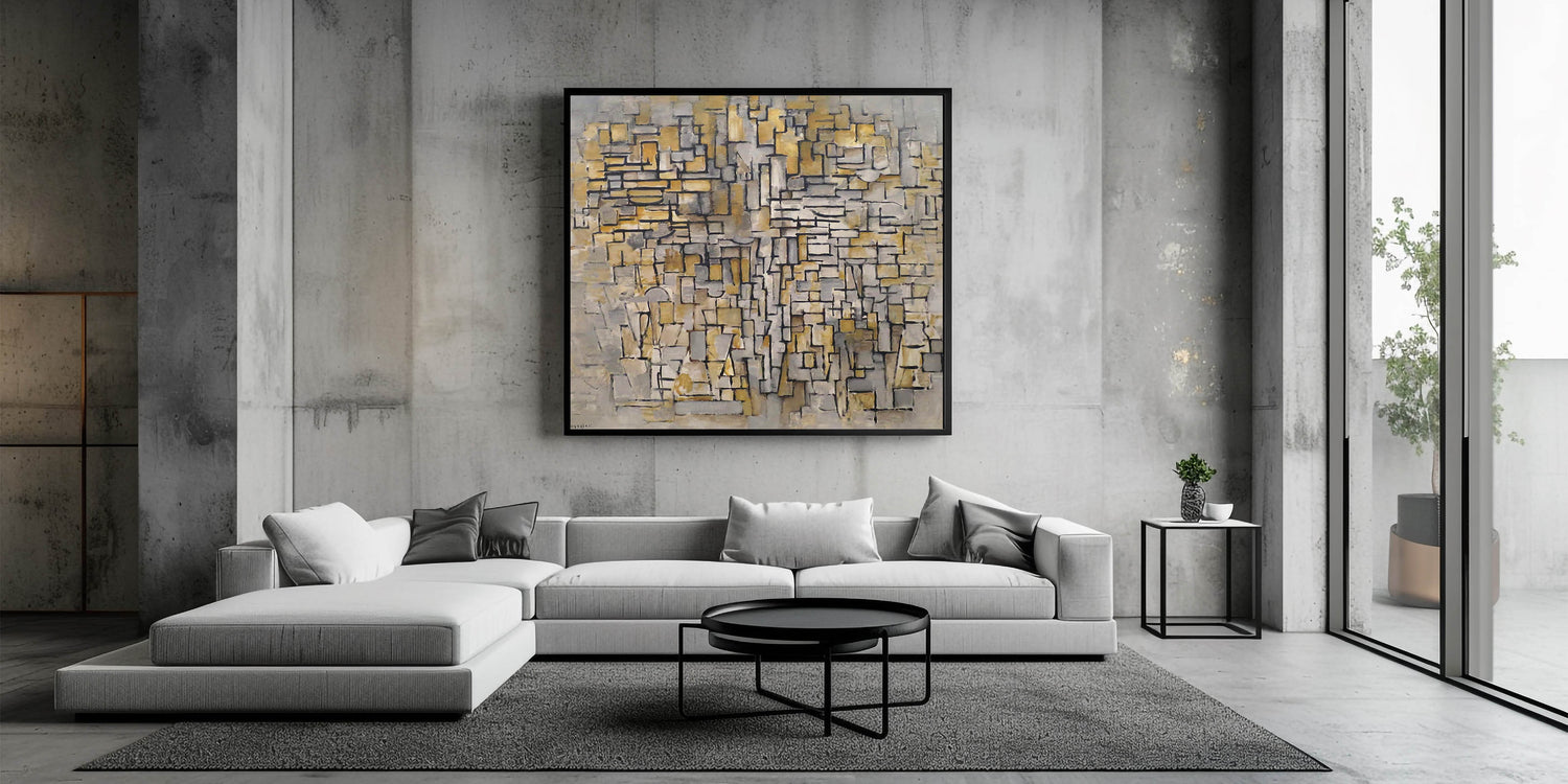 Elevate your living space with this striking Modern Wall Art, featuring an intricate abstract composition in shades of gold and gray. This captivating piece blends geometric forms and modern design elements, offering a timeless touch of sophistication to any décor.