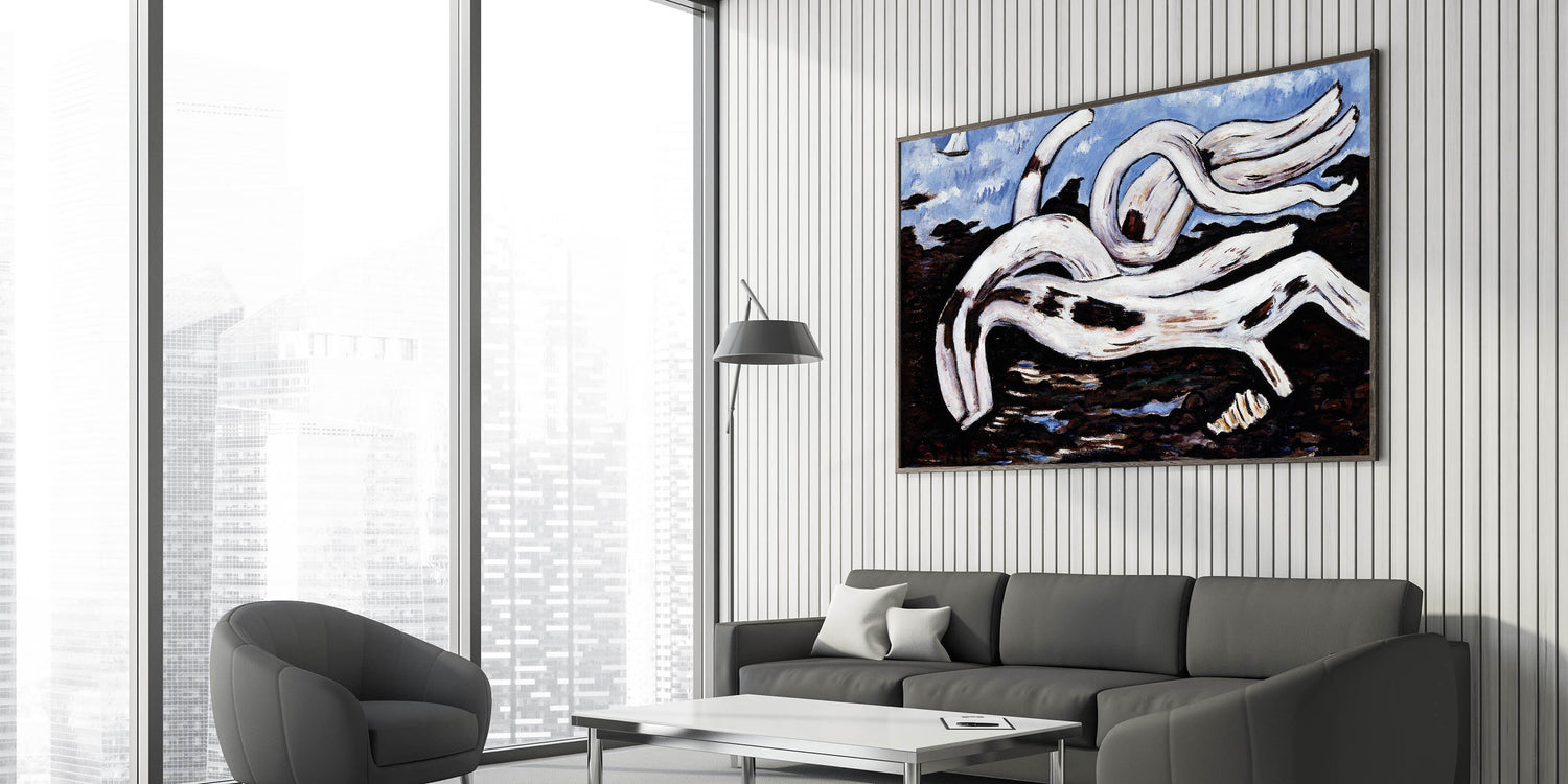 - Artistic Style: Abstract coastal-inspired artwork with bold contrasts.