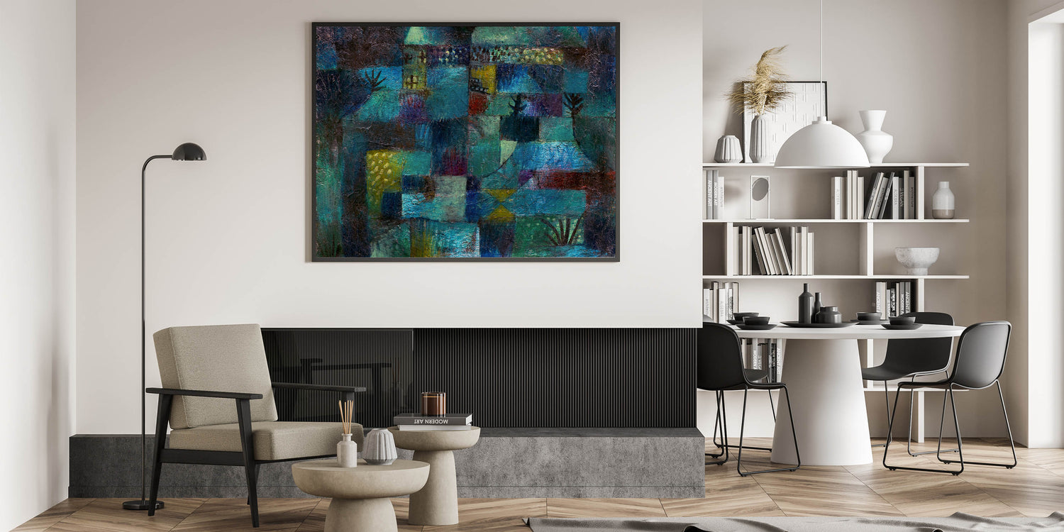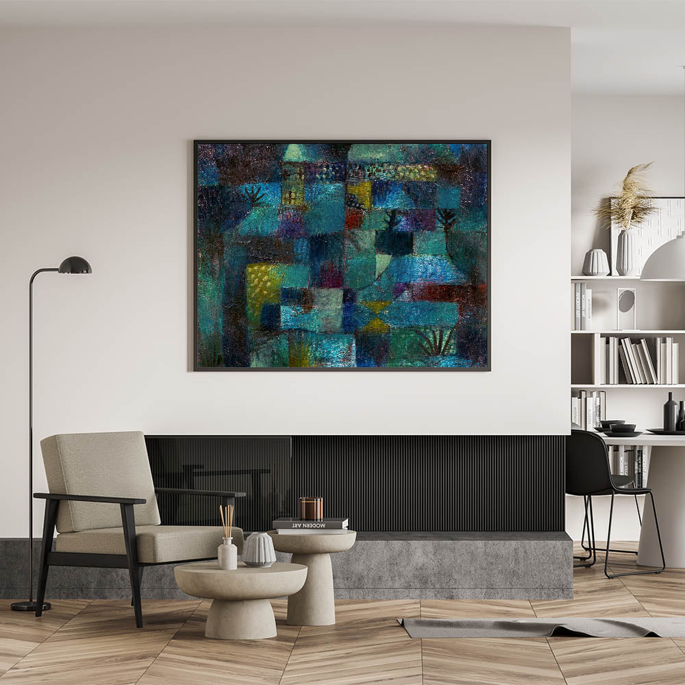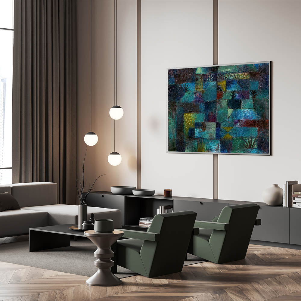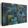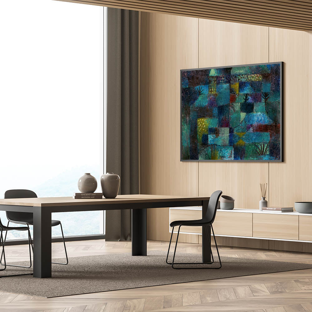 Immerse yourself in the vibrant, dreamlike world of this modern wall art, inspired by Paul Klee’s Terraced Garden (1920). This abstract masterpiece weaves together deep shades of teal, blue, and green with subtle accents of yellow and red, evoking a sense of mystery and serenity. Perfect for lovers of contemporary art, this piece captures the essence of nature in a unique and captivating way.