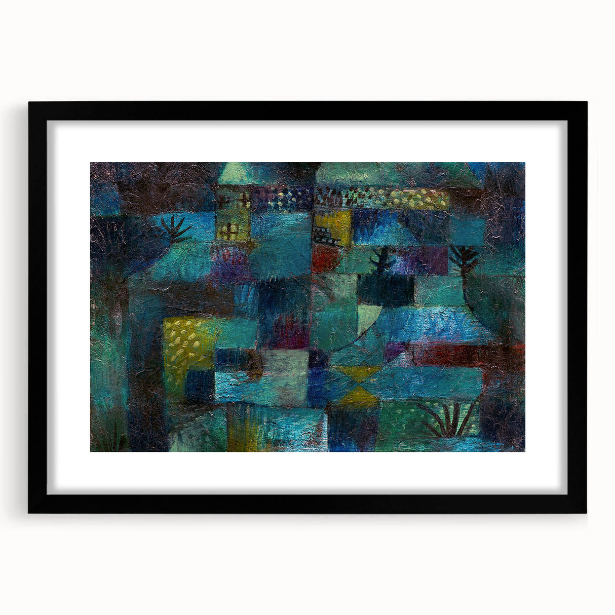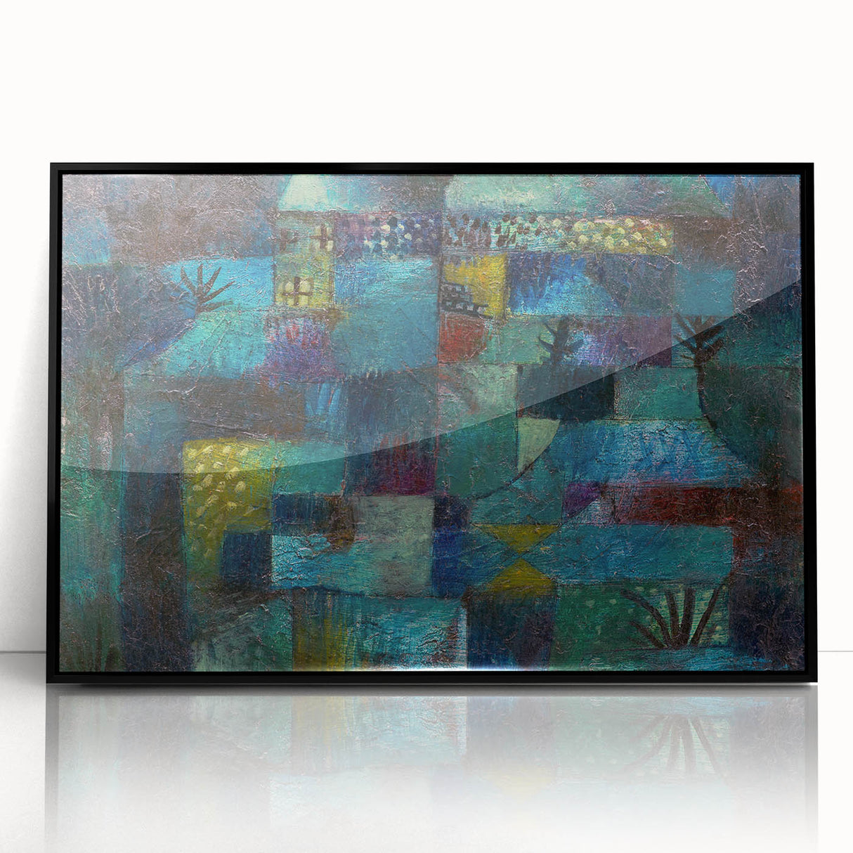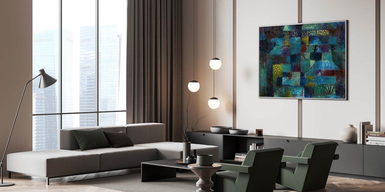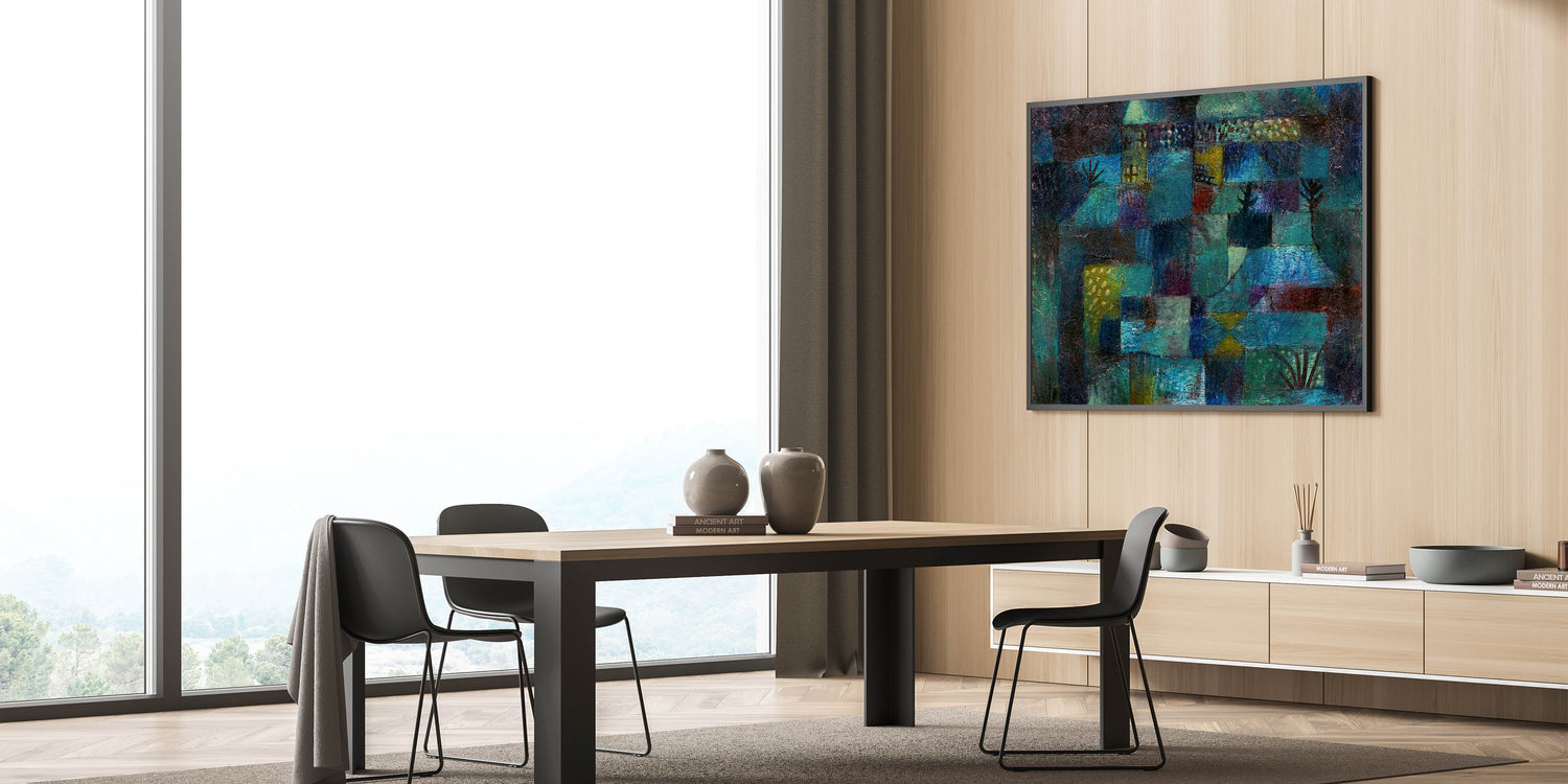 Immerse yourself in the vibrant, dreamlike world of this modern wall art, inspired by Paul Klee’s Terraced Garden (1920). This abstract masterpiece weaves together deep shades of teal, blue, and green with subtle accents of yellow and red, evoking a sense of mystery and serenity. Perfect for lovers of contemporary art, this piece captures the essence of nature in a unique and captivating way.