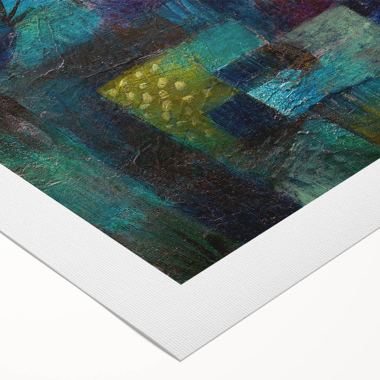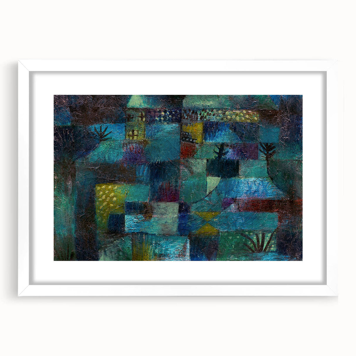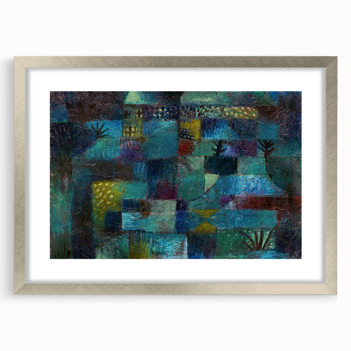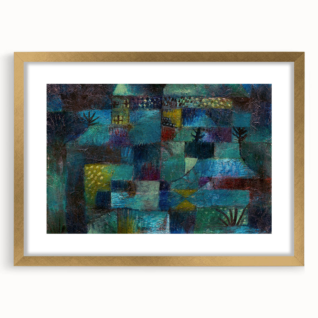 Immerse yourself in the vibrant, dreamlike world of this modern wall art, inspired by Paul Klee’s Terraced Garden (1920). This abstract masterpiece weaves together deep shades of teal, blue, and green with subtle accents of yellow and red, evoking a sense of mystery and serenity. Perfect for lovers of contemporary art, this piece captures the essence of nature in a unique and captivating way.