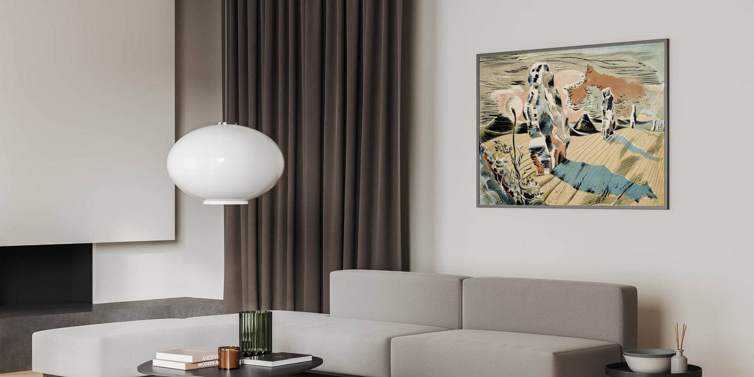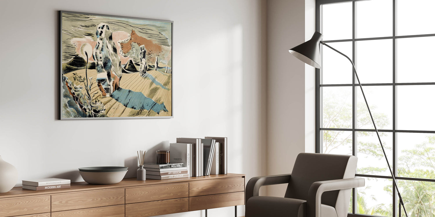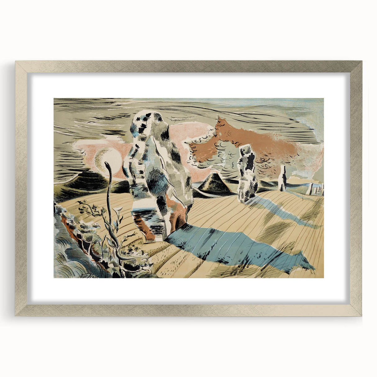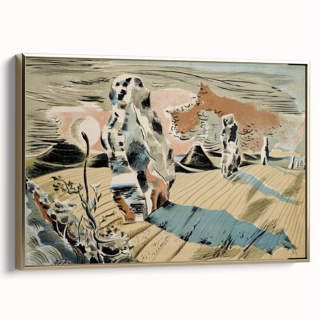 Transform your space with this modern wall art, inspired by Paul Nash's Avebury (1937). This abstract landscape blends muted tones of beige, blue, and green, with organic forms evoking a surreal yet tranquil atmosphere. Perfect for fans of contemporary art, this piece creates a connection between modernity and natural beauty, making it ideal for trendy home decor.