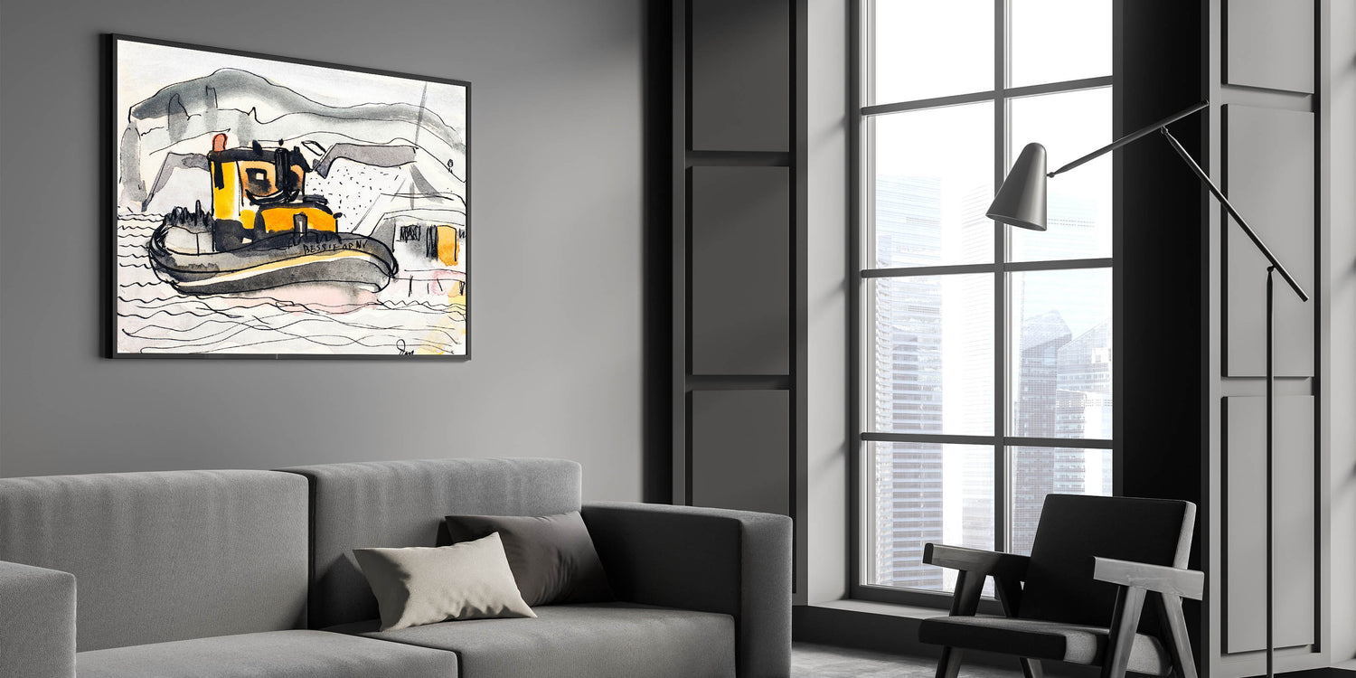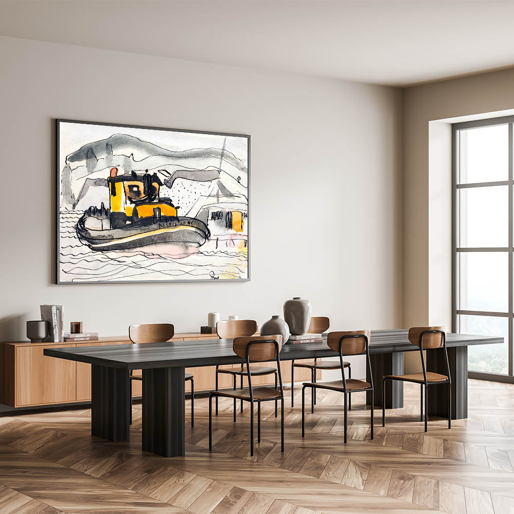 Enhance your decor with this unique modern wall art inspired by Arthur Dove's "Study for The 'Bessie' of New York" (1932). This artwork captures the charm of a bustling harbor scene featuring a bold yellow tugboat against a monochromatic coastal backdrop. The expressive brushstrokes and simplified forms lend an abstract and contemporary feel, making it an ideal choice for nautical and modern art enthusiasts.