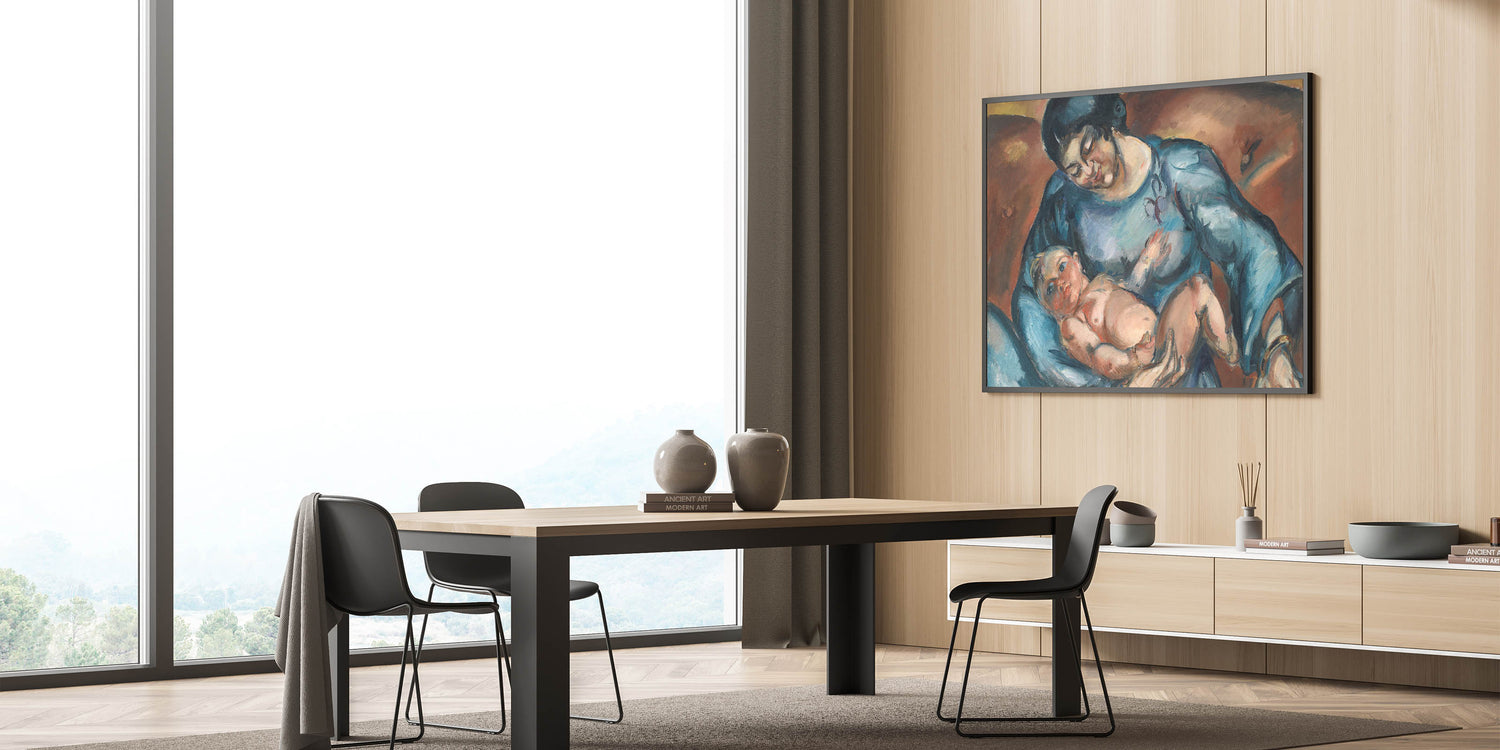 Celebrate the timeless bond between mother and child with this captivating piece of modern wall art. The artwork, titled "Mother's Love," portrays an intimate moment of tenderness and care, rendered in rich hues of blue and warm earthy tones. This abstract modern art design adds emotional depth to any living space while embodying minimalist modern decor.