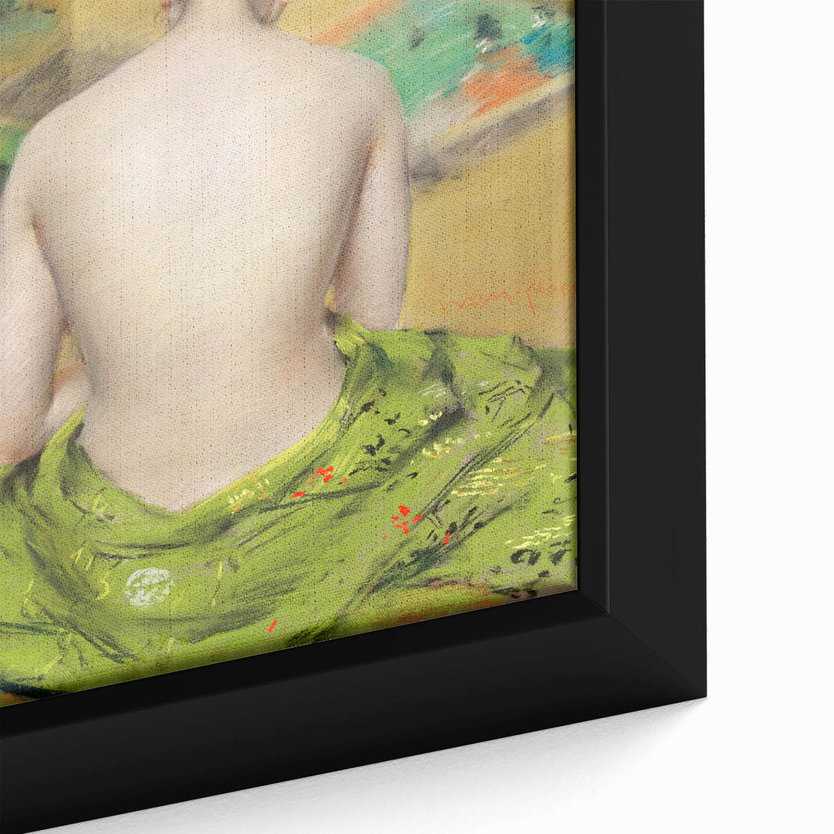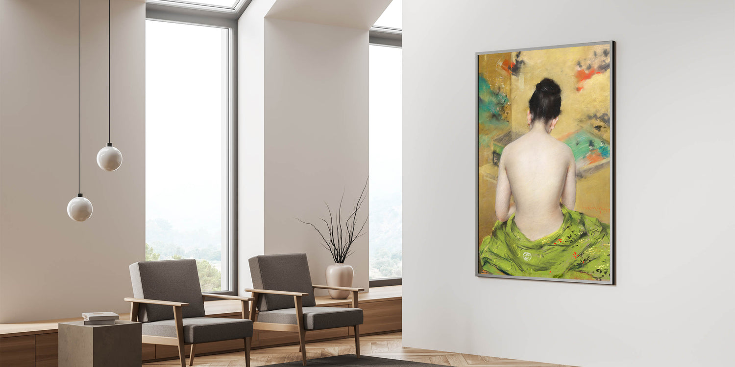 Add a touch of sophistication to your living space with this Modern Wall Art featuring an abstract study of a woman draped in a green kimono. This artwork combines sensual elegance with Modern Design Elements, making it an exceptional addition to any home. The soft tones of flesh contrast beautifully with the vibrant green and warm gold background, evoking a timeless charm that blends seamlessly with contemporary interiors.