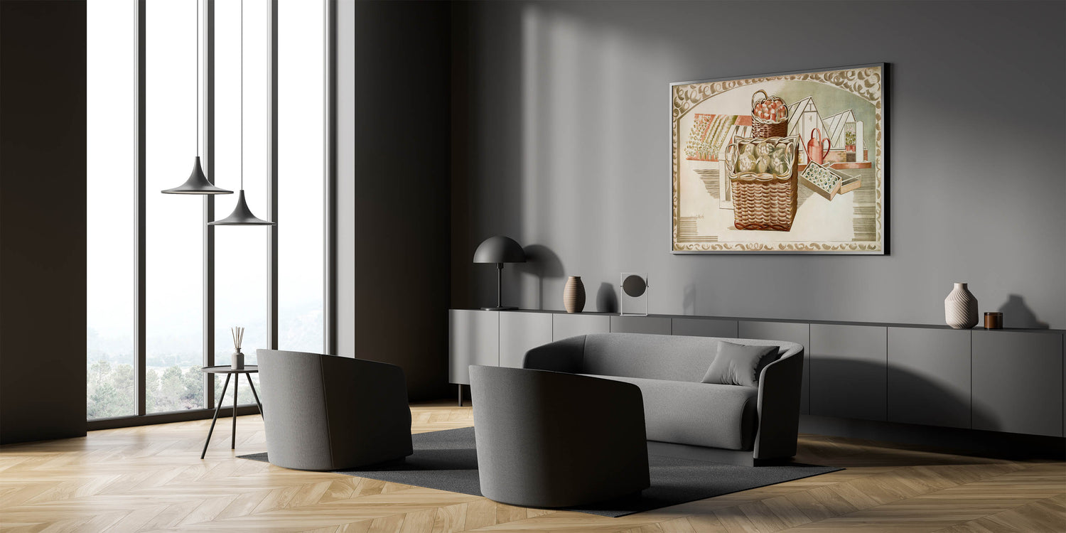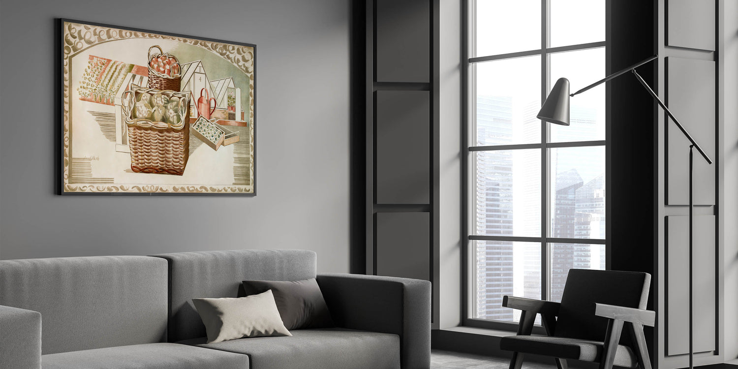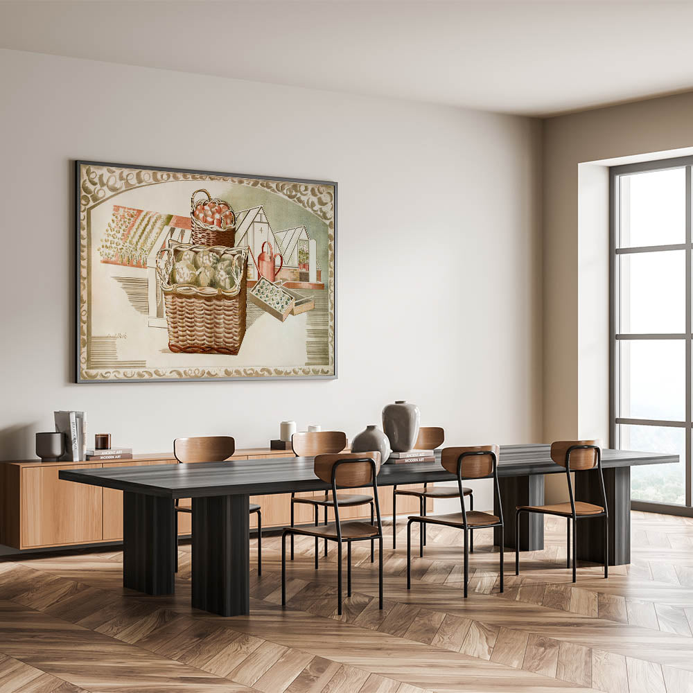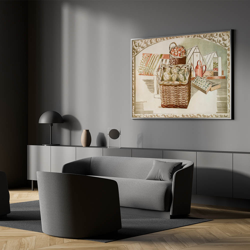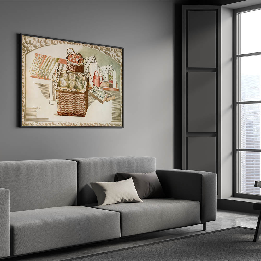 Enhance your living space with this Modern Wall Art showcasing an abstract depiction of orchards and garden baskets, inspired by the unique style of Paul Nash. This intricate artwork combines natural themes with geometric modernism, making it a perfect choice for Contemporary Art enthusiasts seeking Trendy Home Décor.