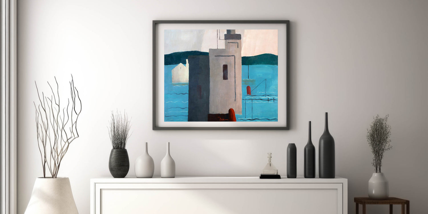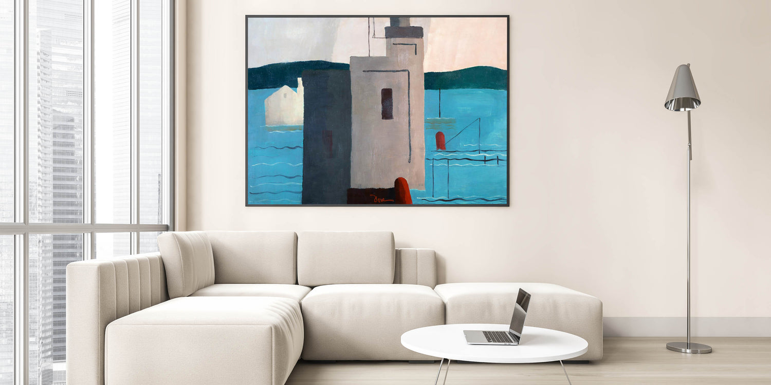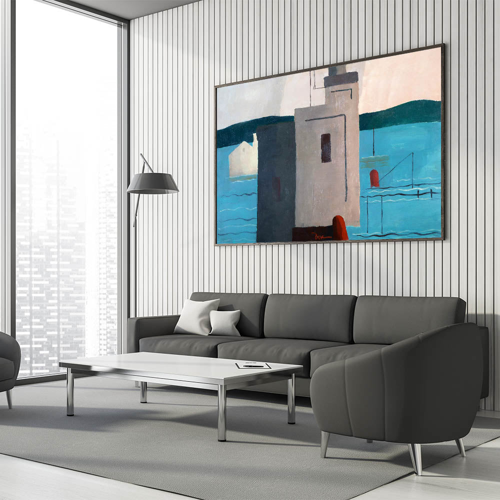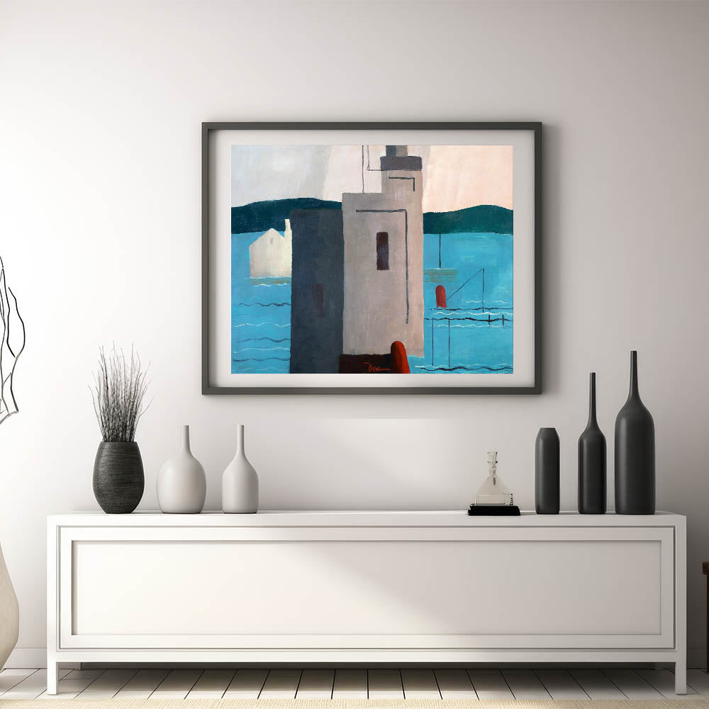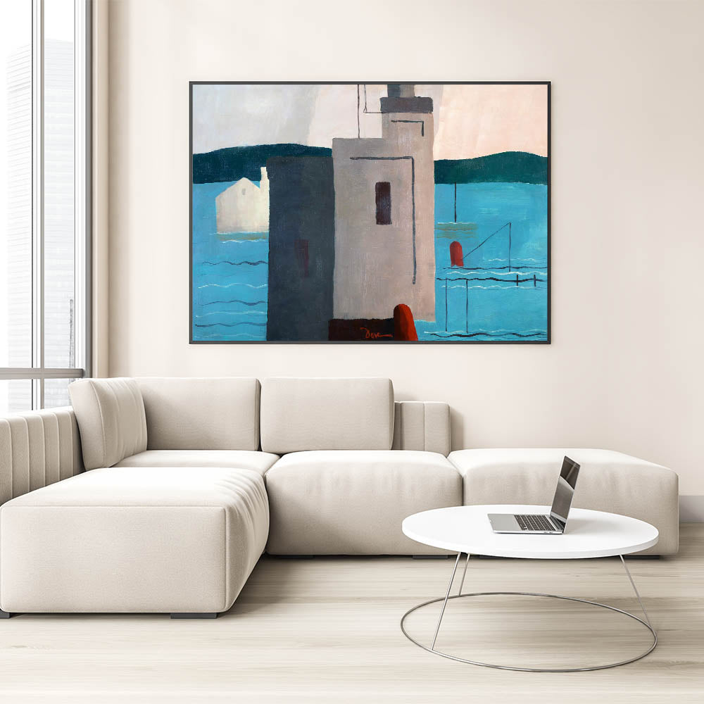 Bring a touch of modern sophistication to your home with this striking abstract depiction of a waterfront. This artwork, with its minimalist forms and bold color blocks, captures the essence of contemporary design. The interplay of soft blues, muted grays, and deep red accents creates a harmonious balance that’s both soothing and visually engaging.