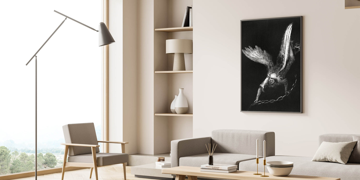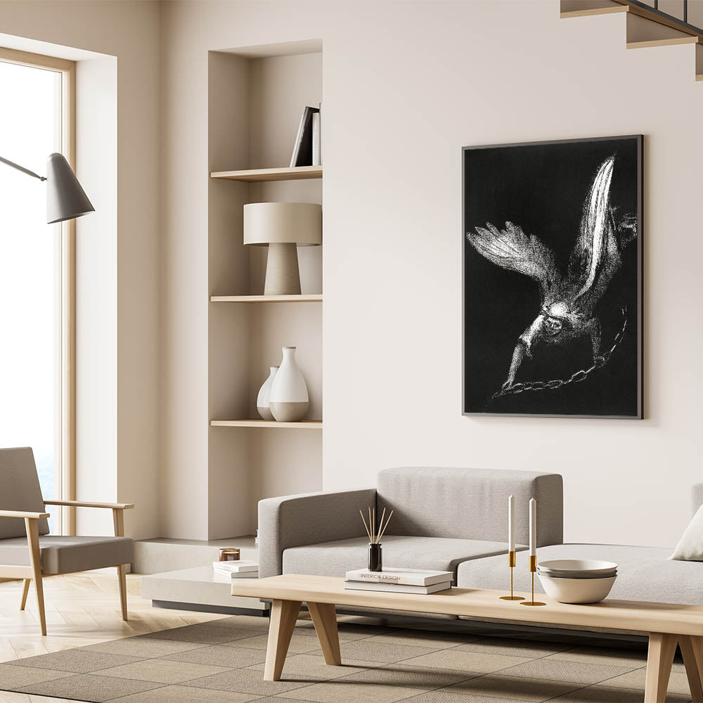 Infuse your space with a sense of mystery and drama with the "Angel with Chain" Modern Wall Art. Inspired by Odilon Redon's 1899 masterpiece, this striking monochromatic artwork depicts a powerful angel descending with a chain, capturing both tension and grace. Its dark, minimalist aesthetic makes it an ideal choice for modern design-focused interiors.