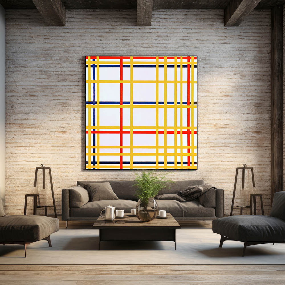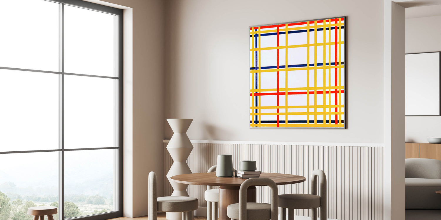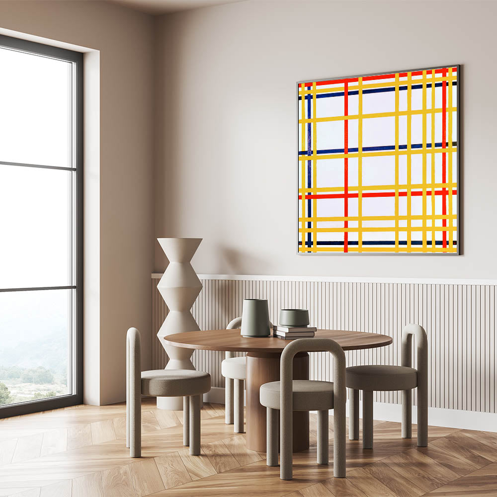Add a touch of modern sophistication to your space with this Modern Wall Art featuring a vibrant geometric grid design. Inspired by the dynamic style of abstract modern art, this composition uses bold yellow, red, and blue lines to create a visually striking interplay of structure and color. Perfect for those who appreciate trendy home decor and artistic precision, this piece is a statement of creativity and balance.