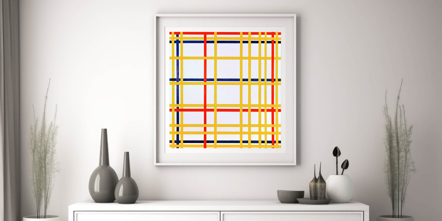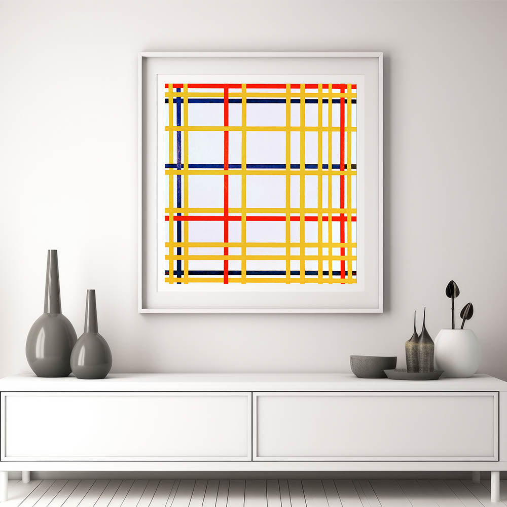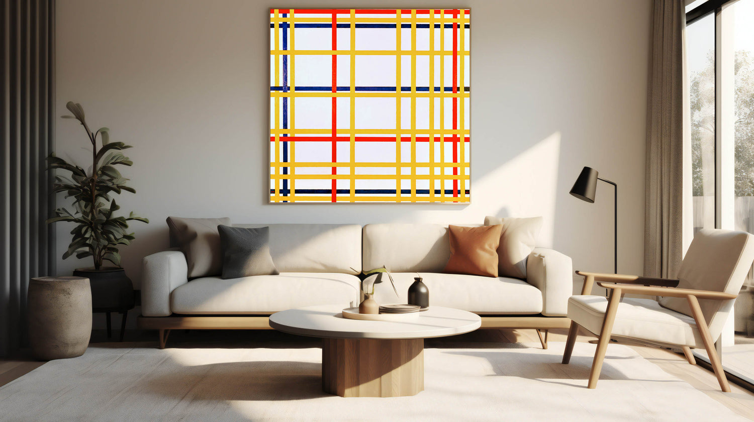 Add a touch of modern sophistication to your space with this Modern Wall Art featuring a vibrant geometric grid design. Inspired by the dynamic style of abstract modern art, this composition uses bold yellow, red, and blue lines to create a visually striking interplay of structure and color. Perfect for those who appreciate trendy home decor and artistic precision, this piece is a statement of creativity and balance.