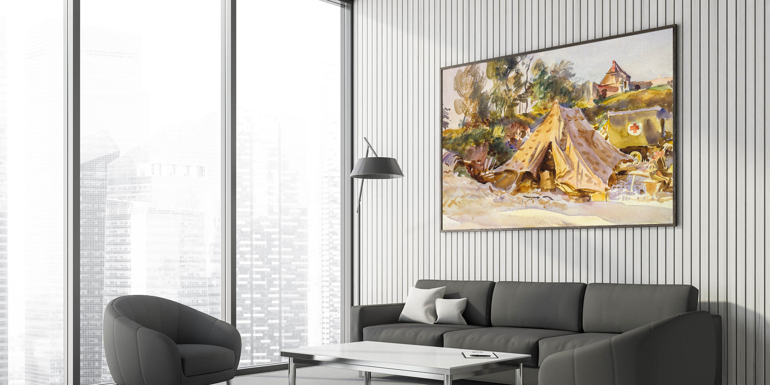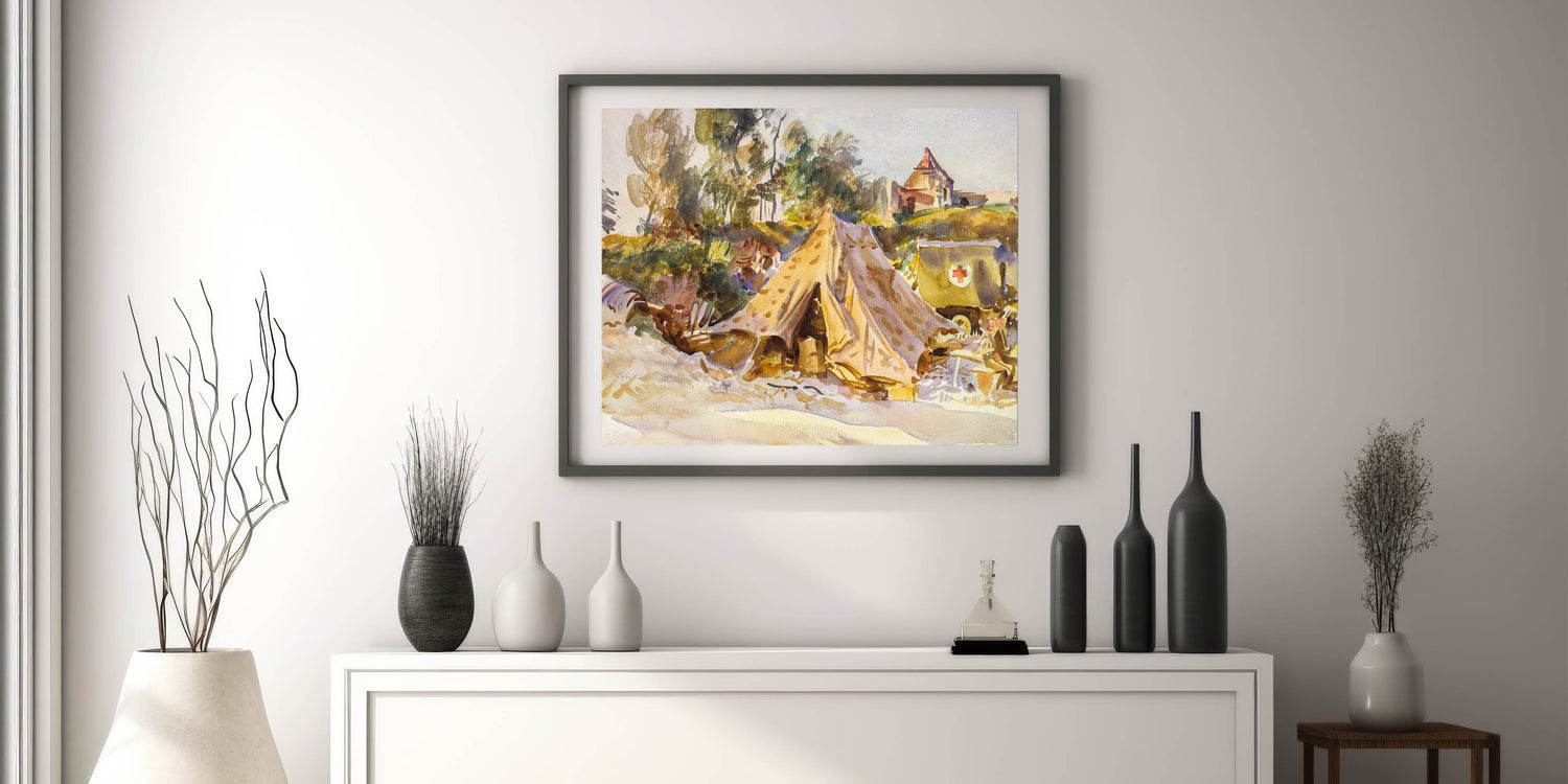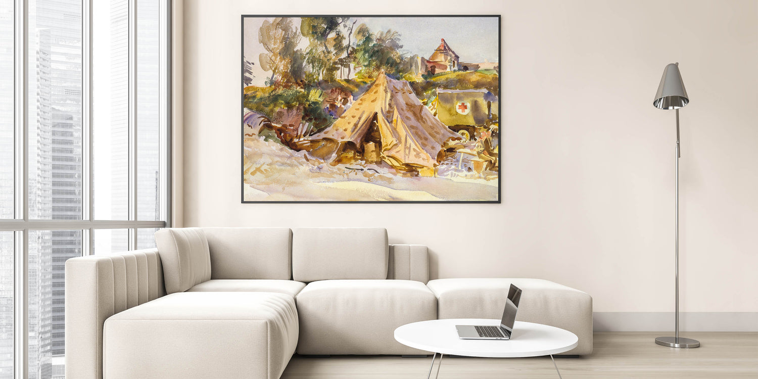 Add historical depth and artistic elegance to your decor with this Modern Wall Art piece, inspired by John Singer Sargent’s Camp with Ambulance (1918). This evocative watercolor captures a scene of quiet resilience, with a Red Cross ambulance, military tents, and lush surroundings. The soft interplay of earthy tones and subtle highlights reflects Sargent’s masterful touch, making it a perfect addition to contemporary and vintage-inspired spaces.