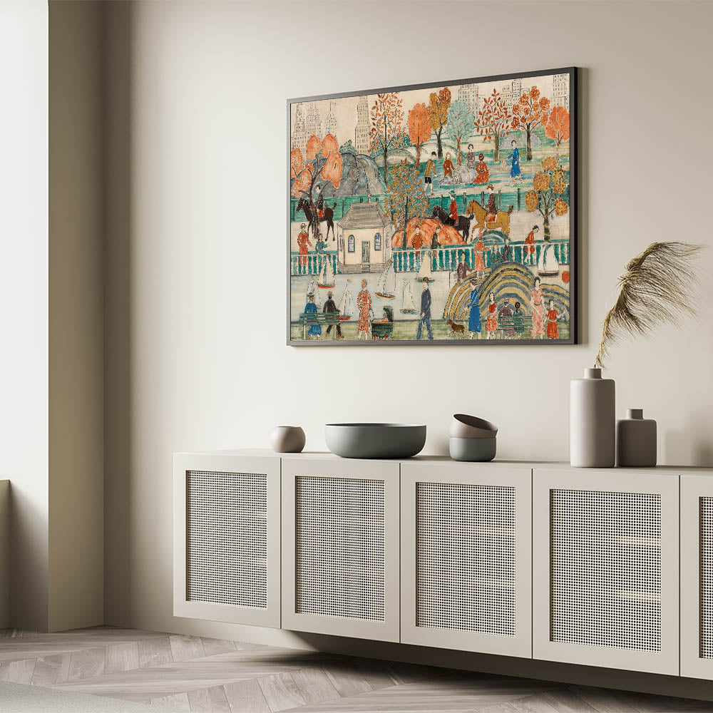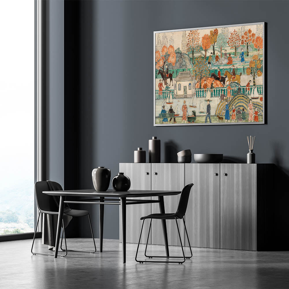 Celebrate the bustling charm of Central Park with this delightful piece of modern wall art. Featuring a whimsical depiction of parkgoers, trees in vibrant autumn hues, and city buildings in the background, the artwork beautifully captures the energy and diversity of urban life. The intricate details of people, horses, and boats on the pond bring a lively narrative to the scene, offering a timeless portrayal of community and nature.