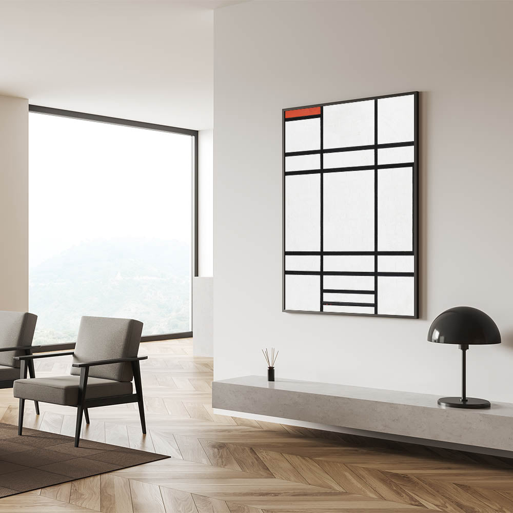 Add sleek sophistication to your decor with the "Composition in White, Red, and Yellow" Modern Wall Art. Inspired by Piet Mondrian's 1936 masterpiece, this abstract minimalist artwork uses bold black lines and vibrant blocks of red, yellow, and white to create a harmonious balance. Perfect for those who appreciate modern design elements and geometric abstraction.