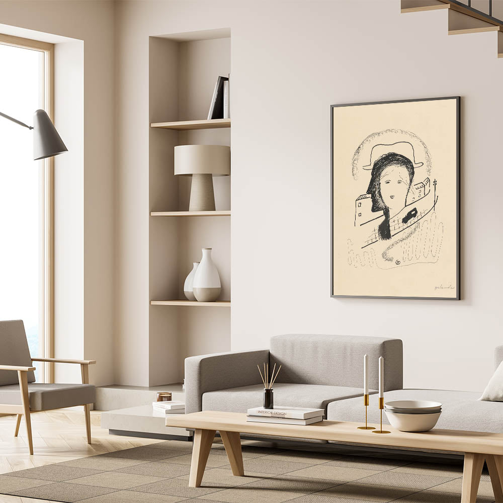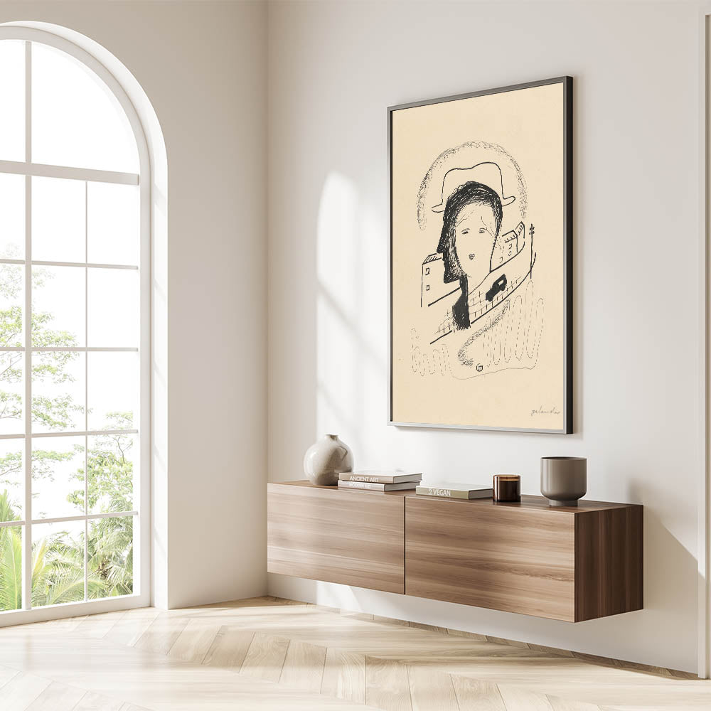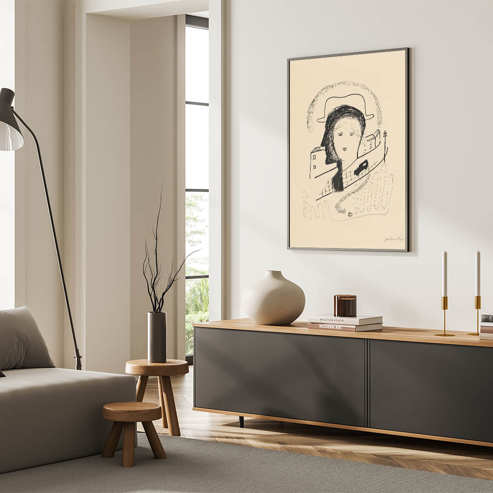 The subtle interplay of abstract shapes and soft lines in this artwork creates a calming yet thought-provoking focal point. Its understated beauty makes it a versatile addition to any space, whether displayed individually or as part of a gallery wall. This unique modern art piece celebrates the elegance of simplicity and human connection.