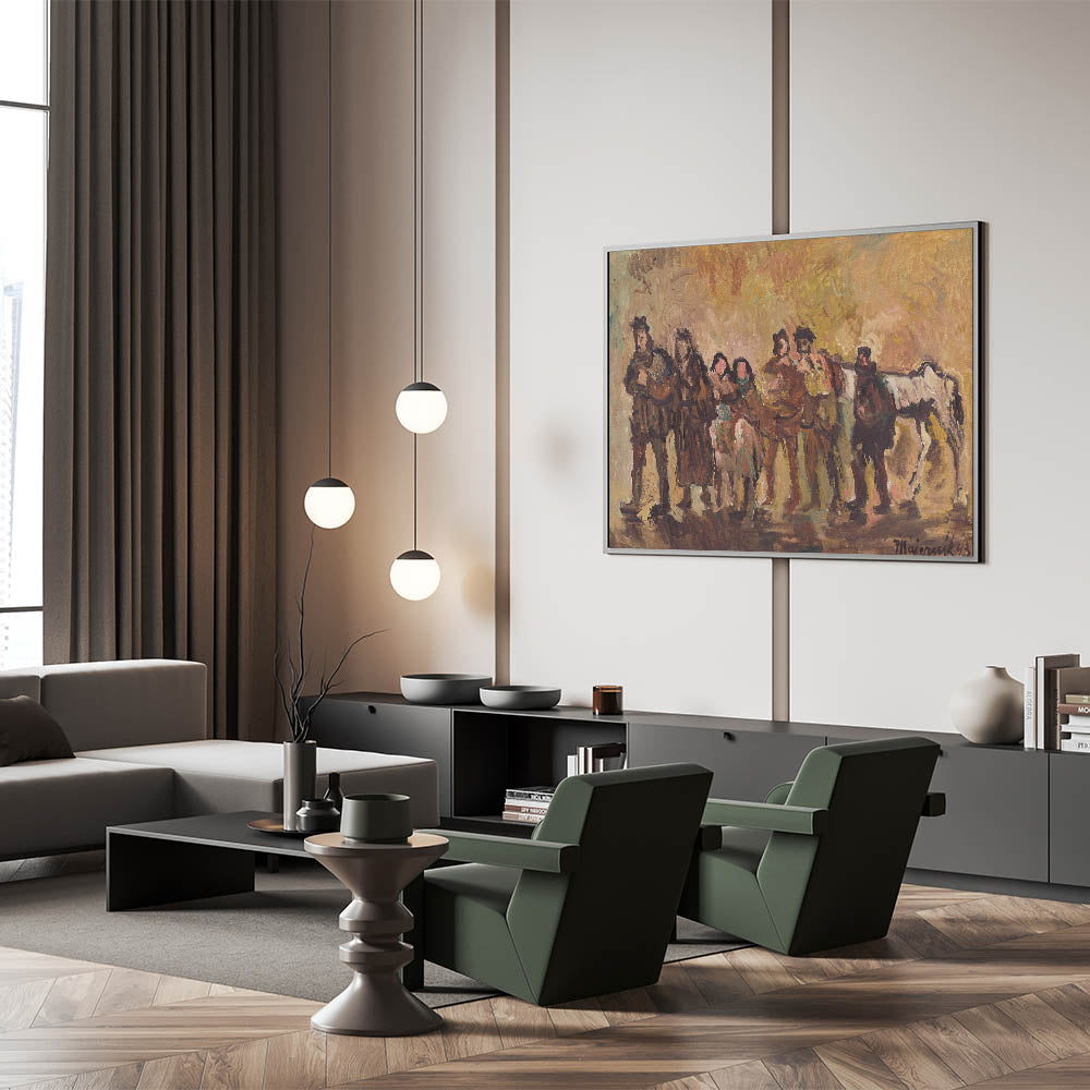 Infuse your space with emotion and storytelling through this Modern Wall Art featuring Cyprián Majerník's evocative "Exiles." This compelling artwork uses earthy tones and bold brushstrokes to depict a group of exiled figures, creating a striking piece of Contemporary Art that resonates deeply with its viewers.
