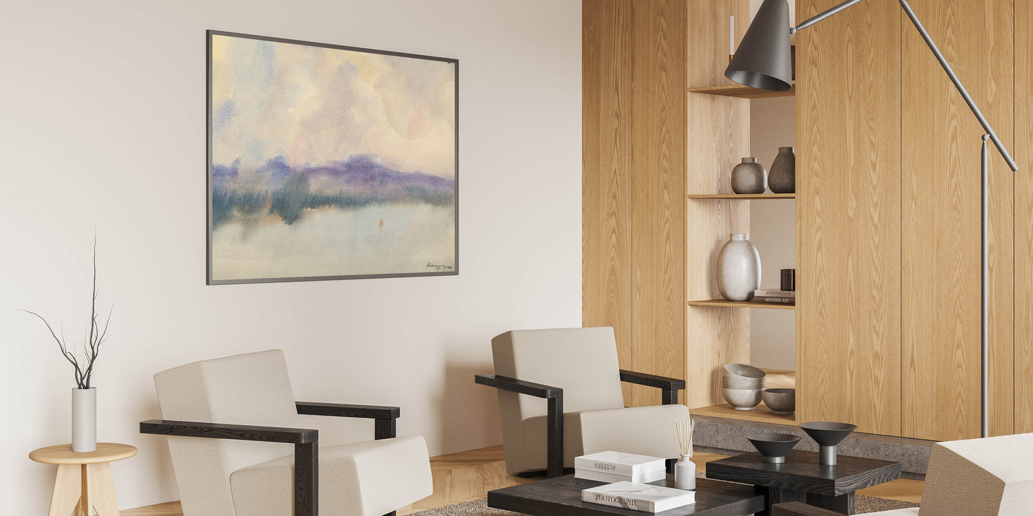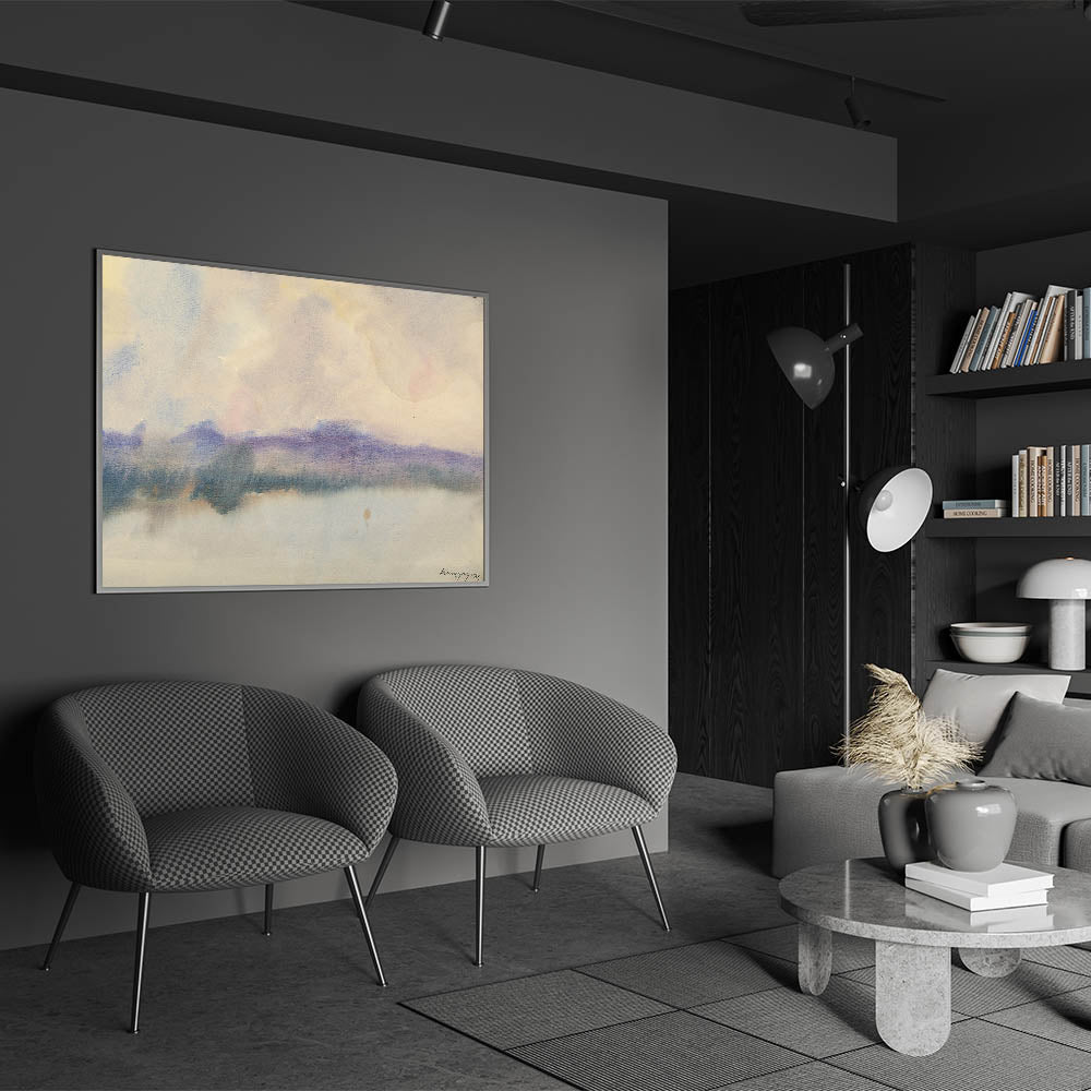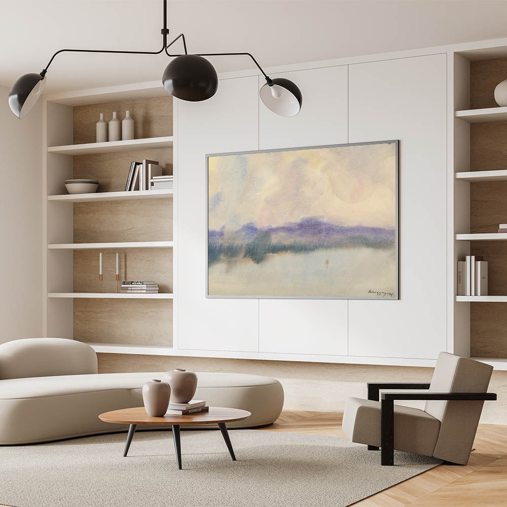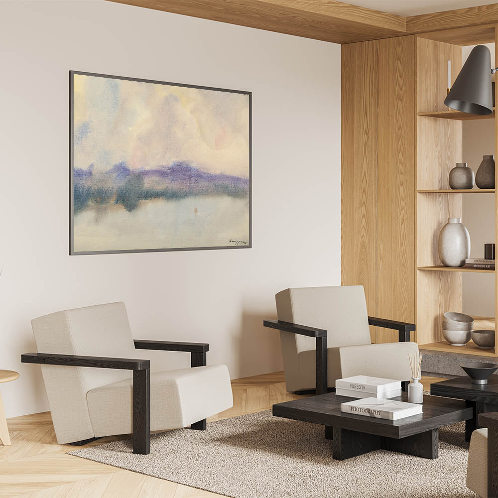 Immerse yourself in the tranquil beauty of "Fog Over a Fish Pond" by Zolo Palugyay. This stunning modern artwork captures a serene landscape enveloped in mist, with soft hues of blue, lavender, and beige blending seamlessly to evoke a calming atmosphere. The abstract quality of the scene invites the viewer to reflect on nature's quiet elegance, making this piece perfect for minimalist modern decor or contemporary spaces.