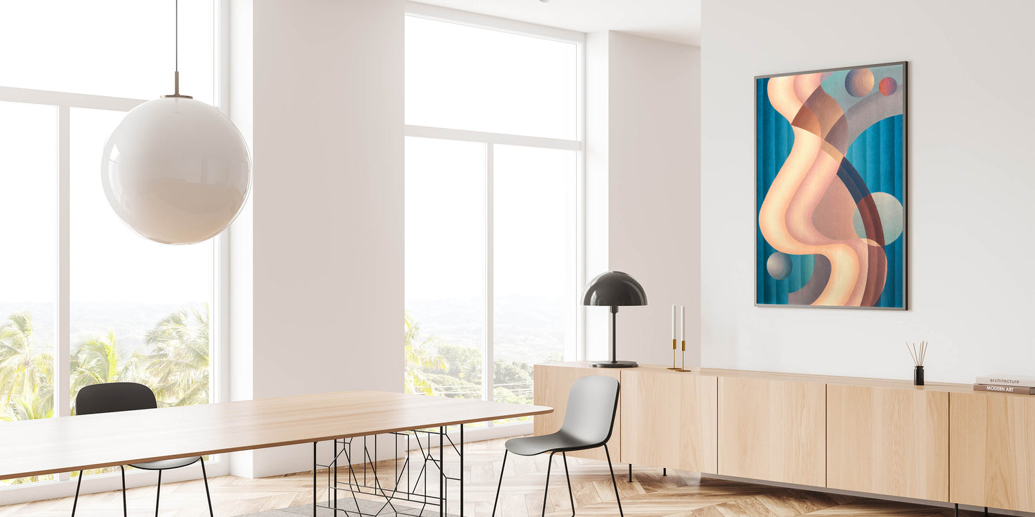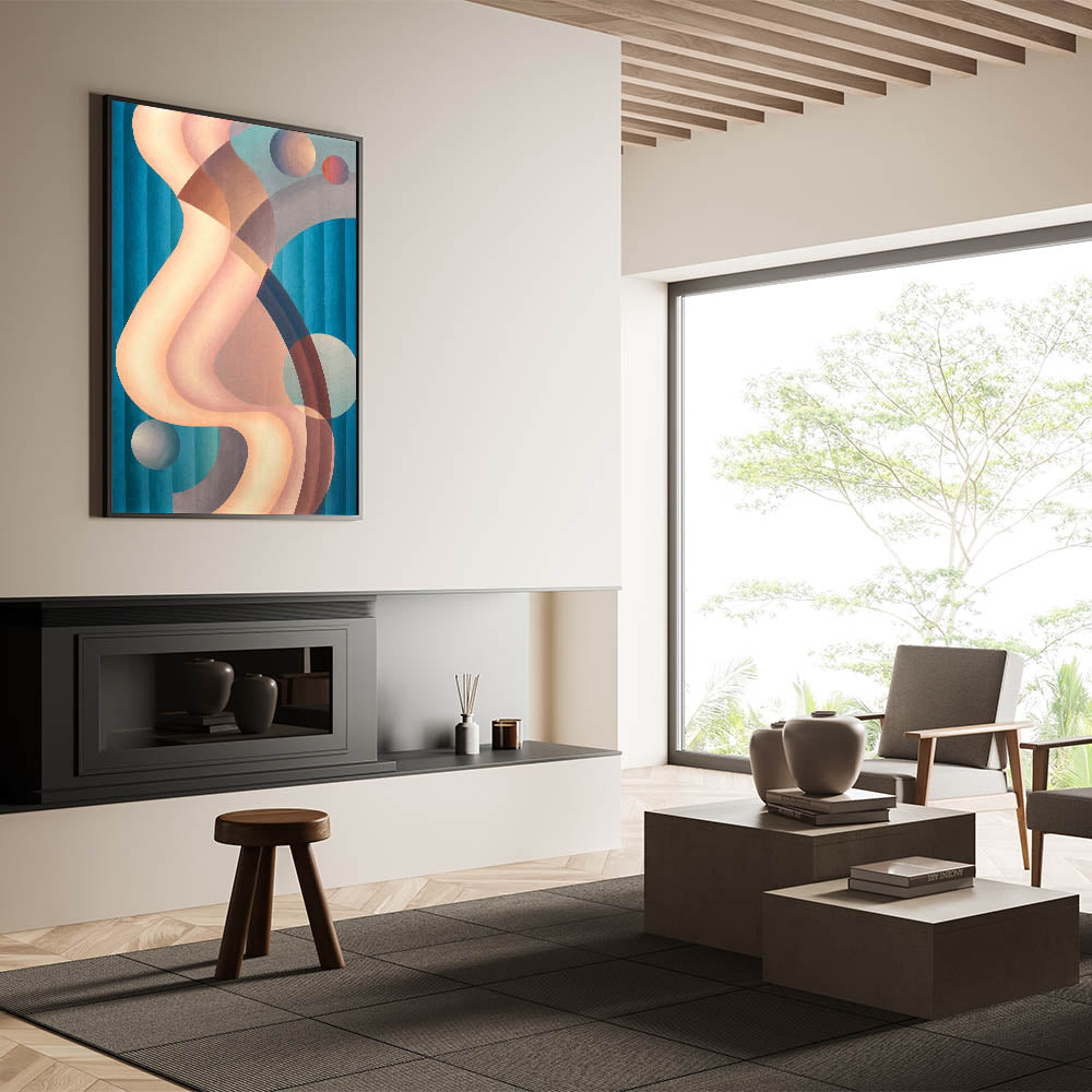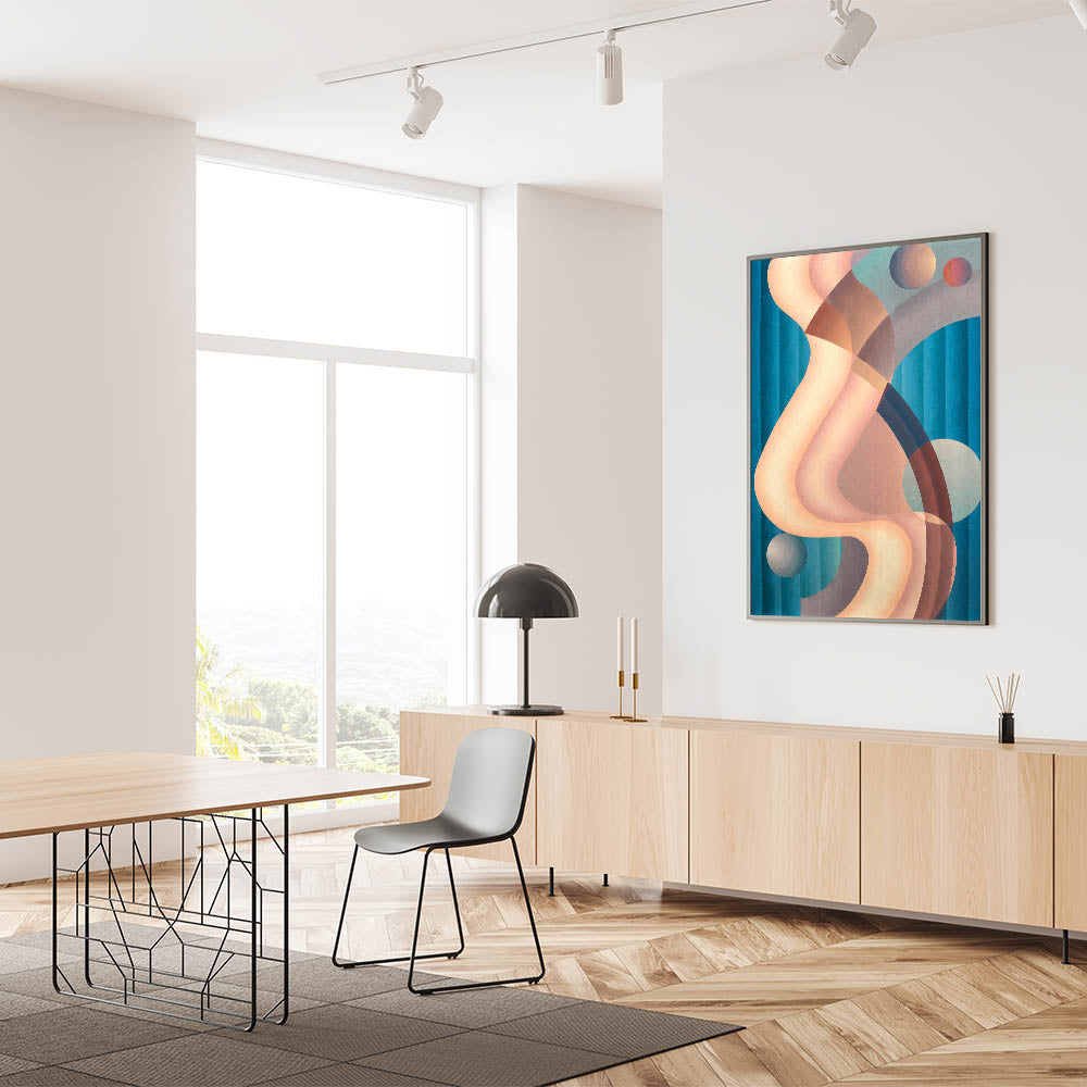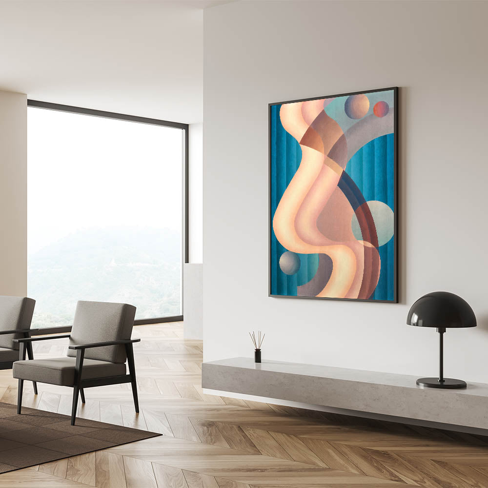 Elevate your home decor with this Modern Wall Art featuring a geometric abstract composition in calming blues and soft pastel hues. The interplay of curved and linear forms creates a dynamic yet harmonious visual experience, making it a perfect addition to Trendy Home Décor. This artwork blends vibrant colors with a minimalist approach, embodying the essence of Contemporary Art Pieces.