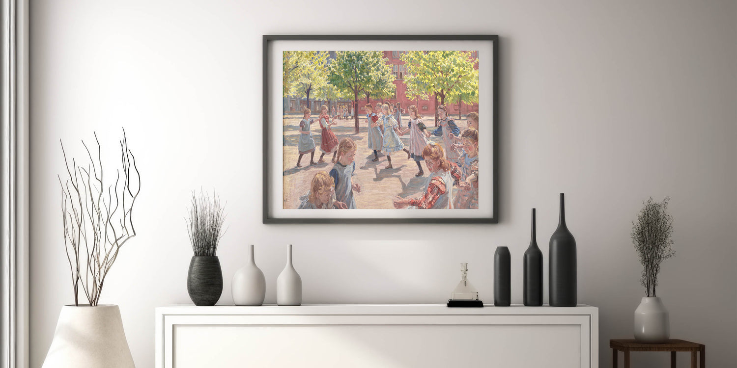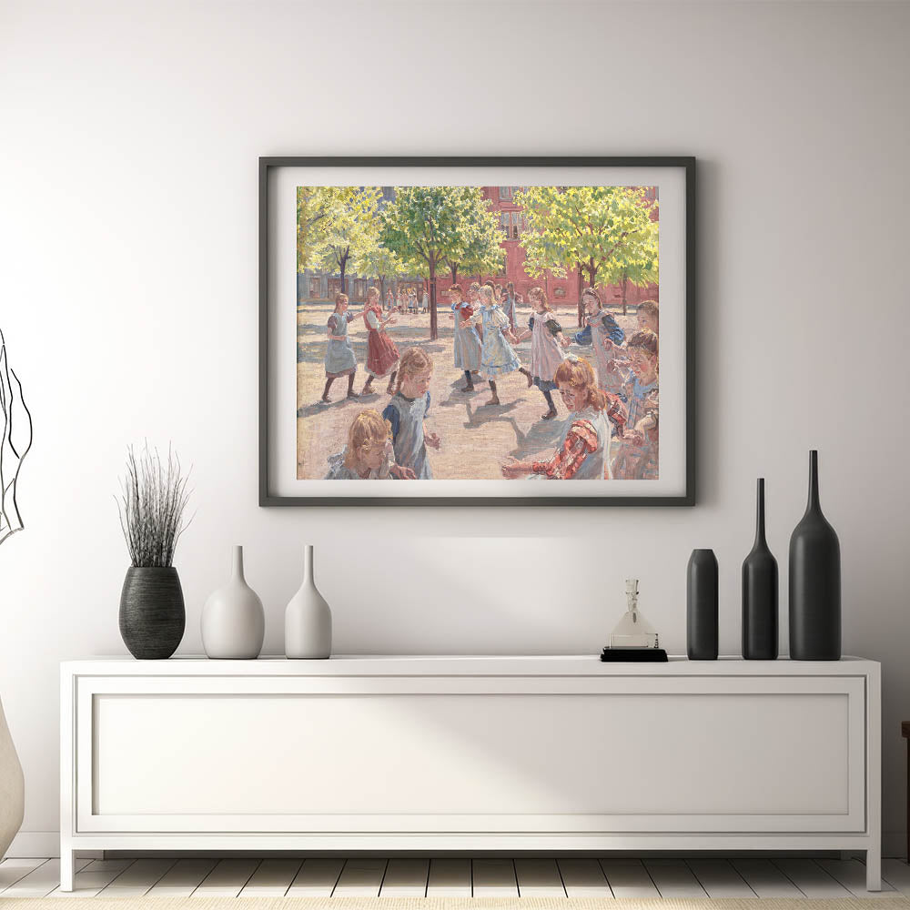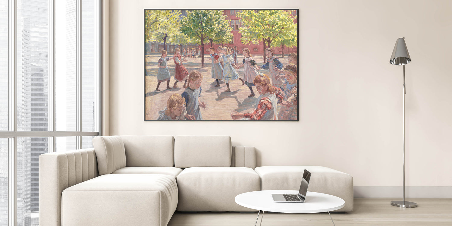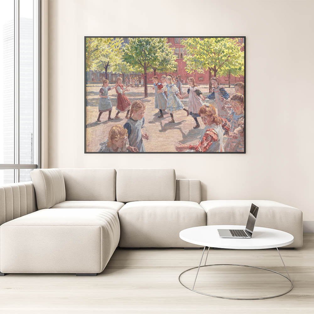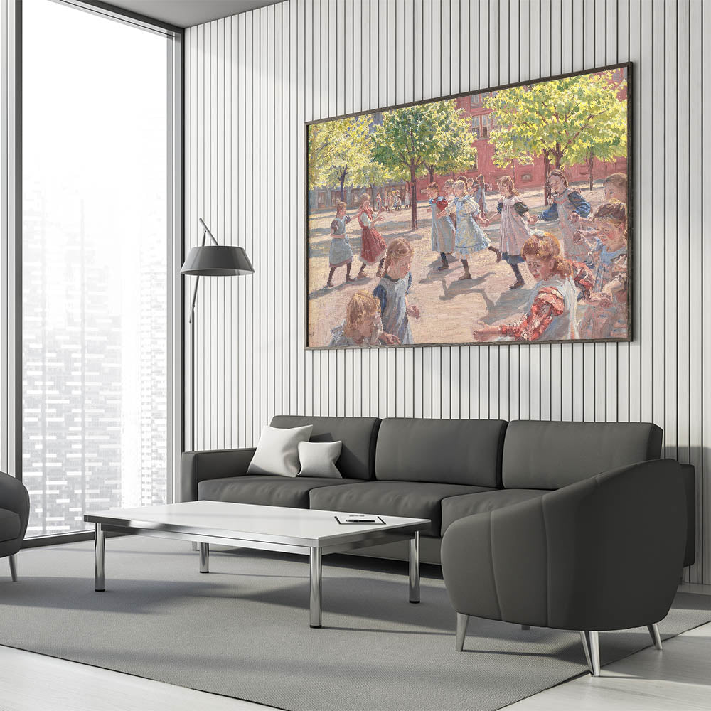 Bring a sense of joy and nostalgia into your home with this modern wall art, inspired by Peter Hansen's Playing Children, Meadow Square. Depicting children at play beneath lush green trees in a sunny meadow, this artwork captures the vibrancy of youth and the charm of outdoor gatherings. The warm palette of soft yellows, greens, and earthy reds blends beautifully, making it a delightful addition to any space. Perfect for those who love contemporary art pieces with a touch of timeless warmth.