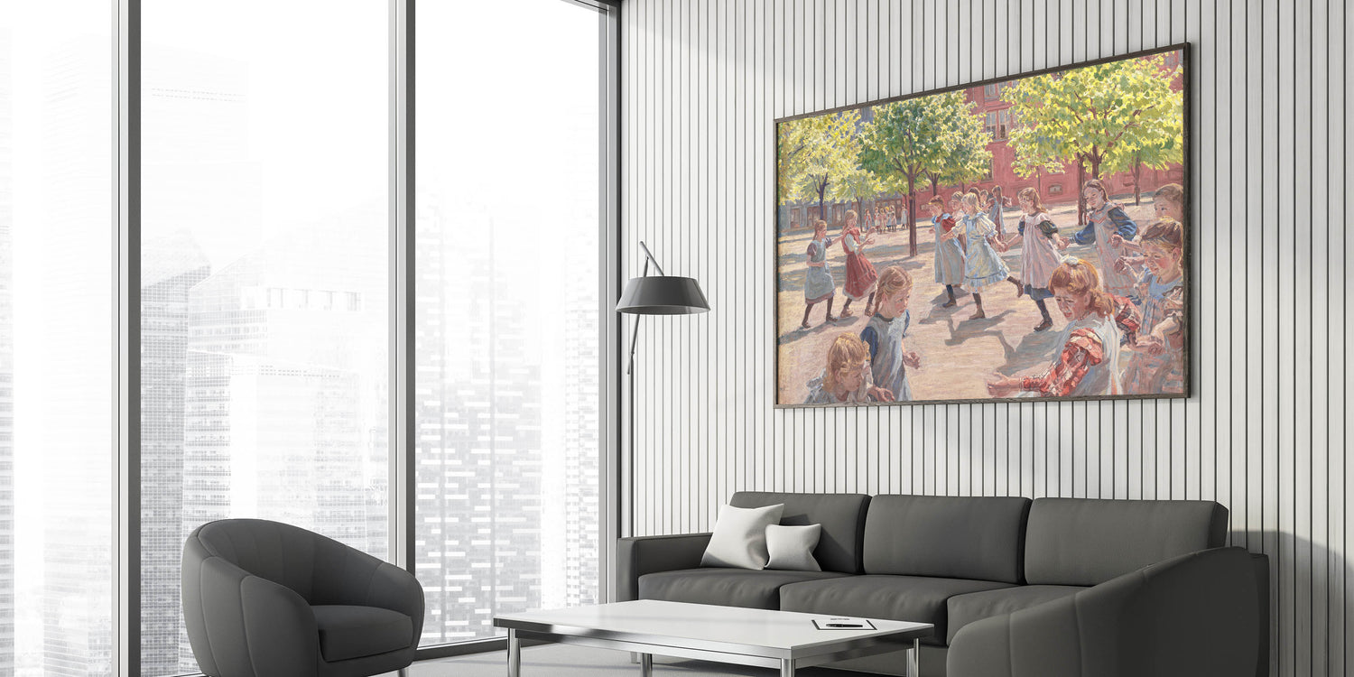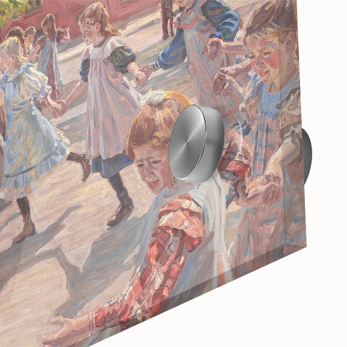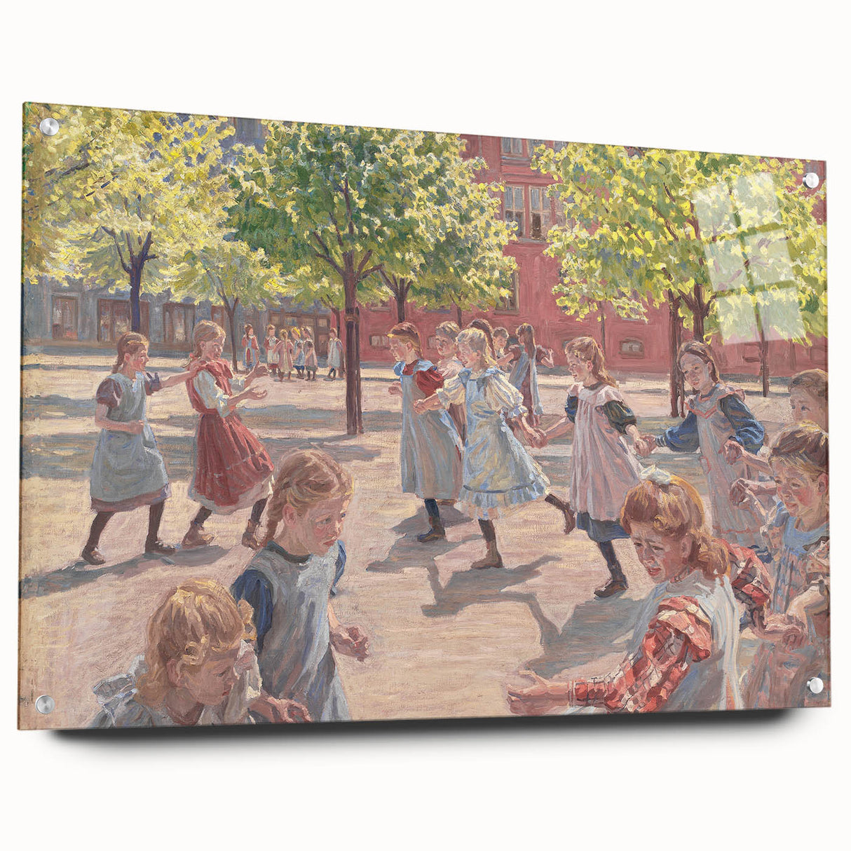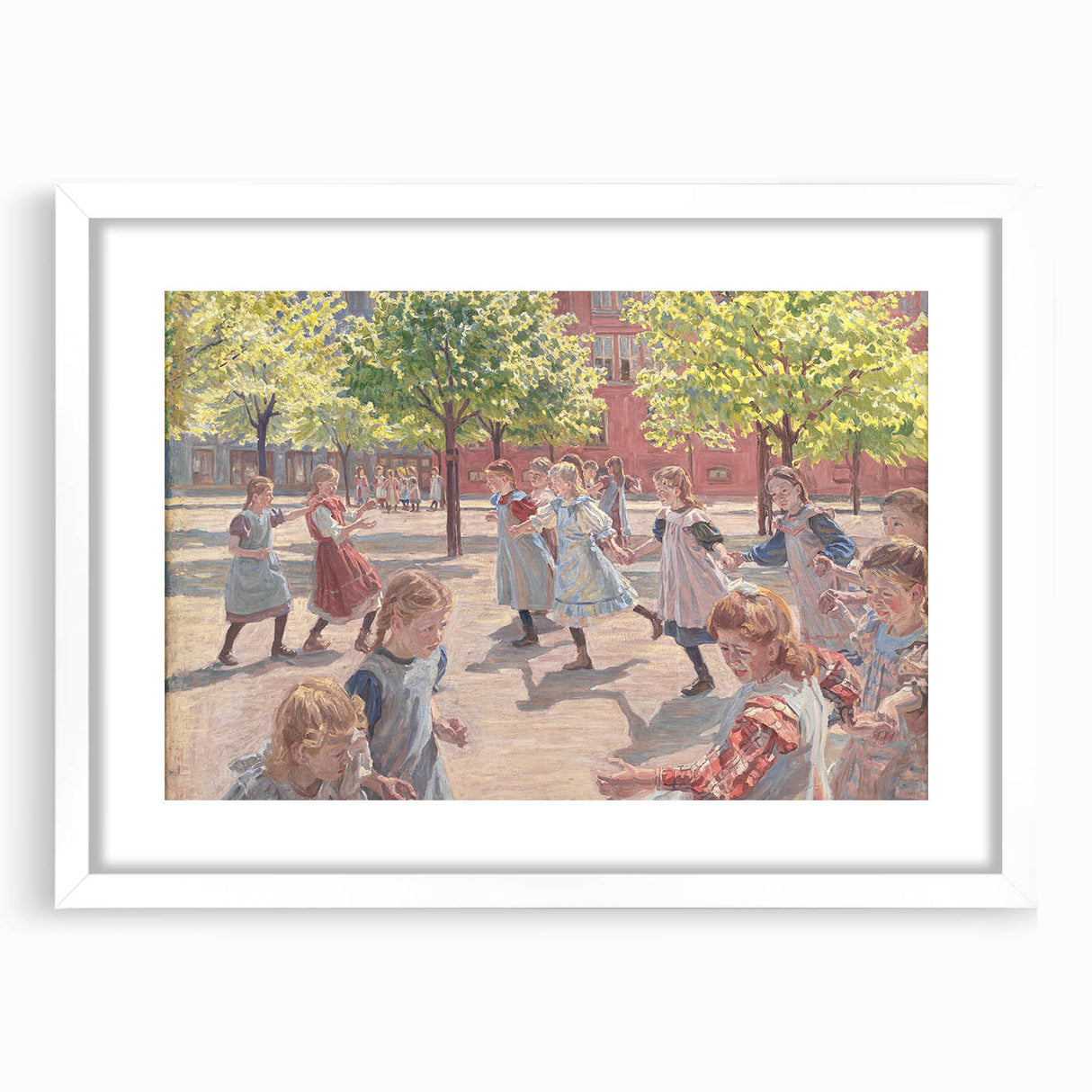 Bring a sense of joy and nostalgia into your home with this modern wall art, inspired by Peter Hansen's Playing Children, Meadow Square. Depicting children at play beneath lush green trees in a sunny meadow, this artwork captures the vibrancy of youth and the charm of outdoor gatherings. The warm palette of soft yellows, greens, and earthy reds blends beautifully, making it a delightful addition to any space. Perfect for those who love contemporary art pieces with a touch of timeless warmth.