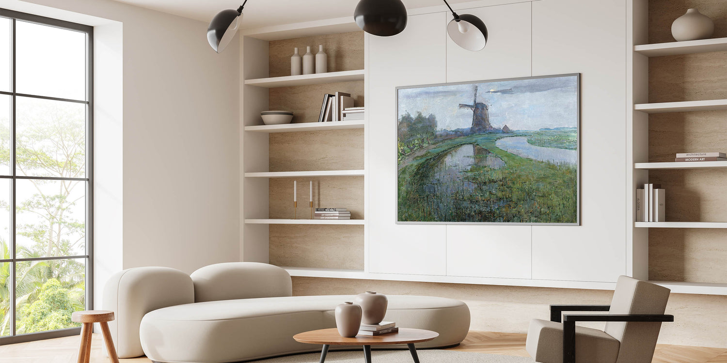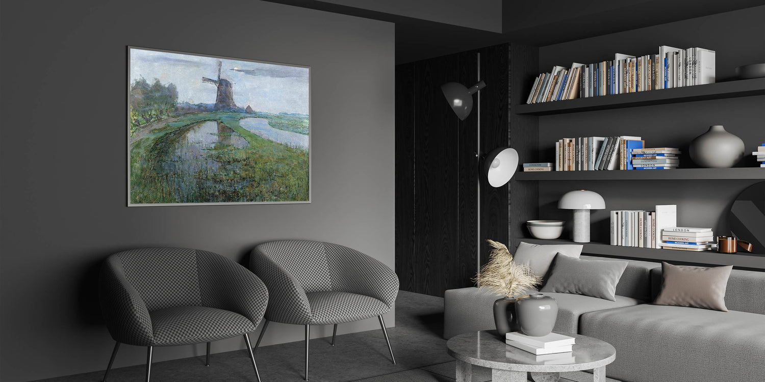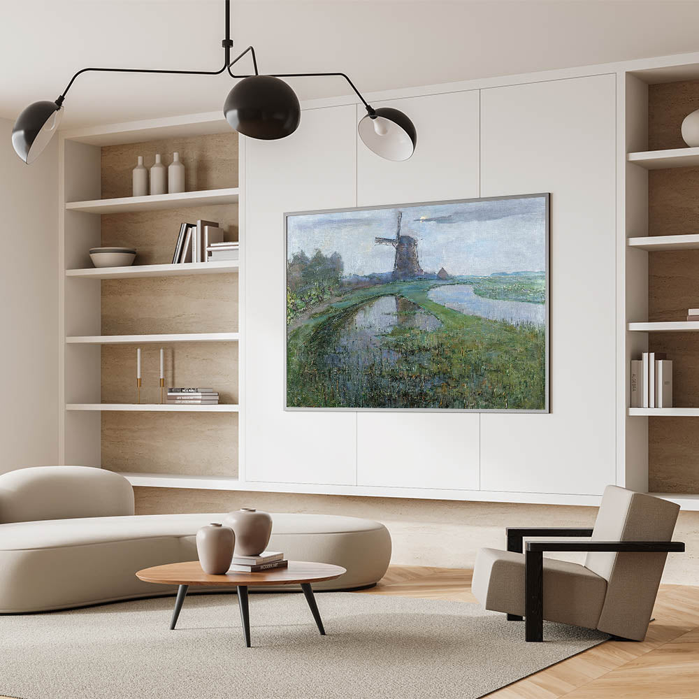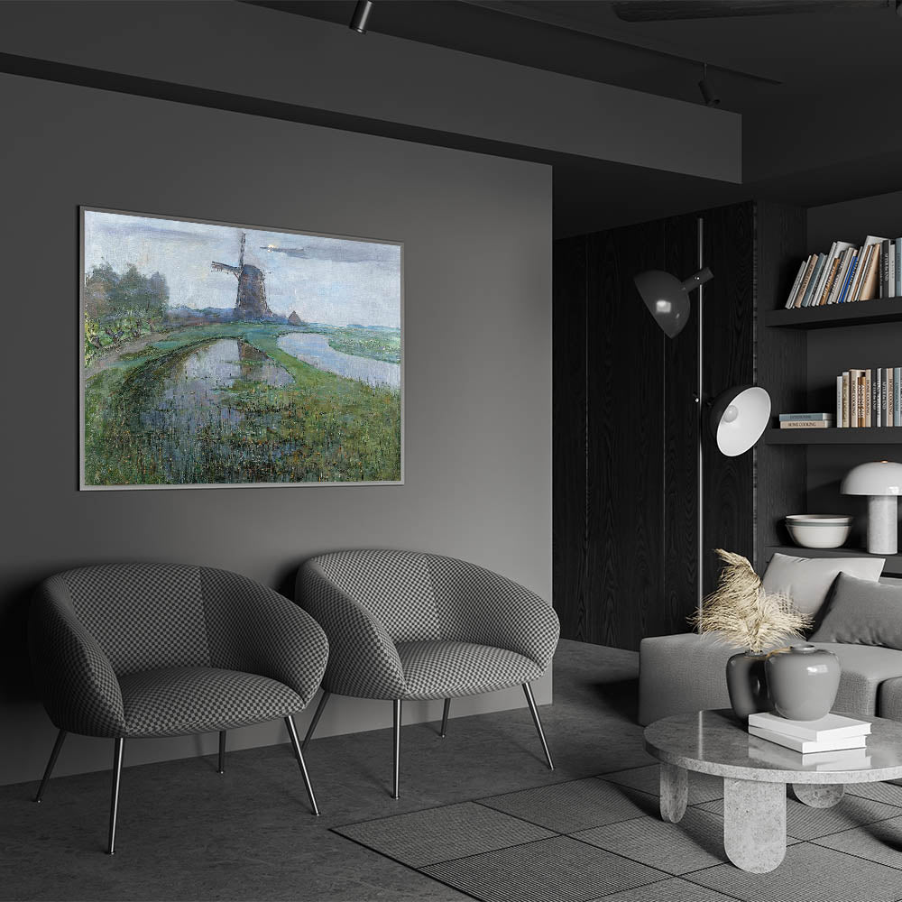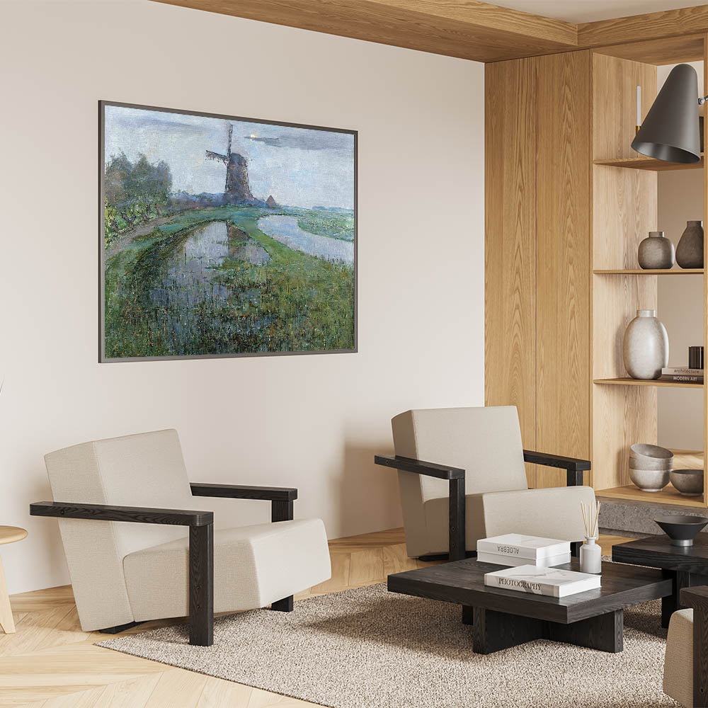 Elevate your space with this serene modern wall art inspired by Piet Mondrian's "Oostzijdse Mill along the River Gein by Moonlight." This captivating piece features a tranquil moonlit landscape, highlighted by a classic Dutch windmill and reflective waterways. The muted tones and intricate details offer a perfect blend of modern design elements and timeless artistry, making it ideal for trendy home decor enthusiasts.