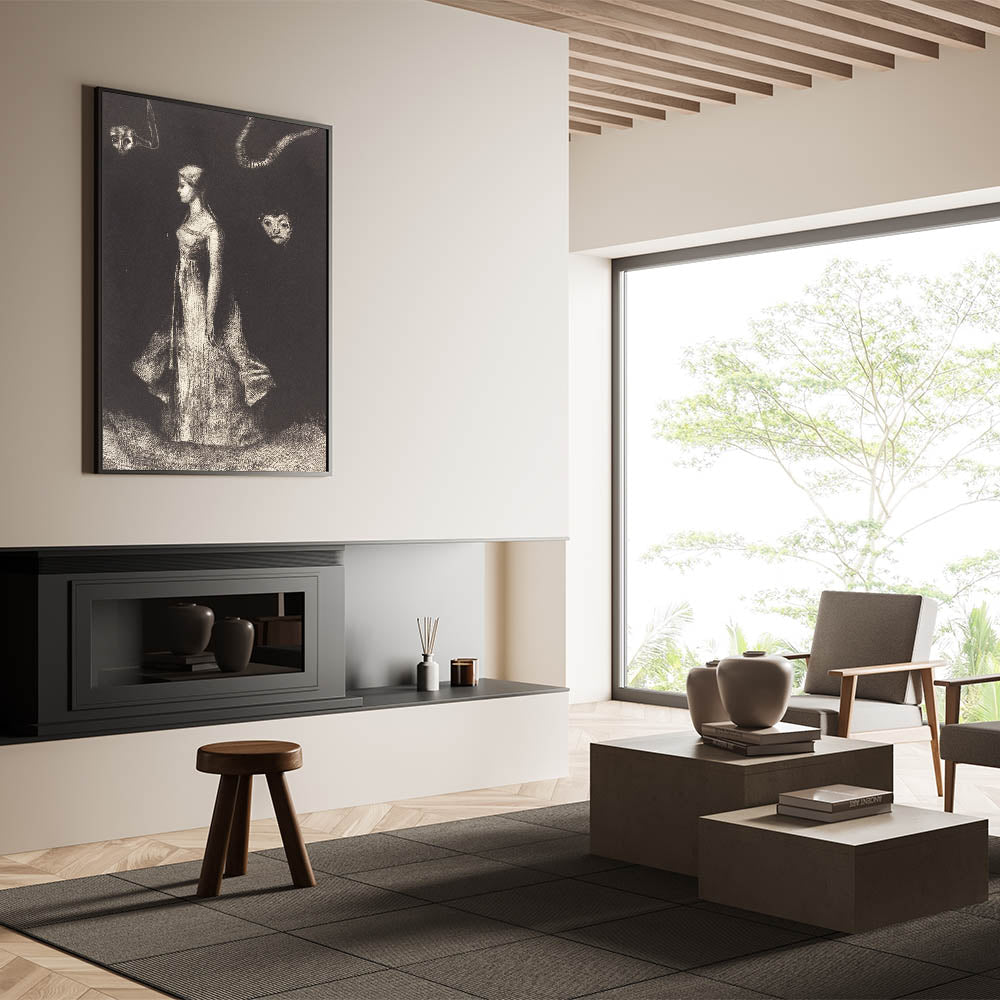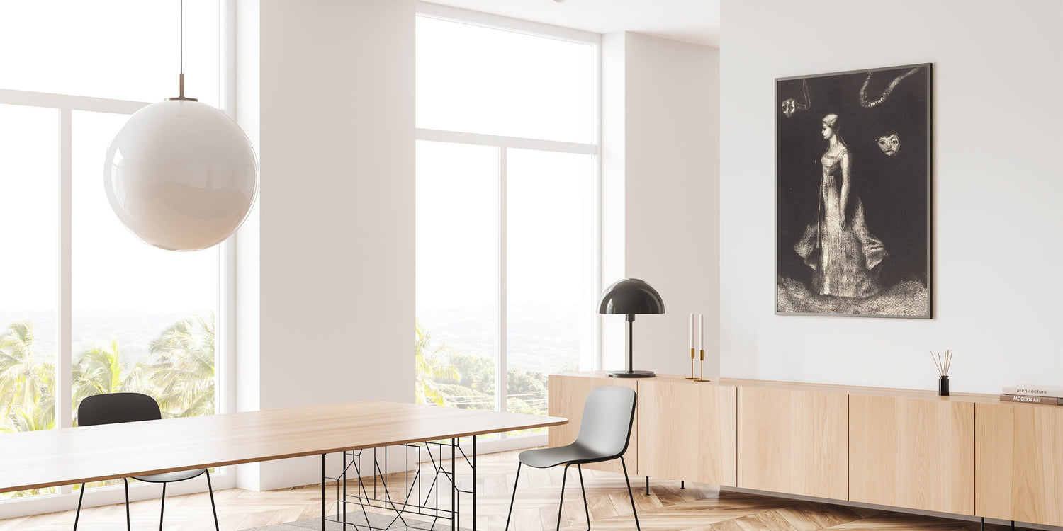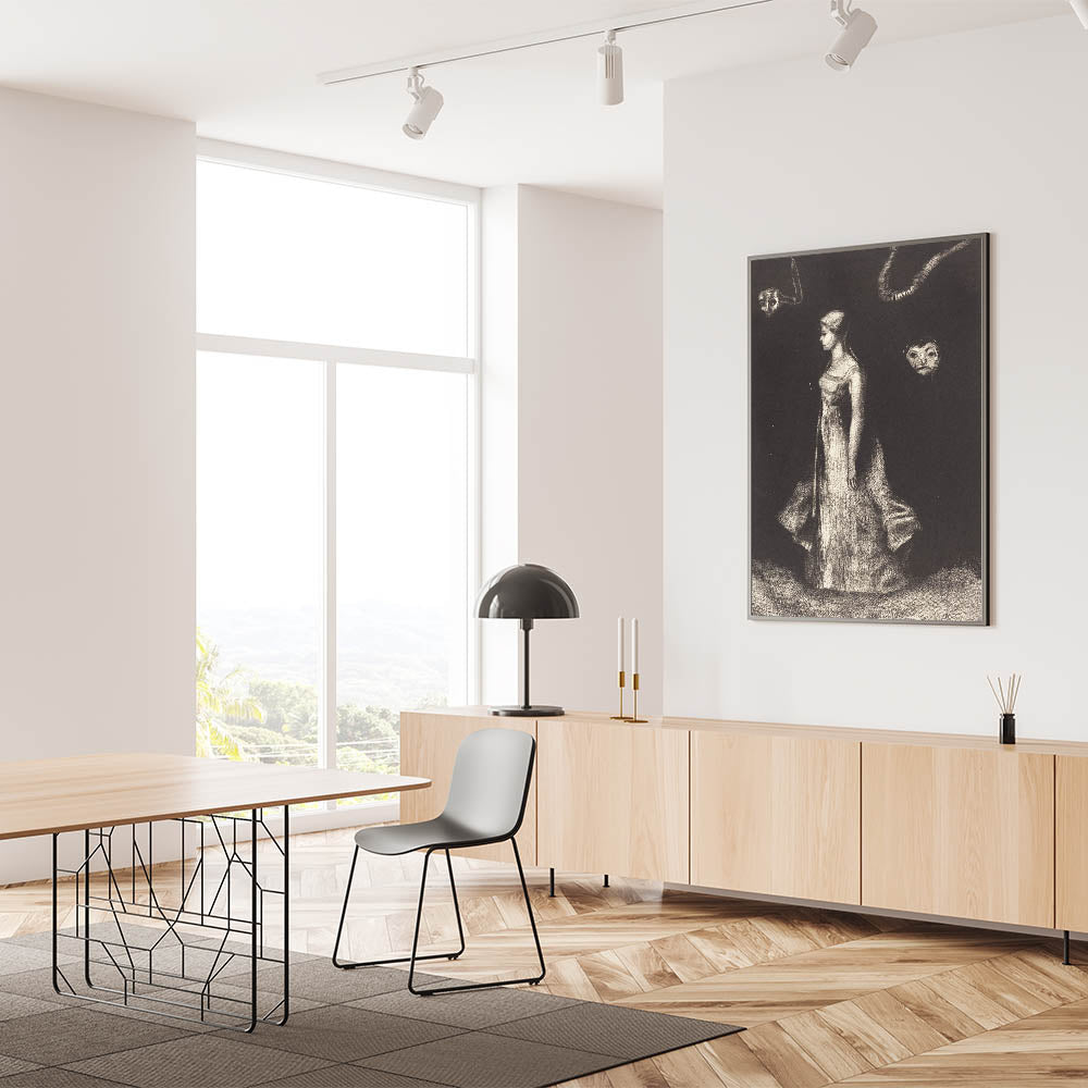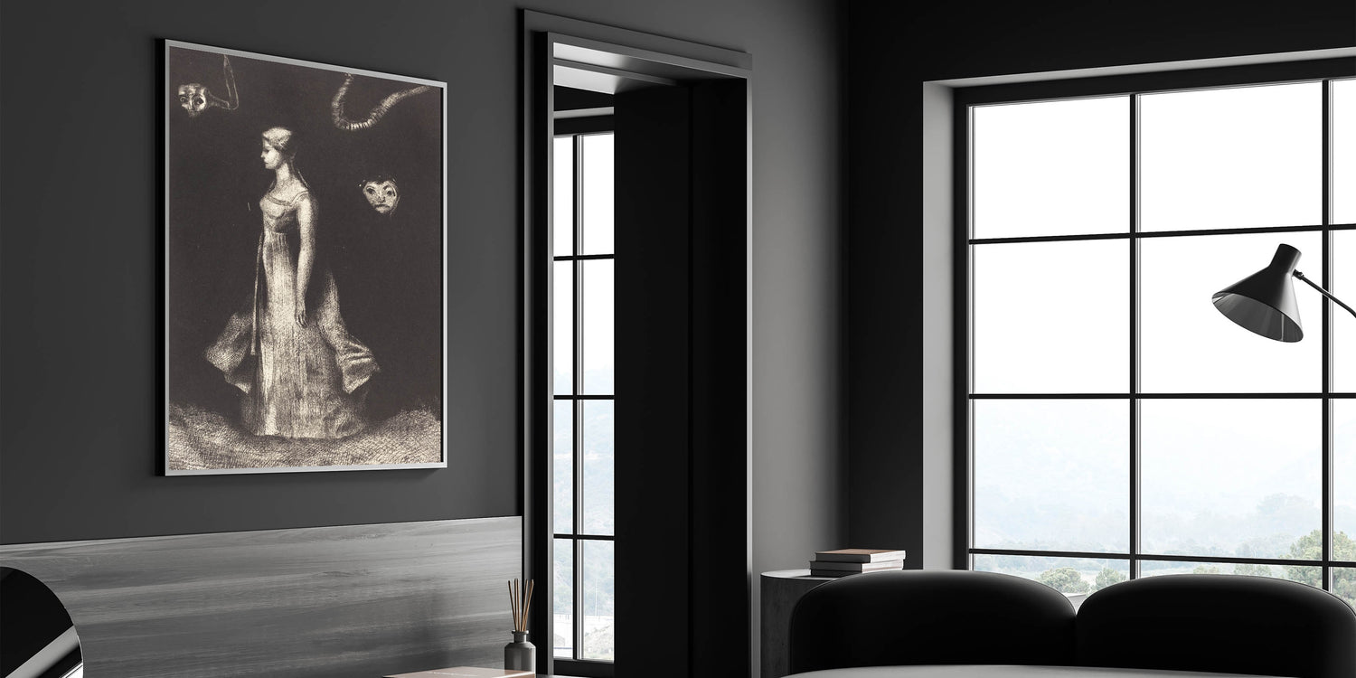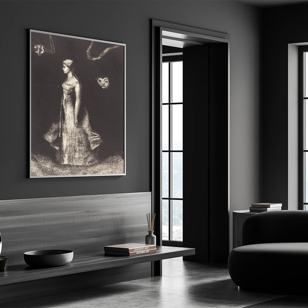 Bring an air of mystery and intrigue to your space with the "Obsession" Modern Wall Art. This haunting piece, inspired by Odilon Redon's 1894 work, features a surreal depiction of a figure surrounded by enigmatic shapes and faces in a stark monochrome palette. Perfect for those who love abstract modern art with a touch of the surreal.