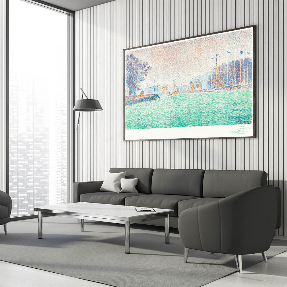Elevate your living space with this captivating Modern Wall Art piece, showcasing a serene waterfront scene rendered in an abstract, pointillist style. This artwork is a harmonious blend of soft pastels and vibrant accents, making it a perfect addition to any contemporary home.