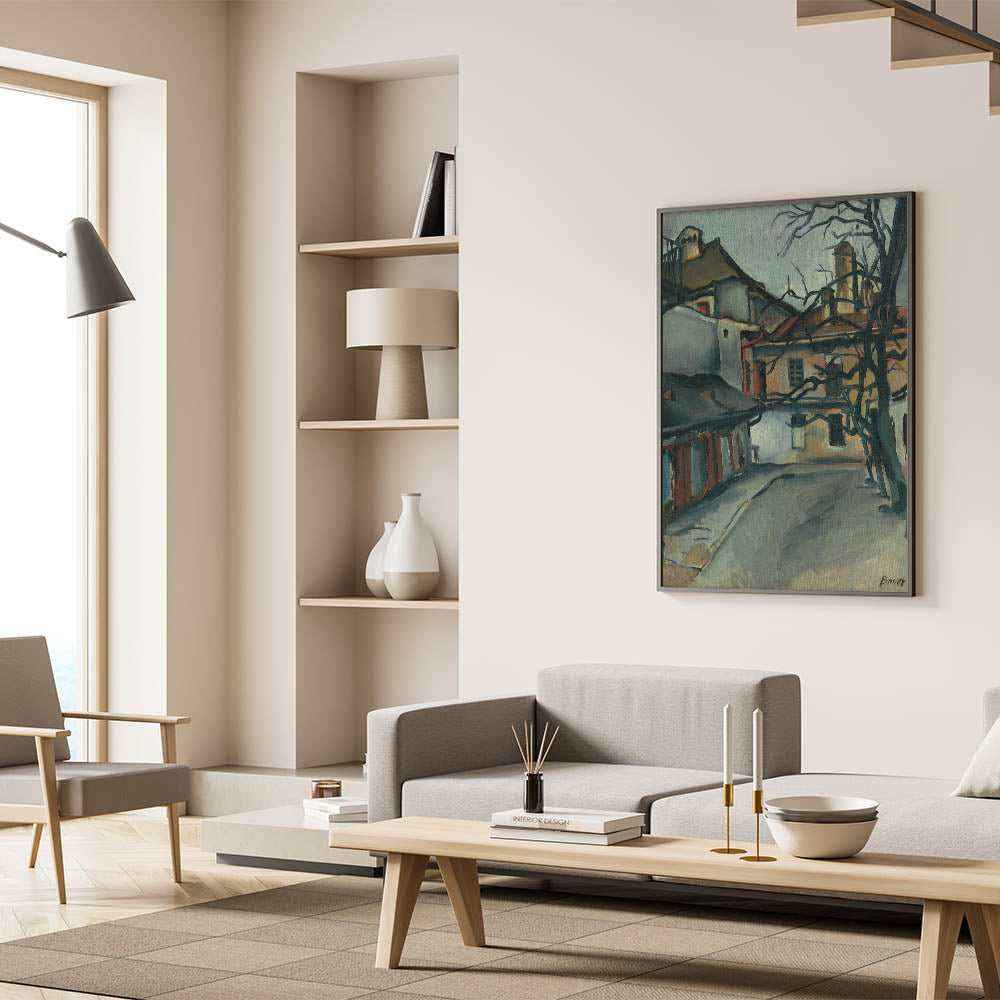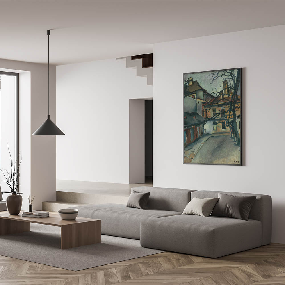 Bring a touch of historic charm to your space with the "Old Košice" Modern Wall Art. Inspired by Konštantín Bauer’s evocative depiction of Old Košice in 1929, this artwork captures the quiet streets and architecture of a bygone era. The muted tones and expressive brushwork create a moody yet timeless atmosphere, perfect for modern design enthusiasts who appreciate historical landscapes.