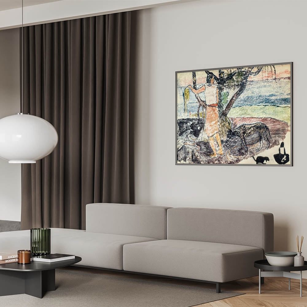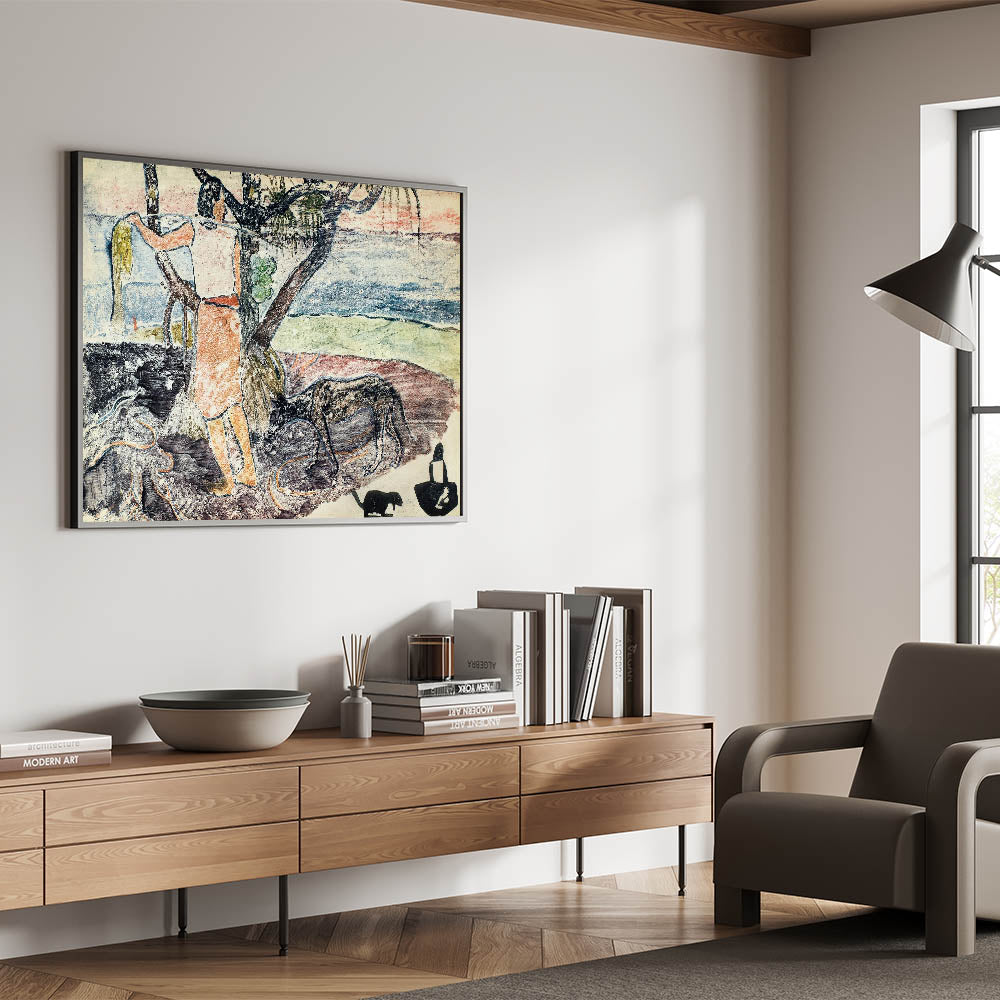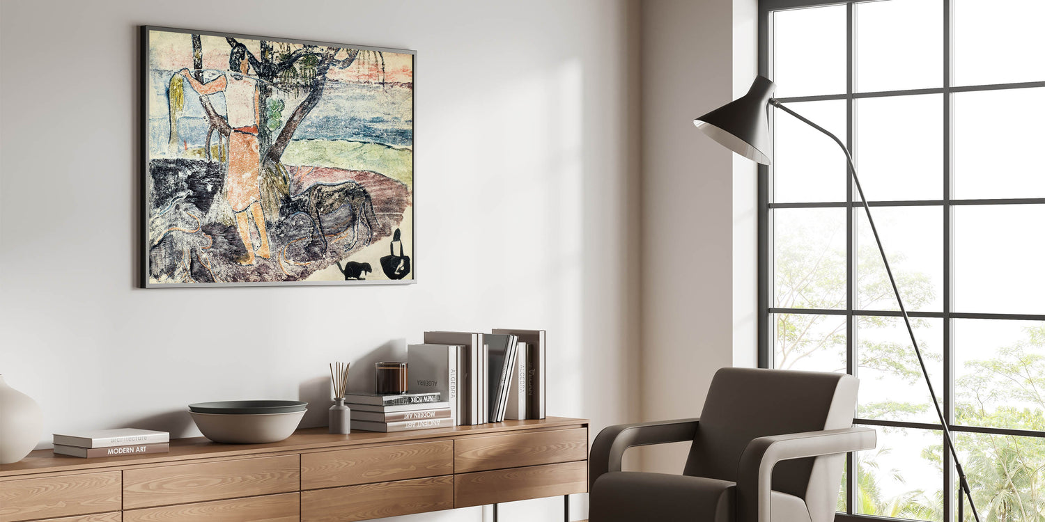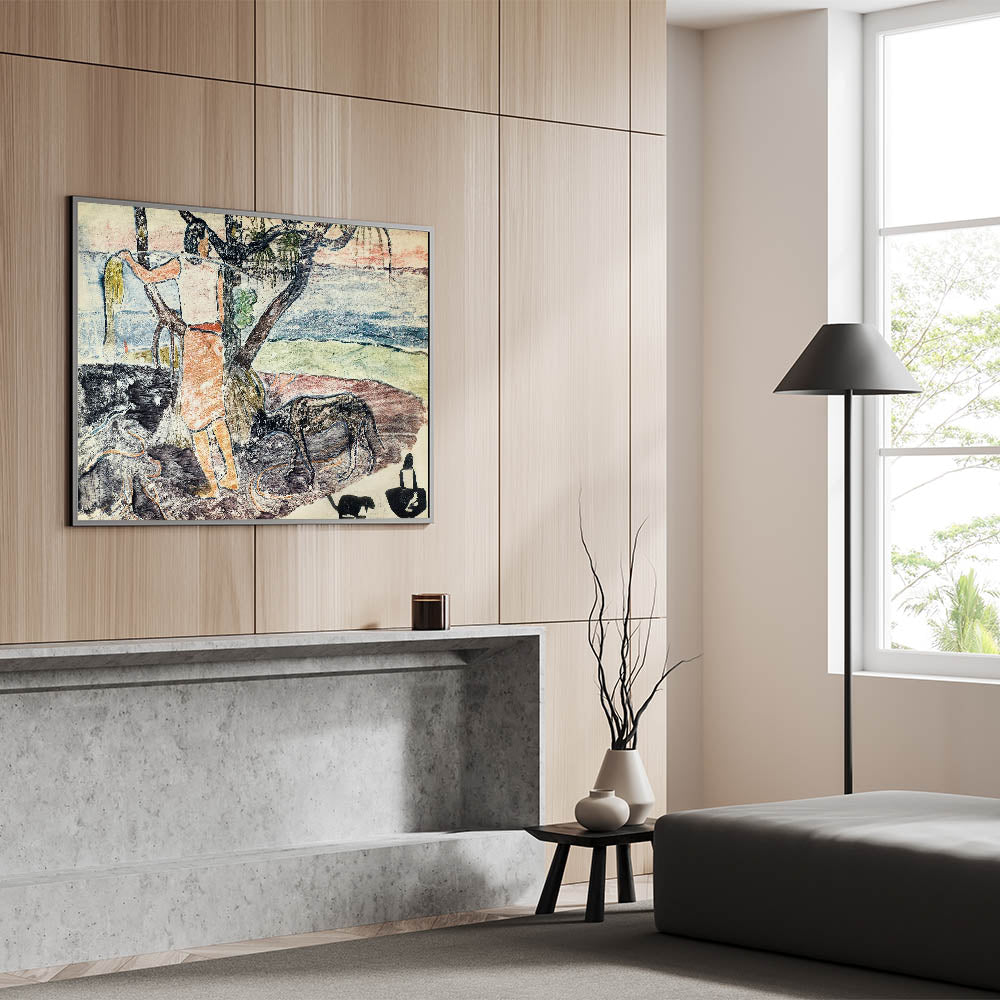 Bring the spirit of exotic exploration into your home with this modern wall art, inspired by Paul Gauguin’s Noa Noa, Voyage de Tahiti (1926). This captivating composition blends soft pastel tones with rustic textures to depict a serene tropical scene. A figure interacts with nature, surrounded by lush foliage, tranquil waters, and symbolic animals. Gauguin's unique artistic style combines simplicity with profound emotion, making this piece perfect for lovers of contemporary art with a narrative touch.