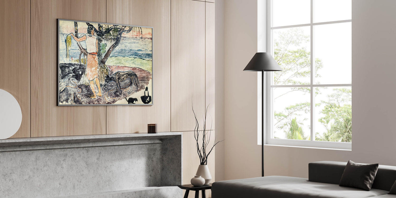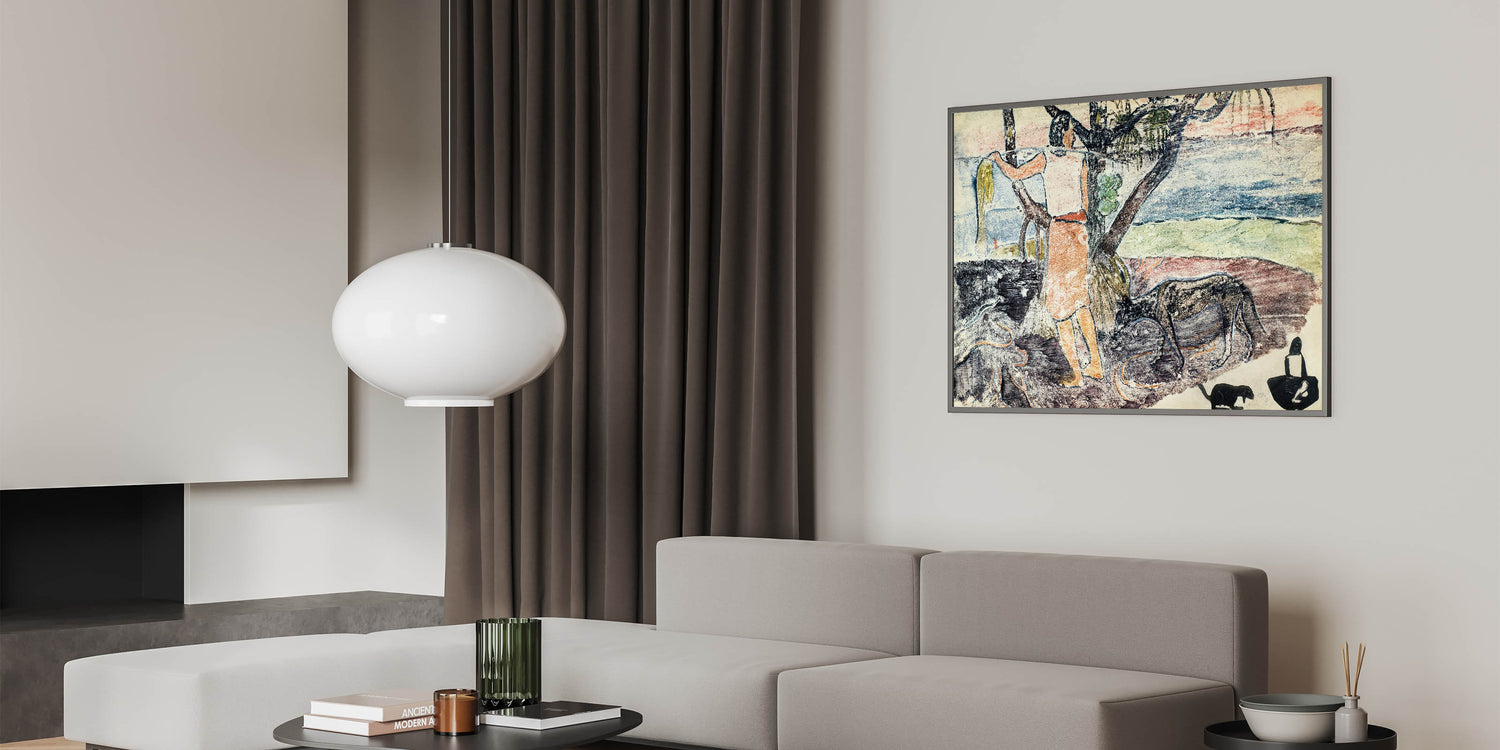 This unique modern art invites viewers to experience the mystique of Tahiti through Gauguin's lens. Its soothing palette of blues, greens, and earthy tones makes it a versatile addition to trendy home decor. Let this stylish wall art bring a sense of culture and wanderlust into your home.