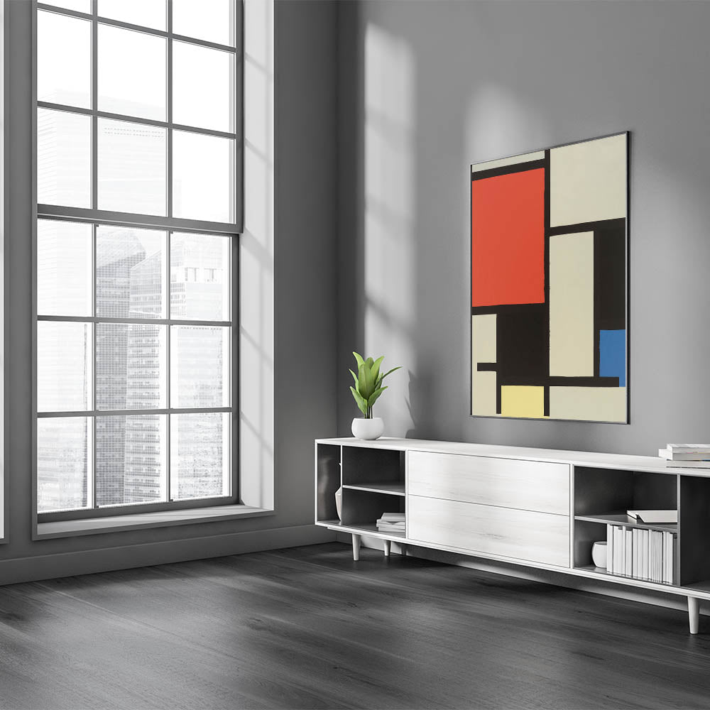 Add a touch of timeless sophistication to your space with Modern Wall Art, featuring Piet Mondrian’s iconic "Composition" from 1921. This bold geometric design harmonizes vibrant red, blue, yellow, and stark black lines with a minimalist aesthetic. A masterpiece of the De Stijl movement, this artwork exemplifies abstract modern art and is perfect for creating a striking focal point in your home or office.