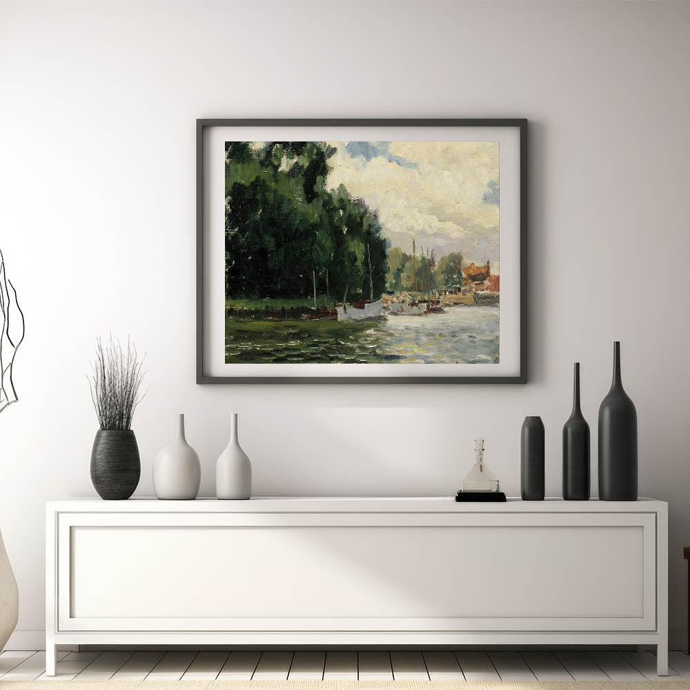 Enhance your living space with the serene beauty of Richmond, Thames by Alfred William Finch. This picturesque artwork captures a peaceful riverside scene with lush greenery, tranquil waters, and moored boats. Finch’s impressionistic strokes bring the scene to life, making it a perfect addition to modern and classic interiors alike.