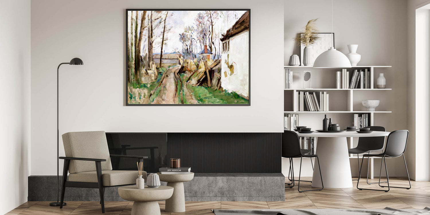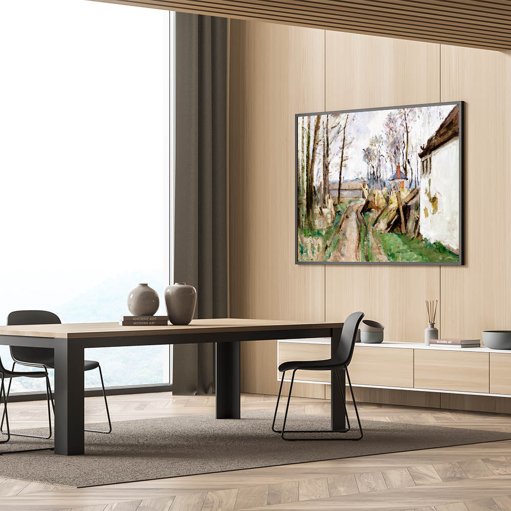 Bring the charm of the countryside into your home with this Modern Wall Art, depicting a serene village road framed by lush greenery and rustic buildings. The soft brushstrokes and warm tones capture the simplicity and beauty of rural life, making it a perfect addition to Trendy Home Décor. The harmonious blend of greens, browns, and blues adds a natural elegance to any space.