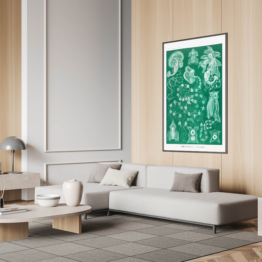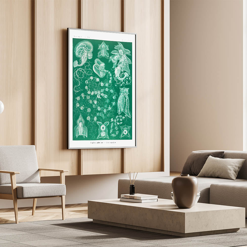 Transform your walls with the breathtaking "Siphonophorae Study" Modern Wall Art. Featuring Ernst Haeckel's intricate depiction of siphonophores, this artwork showcases delicate marine life in stunning detail. The vibrant green background and fine white illustrations make this piece a perfect blend of modern design elements and nature-inspired artistry.