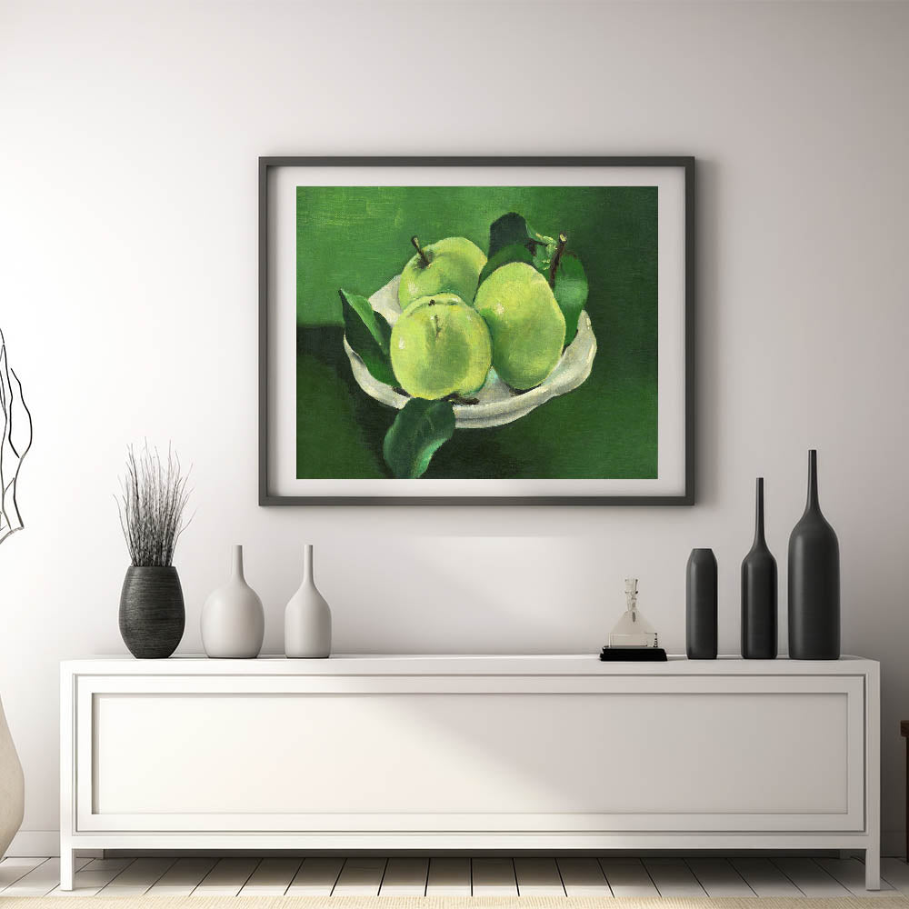Bring a refreshing pop of color to your home with this Modern Wall Art, featuring a vibrant still life of green apples in a bowl. The rich green palette dominates the composition, creating a harmonious and visually striking effect. The smooth brushstrokes and attention to detail evoke a sense of simplicity and elegance, making it a perfect addition to Trendy Home Décor.