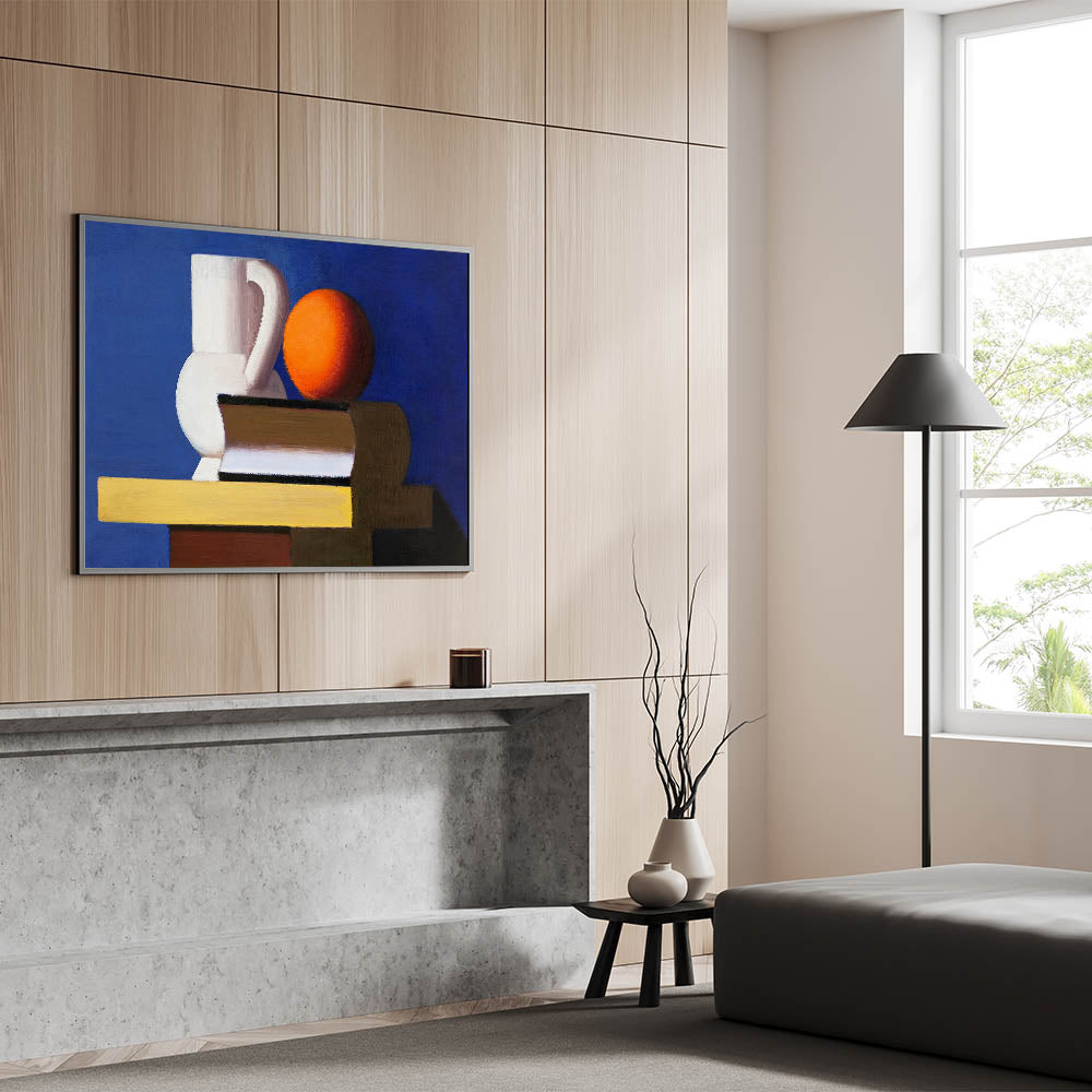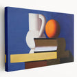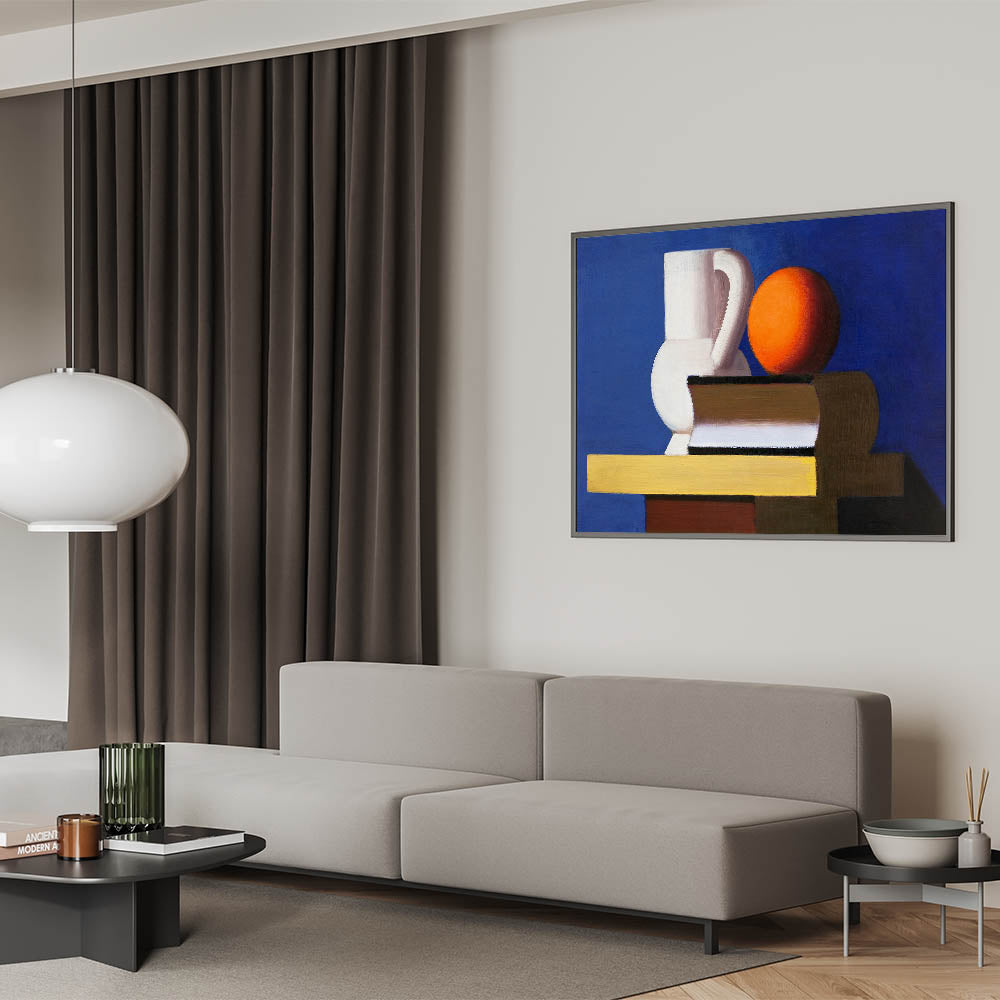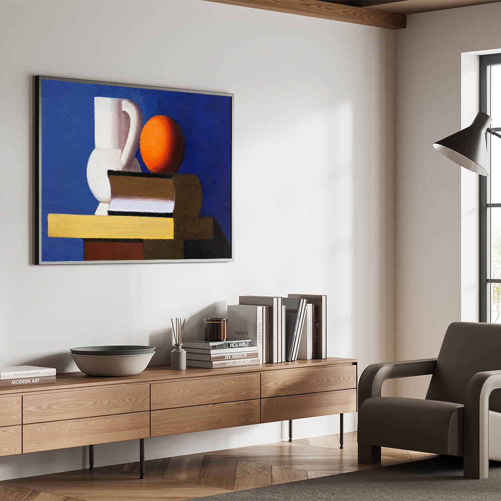 Brighten up your space with this Modern Wall Art, a striking still life featuring a white jug, a vibrant orange, and stacked books against a deep blue background. The bold color contrasts and clean geometric shapes create a visually captivating composition, perfect for Trendy Home Décor. This artwork celebrates the beauty of simplicity while adding a contemporary touch to your living space.